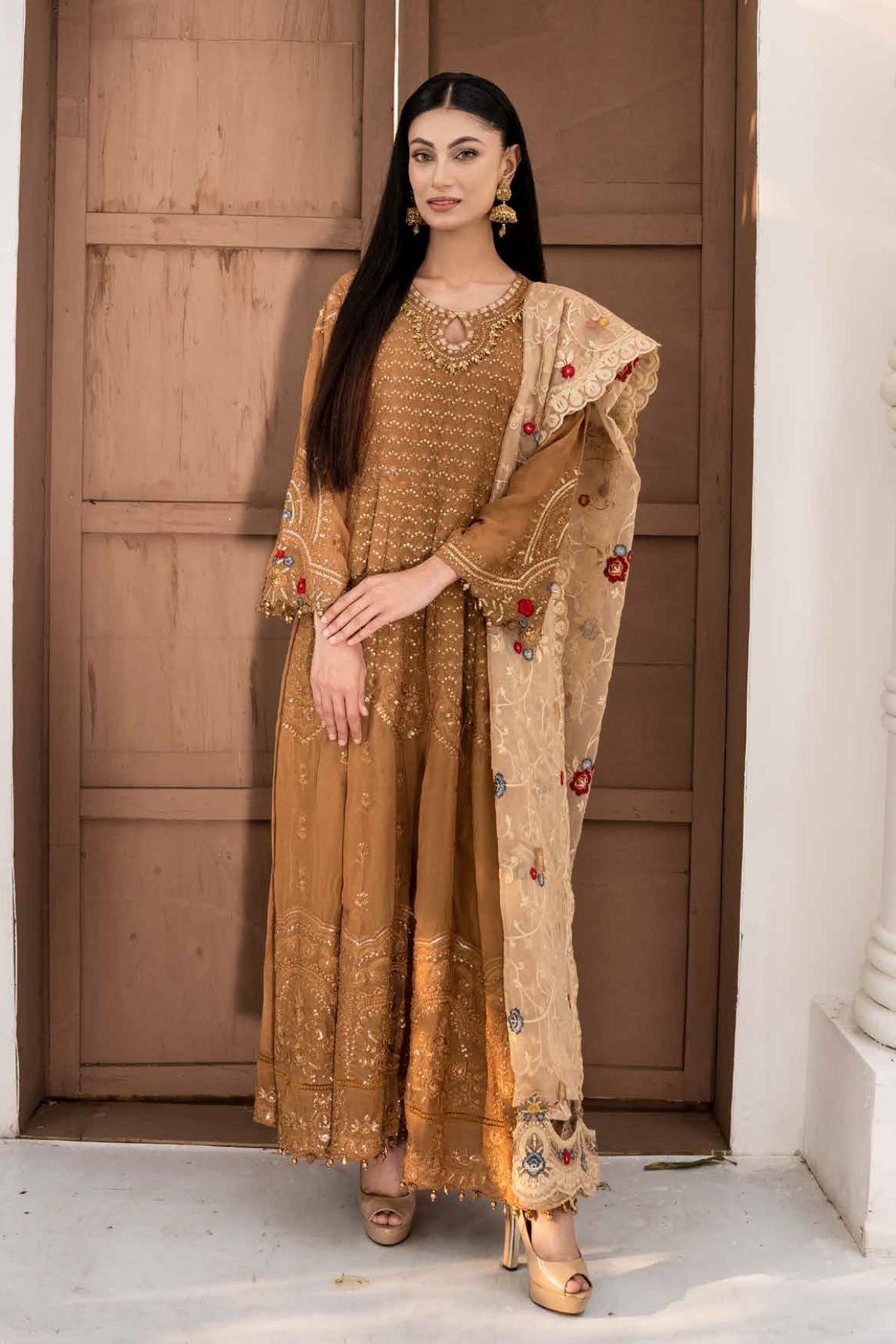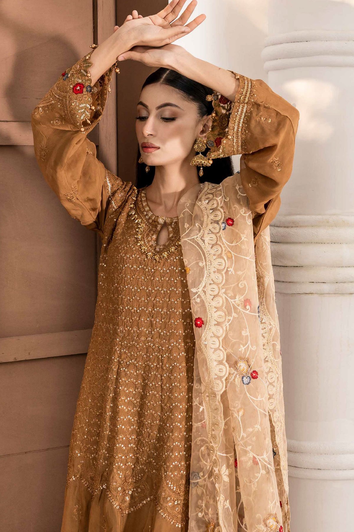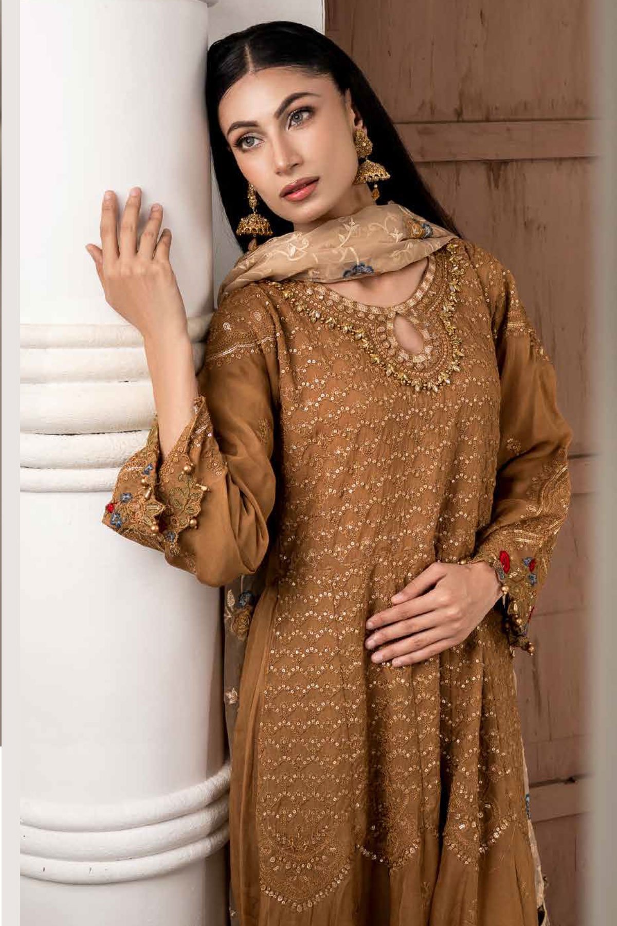 This beautiful 3 piece Maria b party wear collection features a long dress with thread work embroidery throughout, finished with full length embroidered sleeves. It comes with straight leg crepe trousers and the look is finished with a contrasted embroidered organza dupatta.