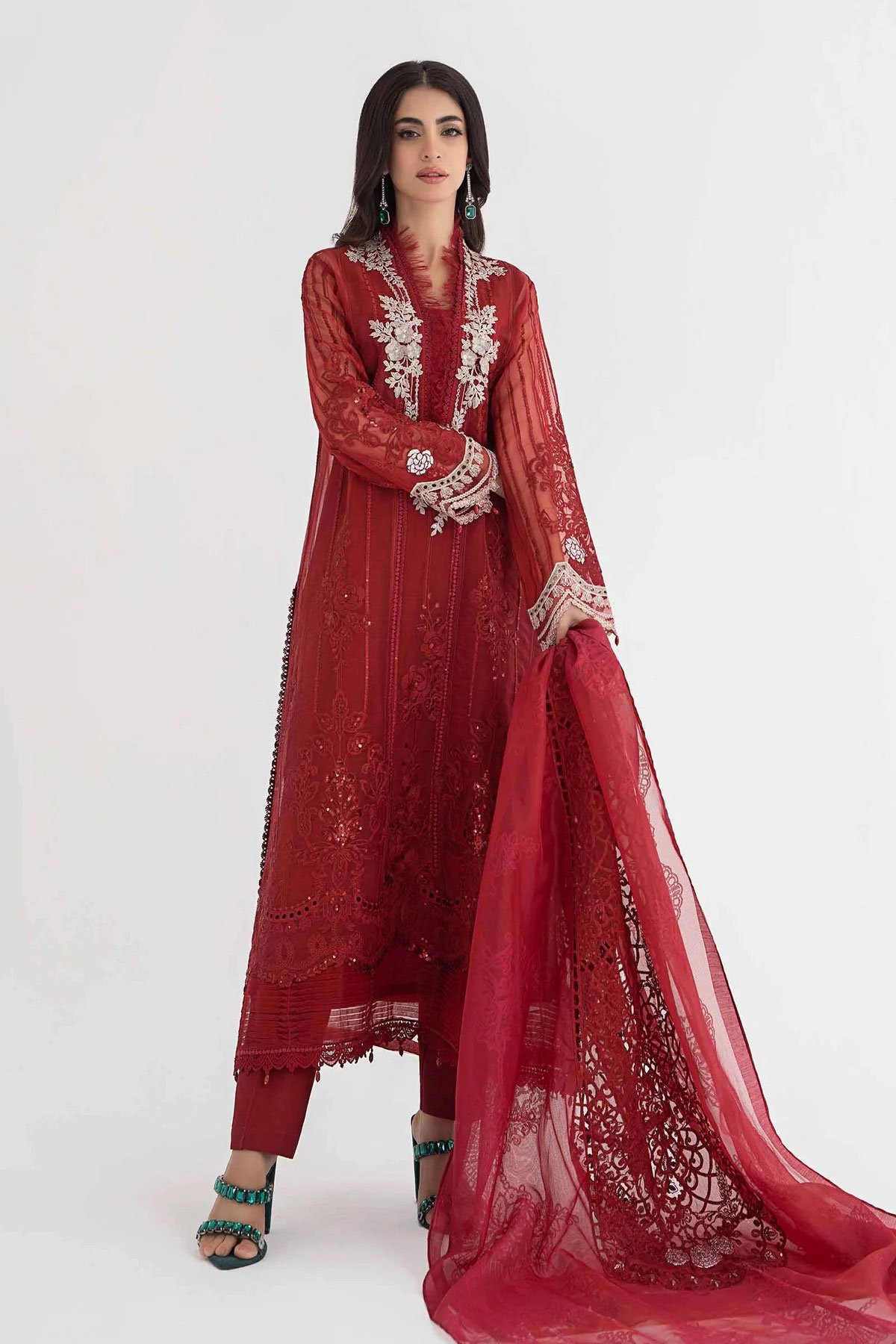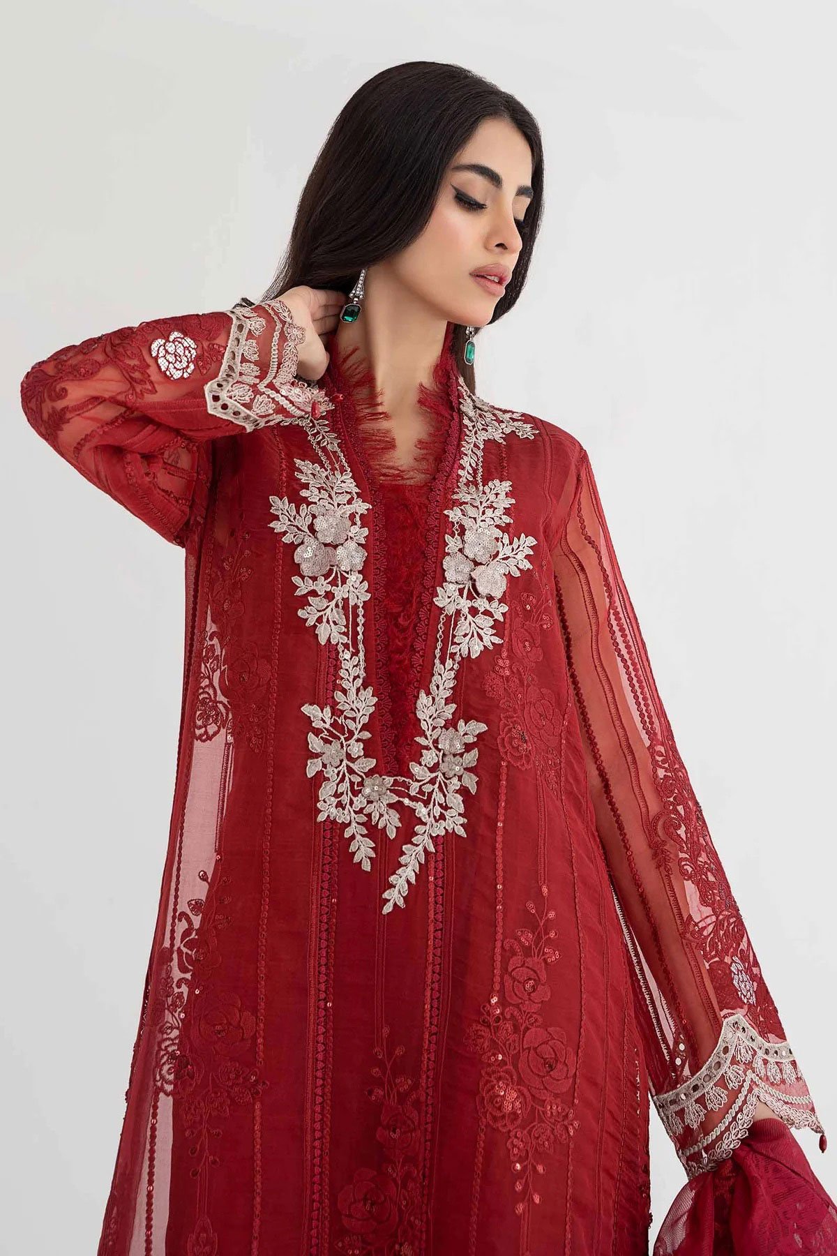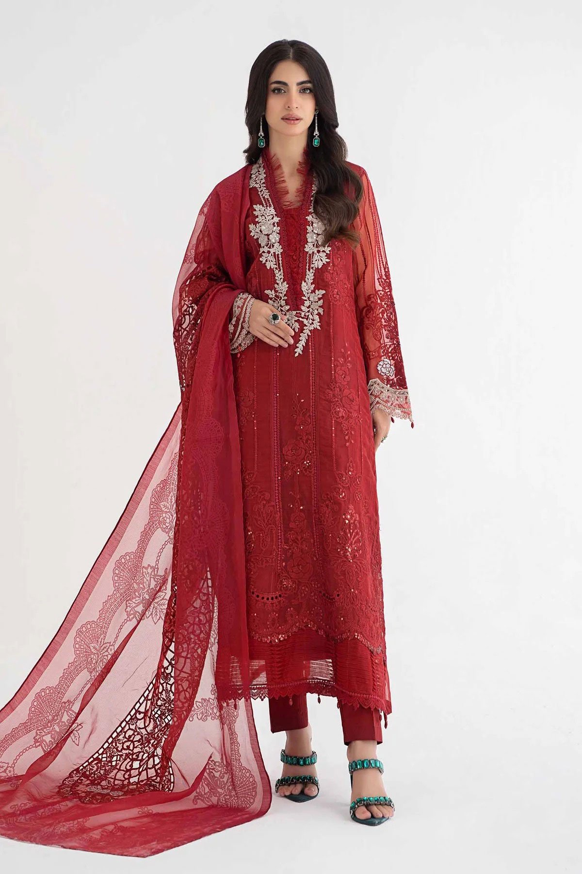 This beautiful 3 piece Maria b inspired suit features a straight shirt with luxury thread work embroidered front along with an organza patched neckline, finished with dangling beads from the border and full length embroidered sleeves. It comes with straight leg plain trousers and the look is finished with an organza dupatta.