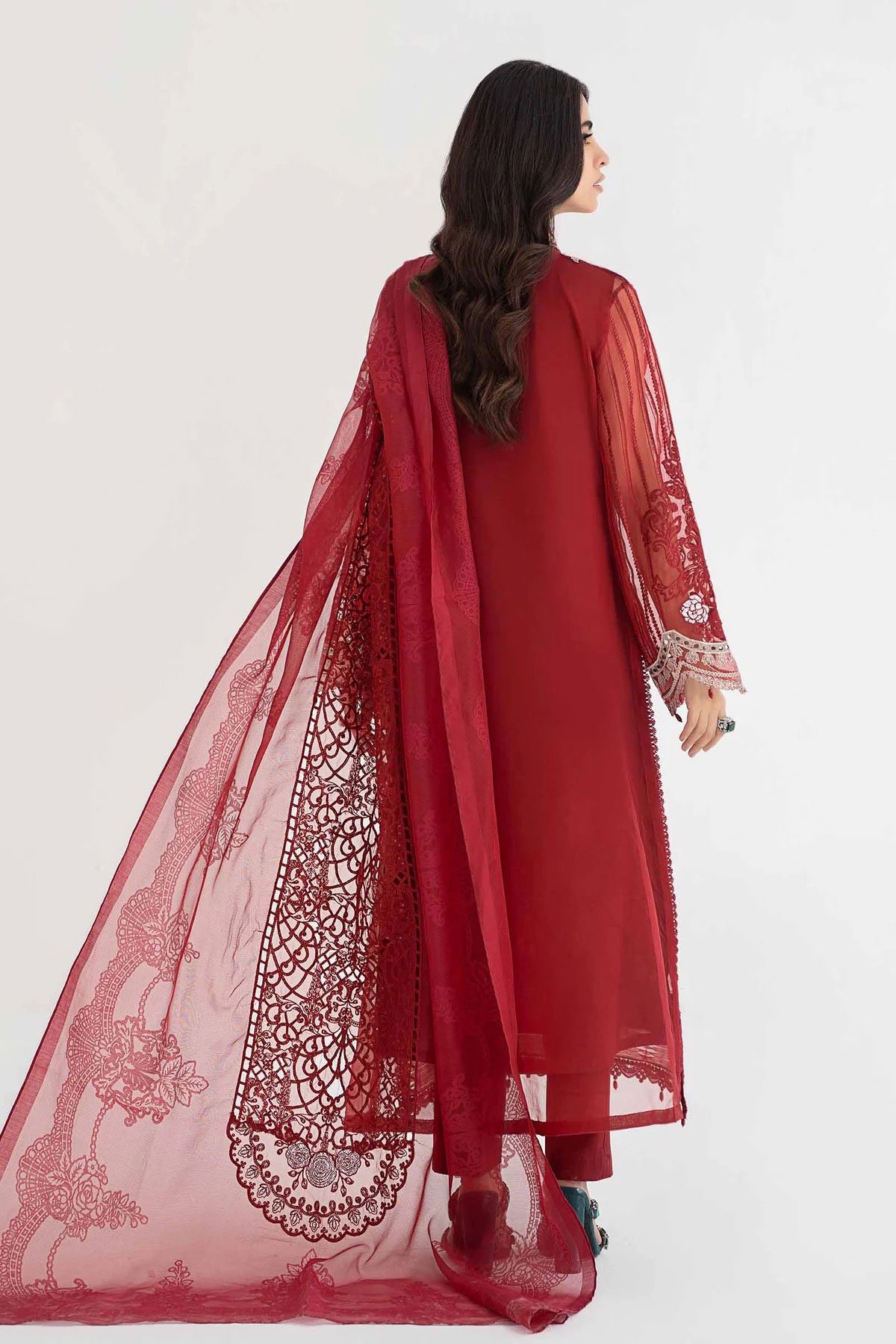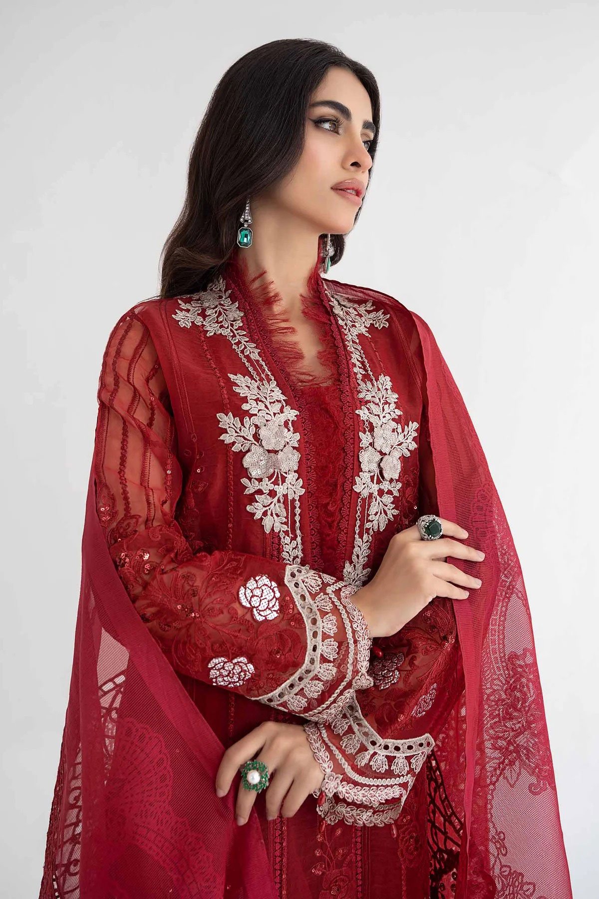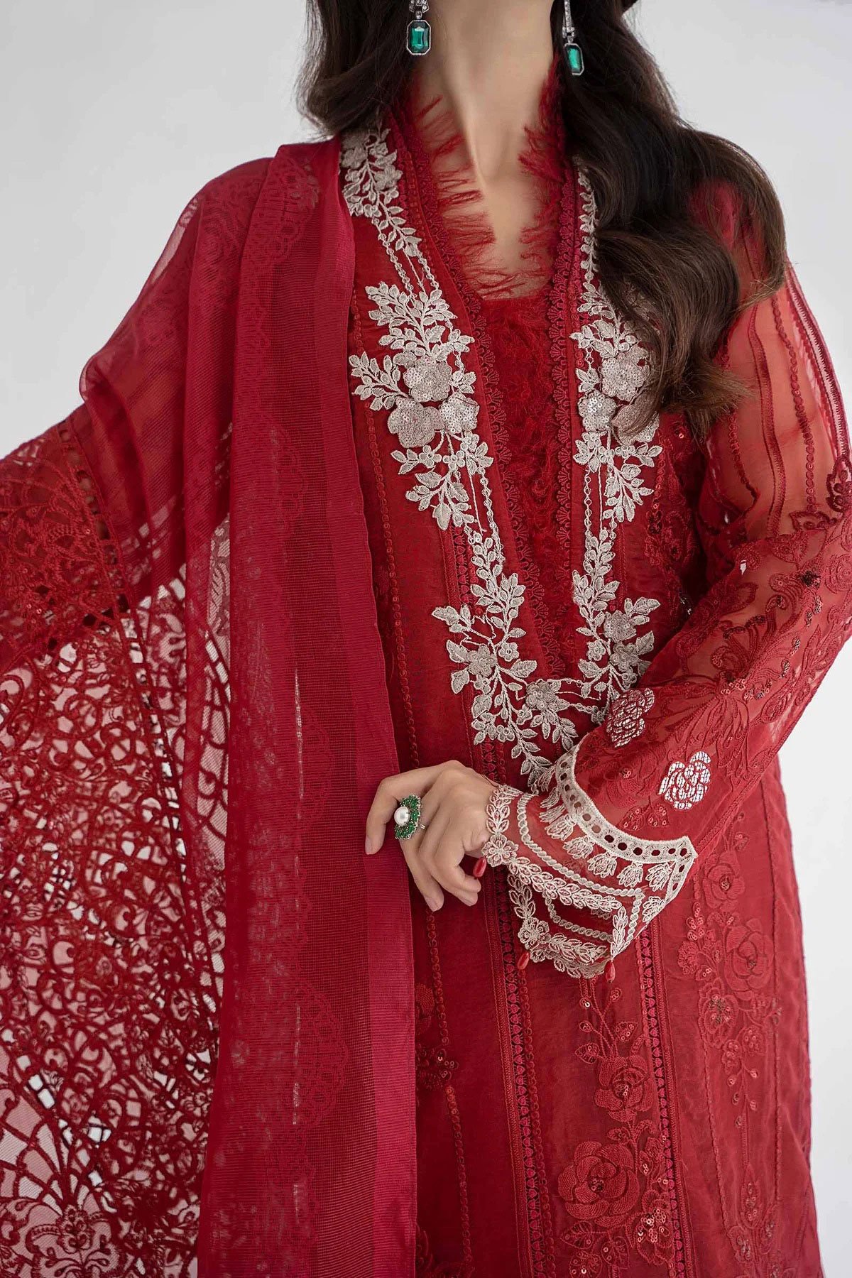 This beautiful 3 piece Maria b inspired suit features a straight shirt with luxury thread work embroidered front along with an organza patched neckline, finished with dangling beads from the border and full length embroidered sleeves. It comes with straight leg plain trousers and the look is finished with an organza dupatta.