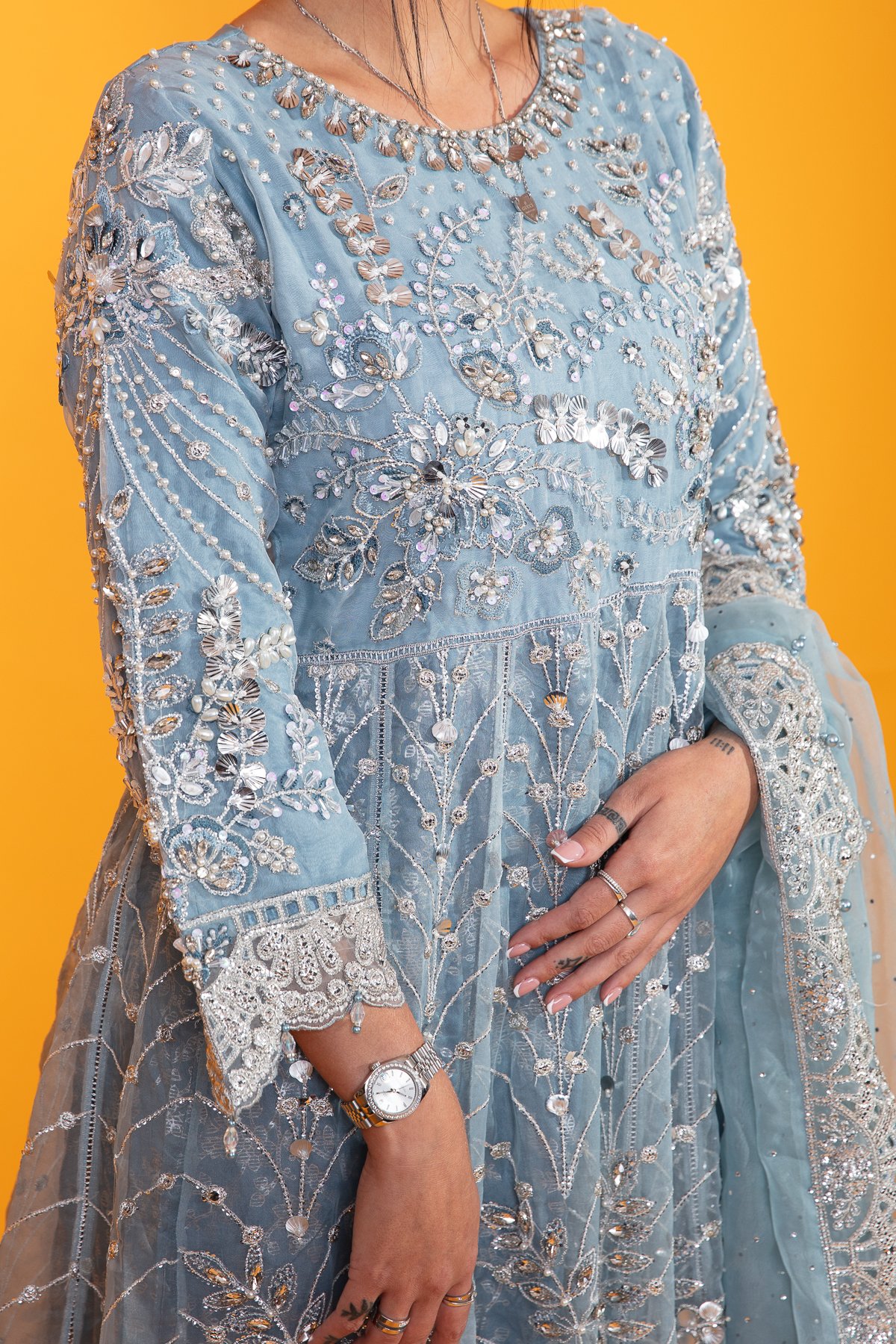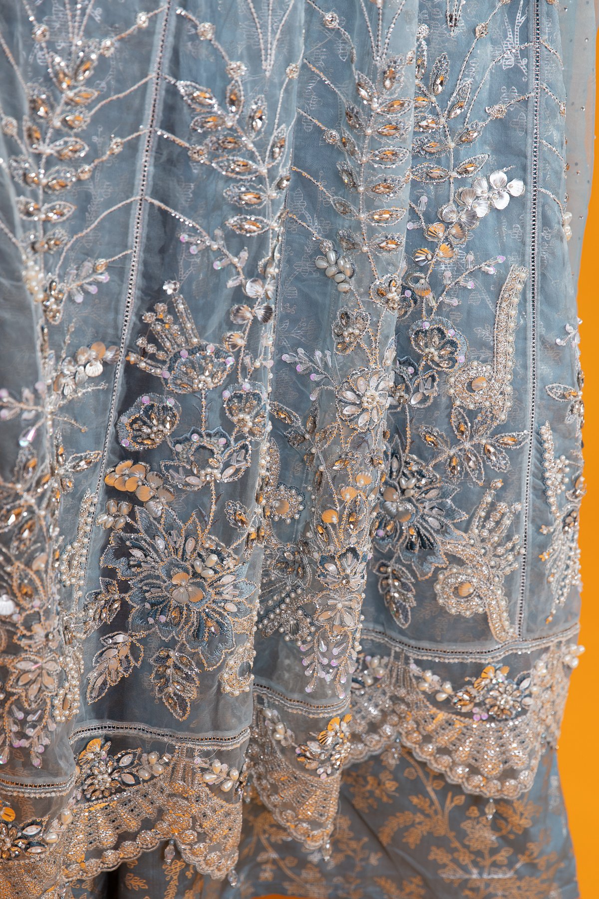 This beautiful 3 piece Maria b suit features a long peplum dress with luxury thread work embroidery along with bead and sequence embellishments throughout the front and full length sleeves, finished with dangling beads on the border and cuffs and a banarsi lining inside. It comes with straight leg crepe trousers and the look is finished with an organza embroidered dupatta.