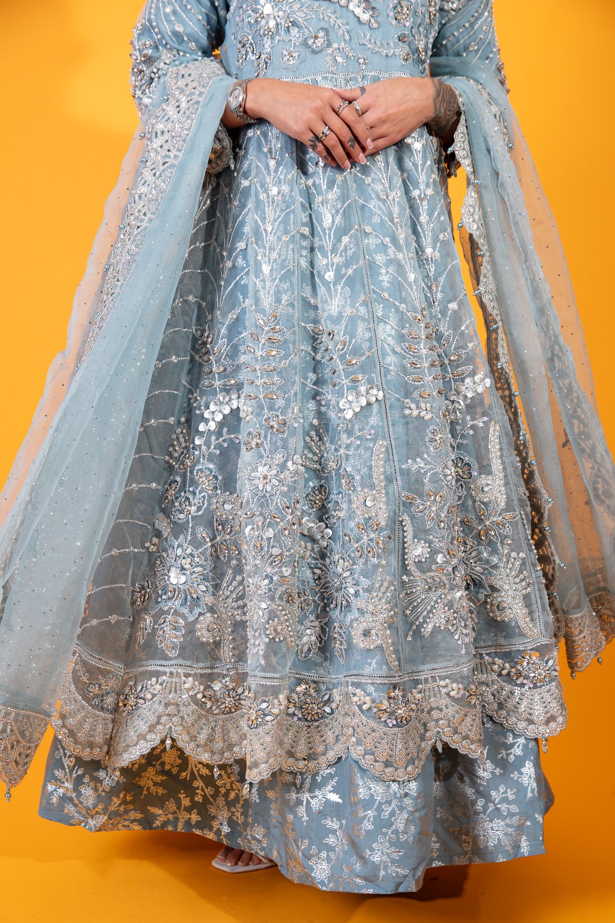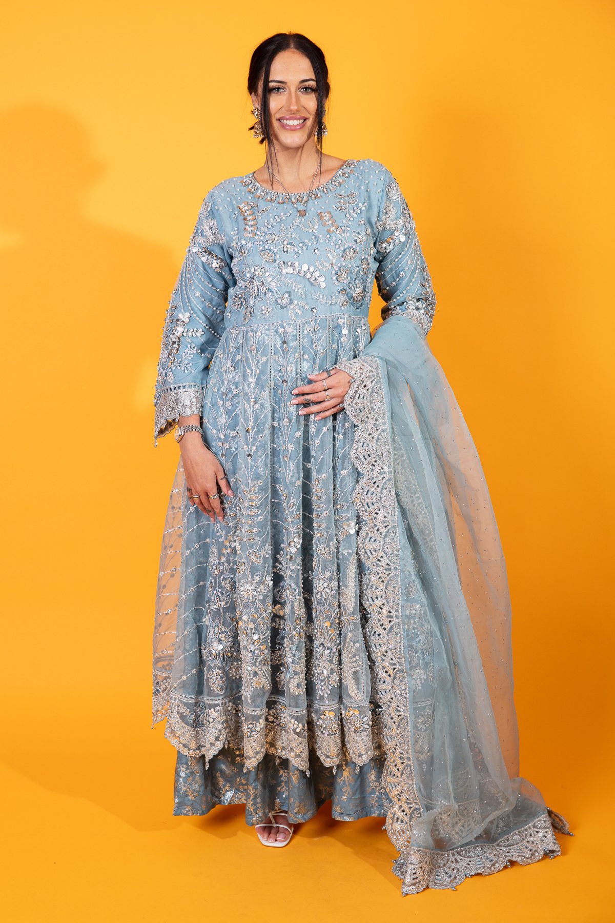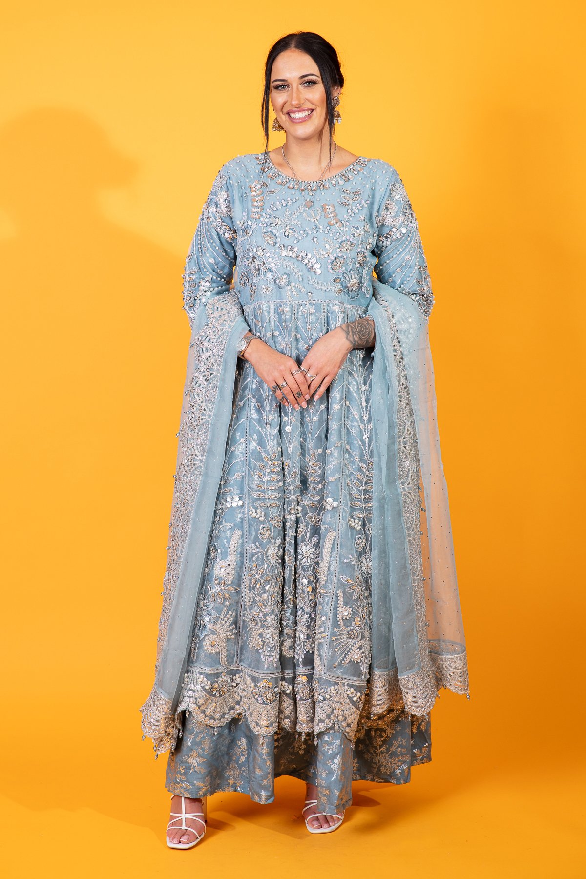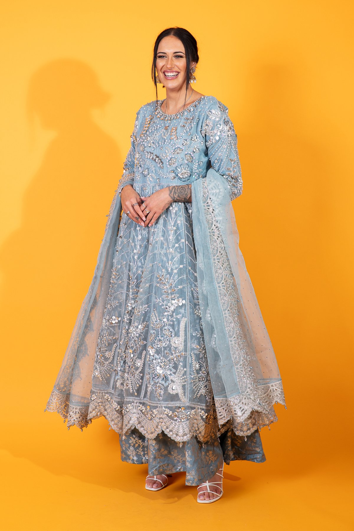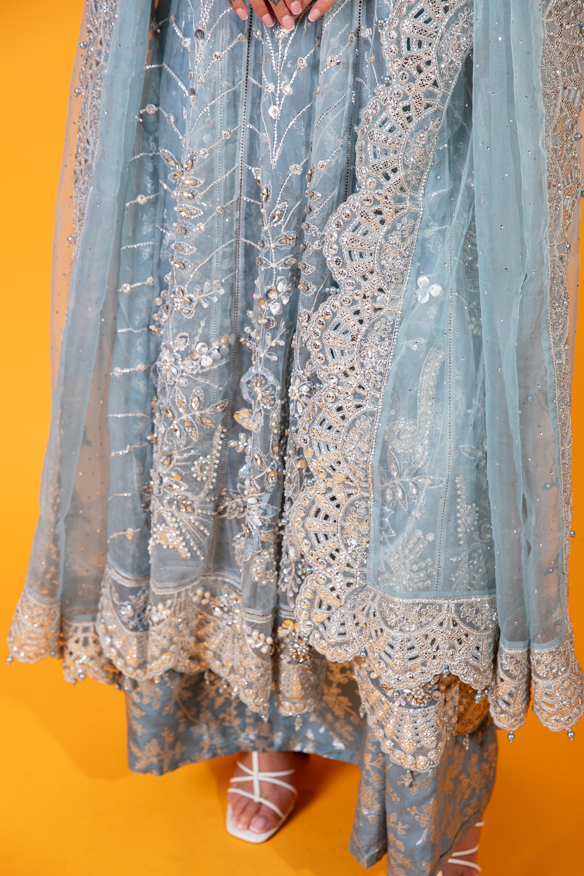 This beautiful 3 piece Maria b suit features a long peplum dress with luxury thread work embroidery along with bead and sequence embellishments throughout the front and full length sleeves, finished with dangling beads on the border and cuffs and a banarsi lining inside. It comes with straight leg crepe trousers and the look is finished with an organza embroidered dupatta.