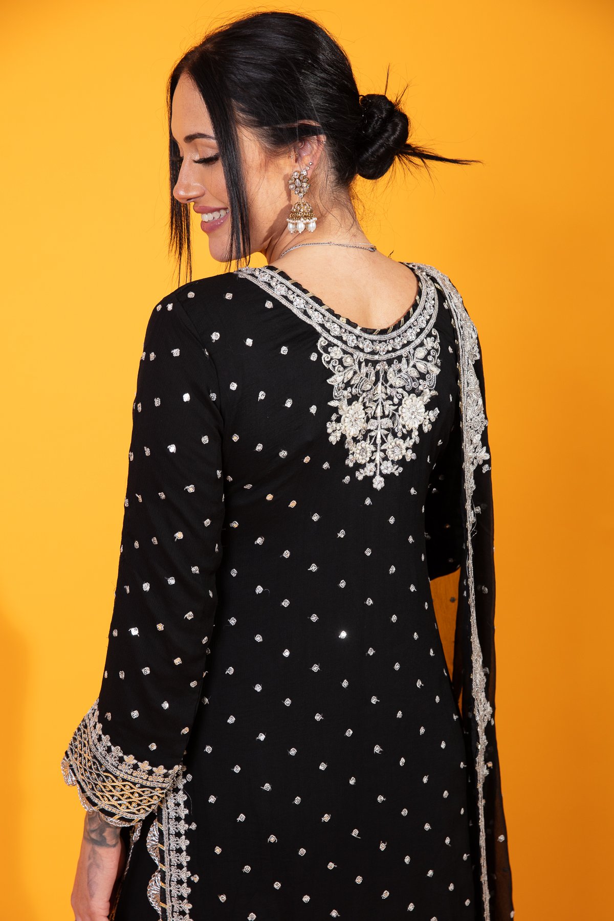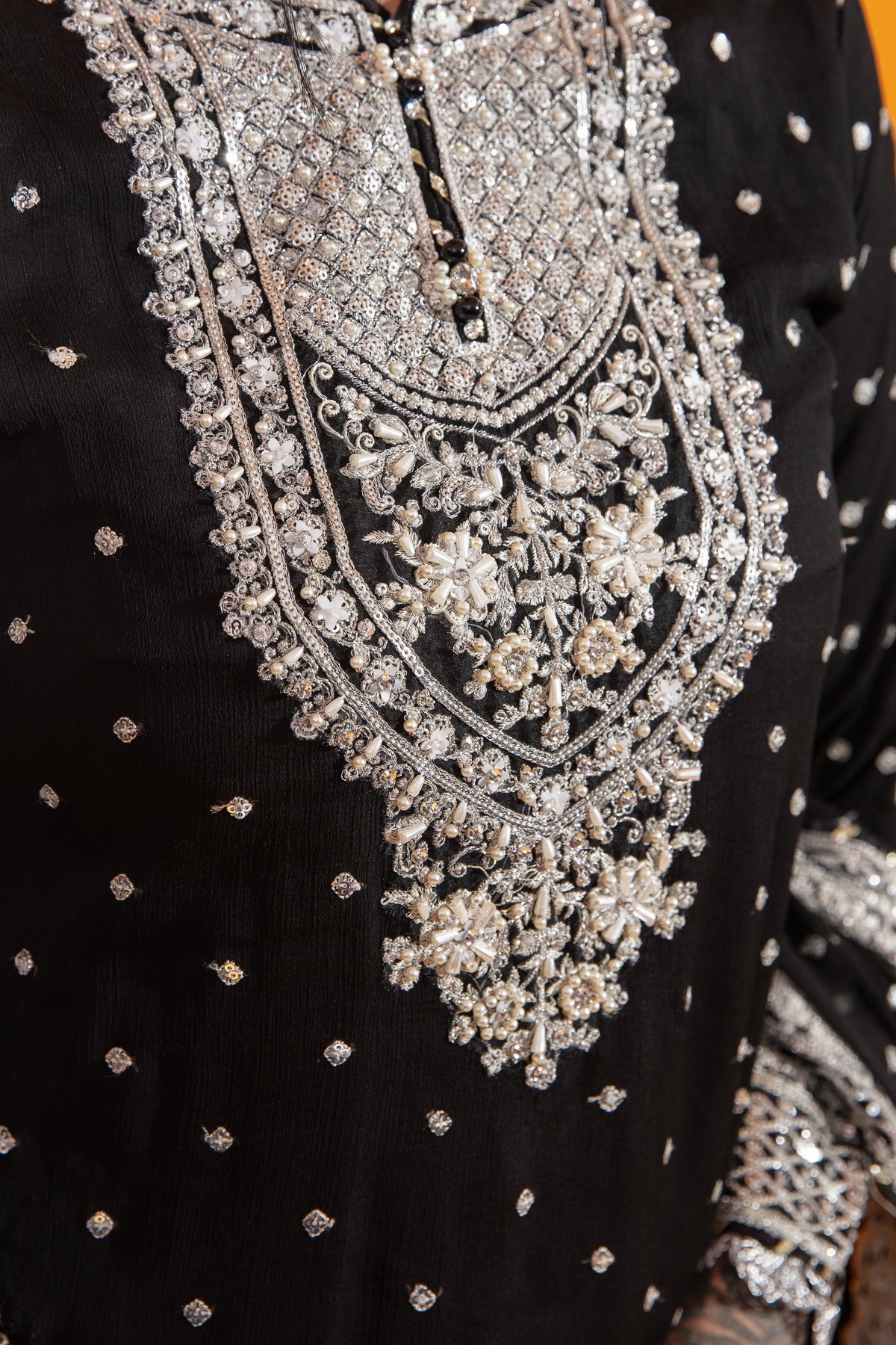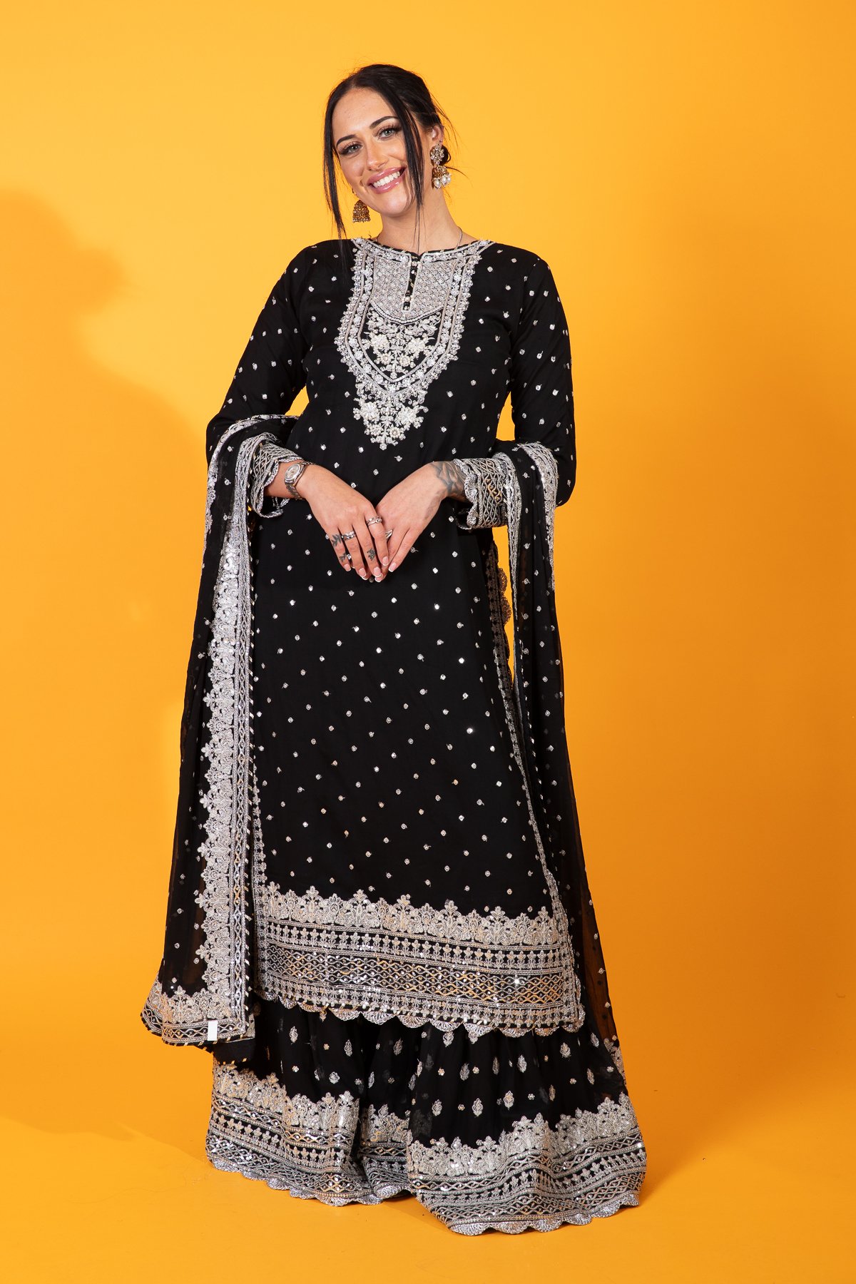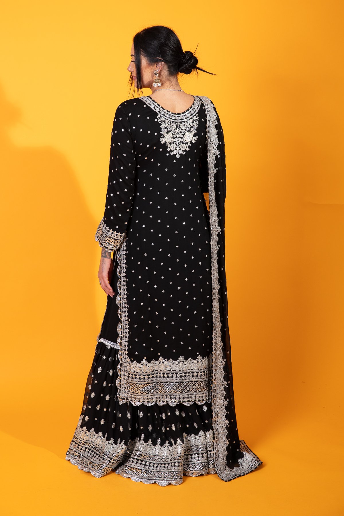 This beautiful 3 piece Maria b inspired suit features a straight long length shirt with luxury dori work embroidery throughout with lace embellishment on the border as well as the cuffs of full length sleeves. It comes with an embroidered chiffon plazo trousers and the look is finished with a chiffon embroidered dupatta.
