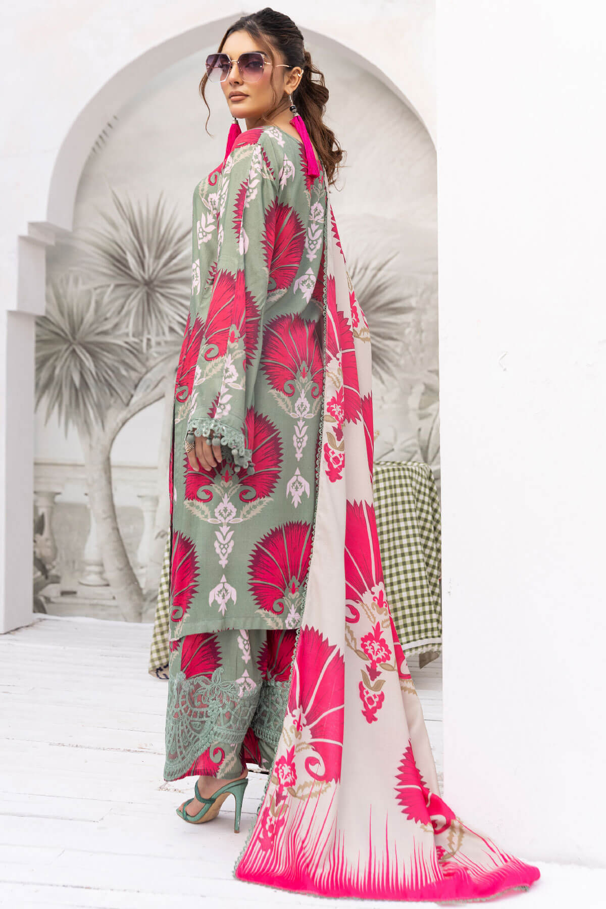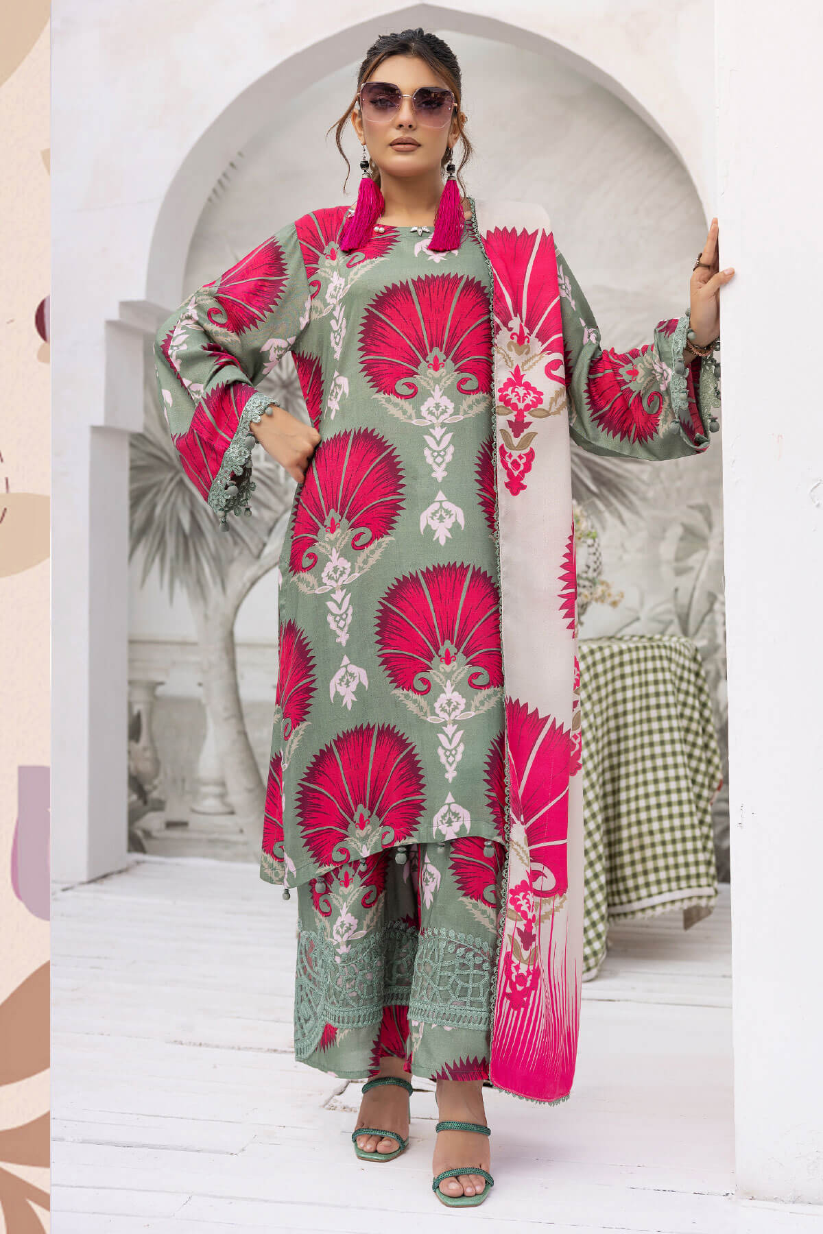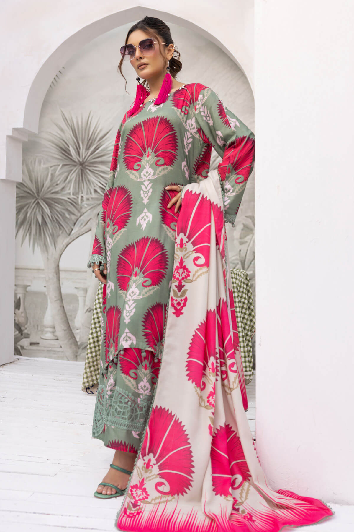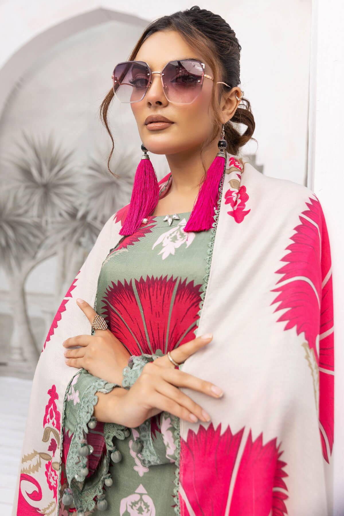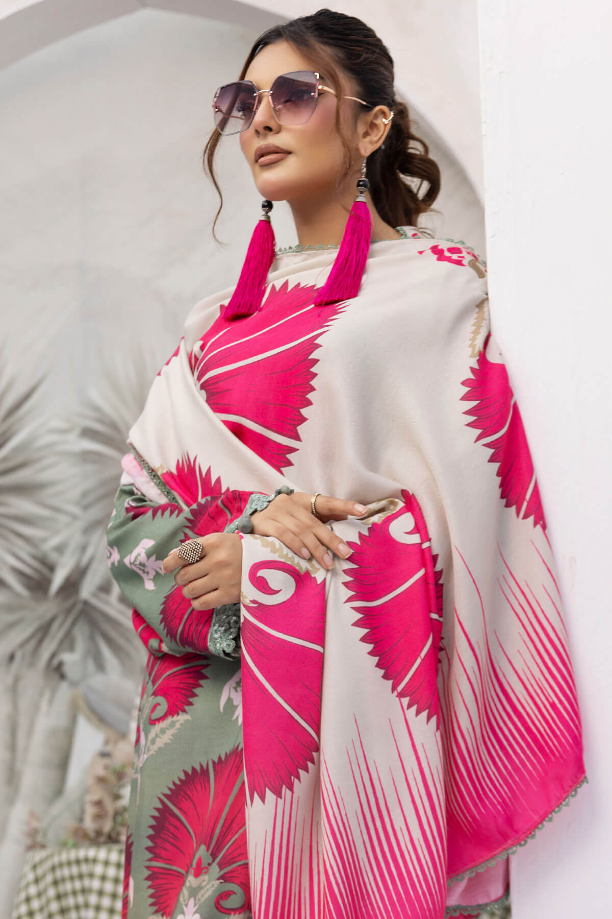 This beautiful 3 piece Maria b petals collection features a straight long length printed shirt finished with full length sleeves with lace embellished cuffs. Paired with straight leg trousers with thread embroidered borders and the look is finished with a wool digital printed shawl.