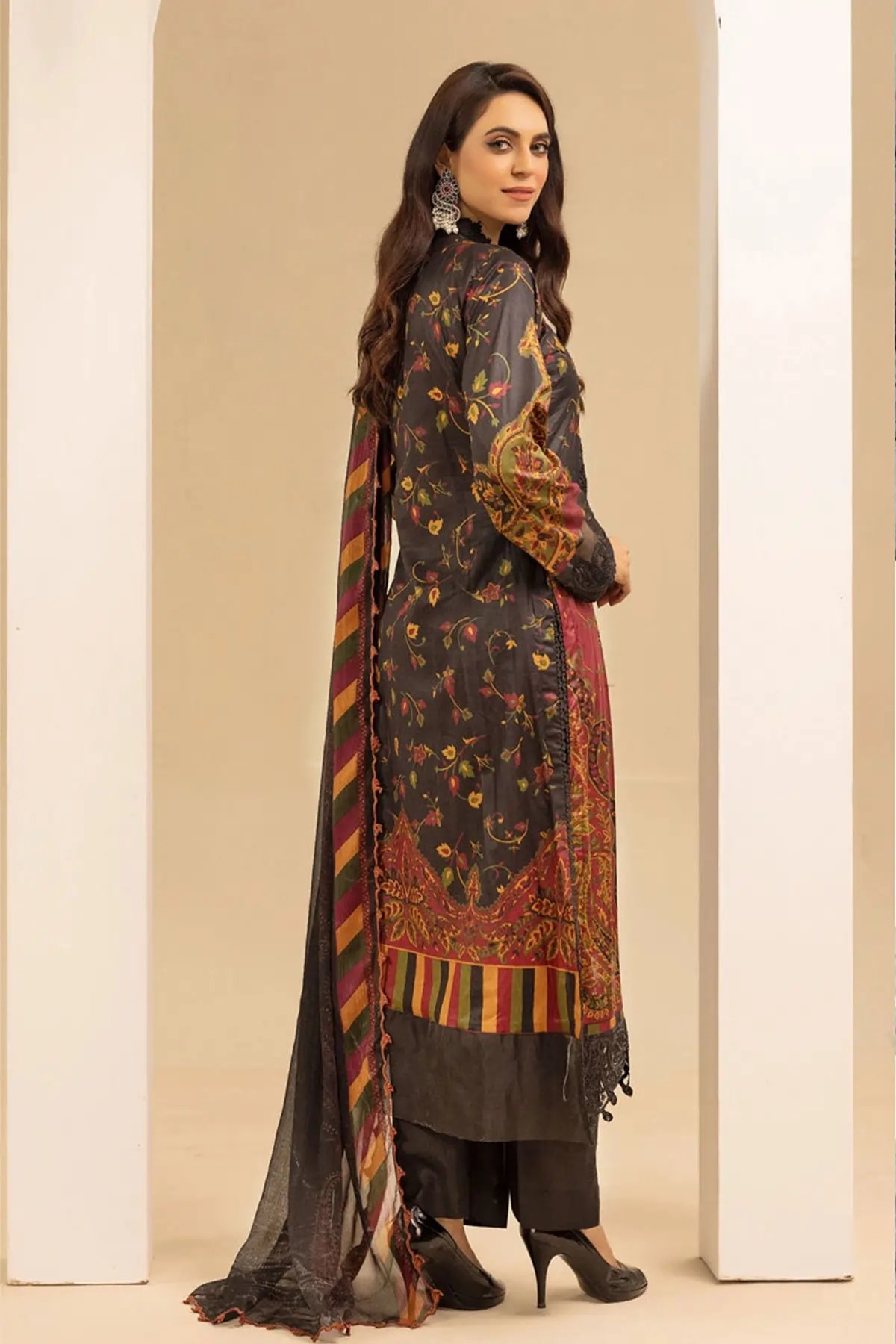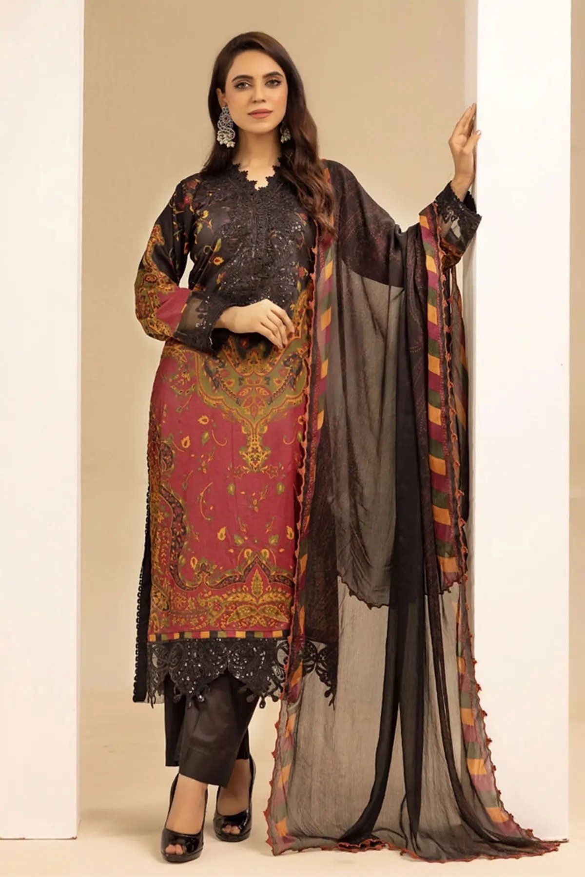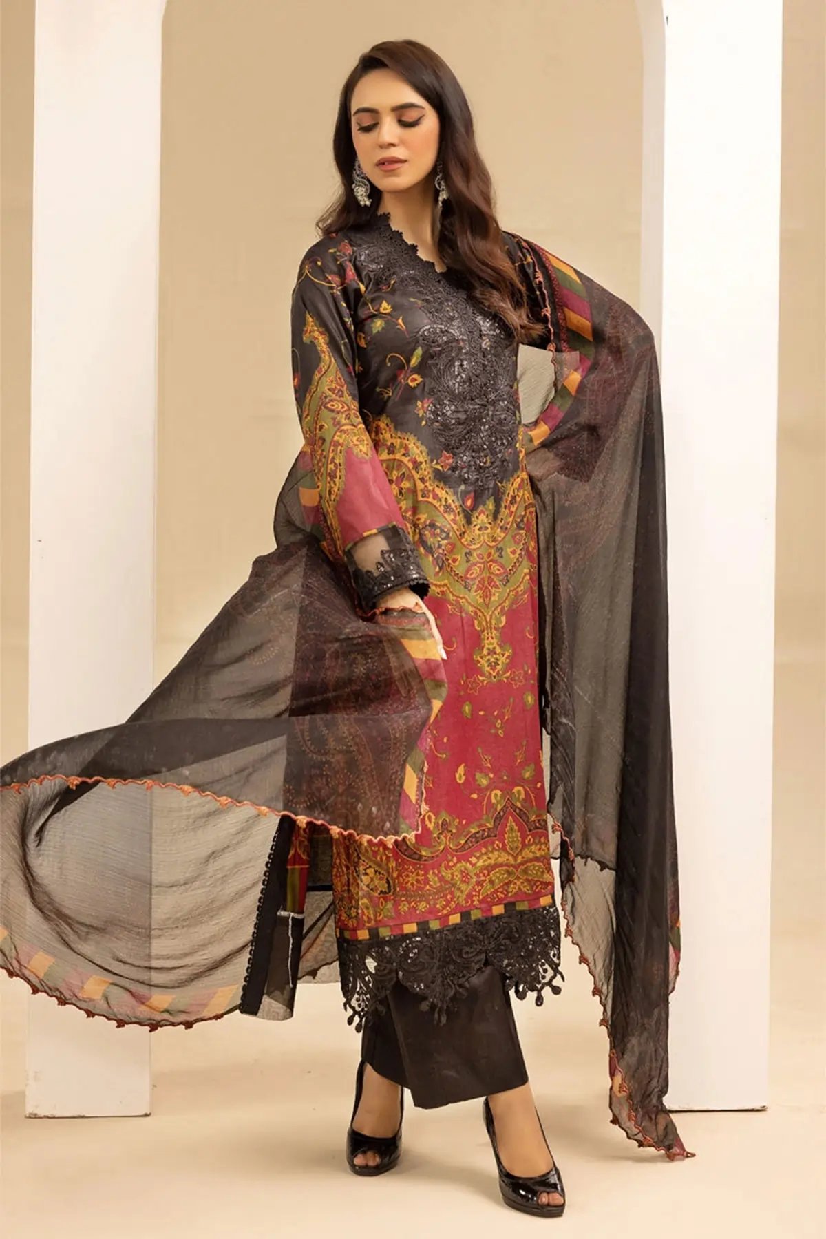 This beautiful 3 piece Maria b inspired suit features a straight printed shirt with luxury lace embroidered front and border, finished with full length printed sleeves with embroidered cuffs. Paired with straight leg silk trousers and the look is finished with digital printed chiffon dupatta. Perfect casual collection for this Eid.