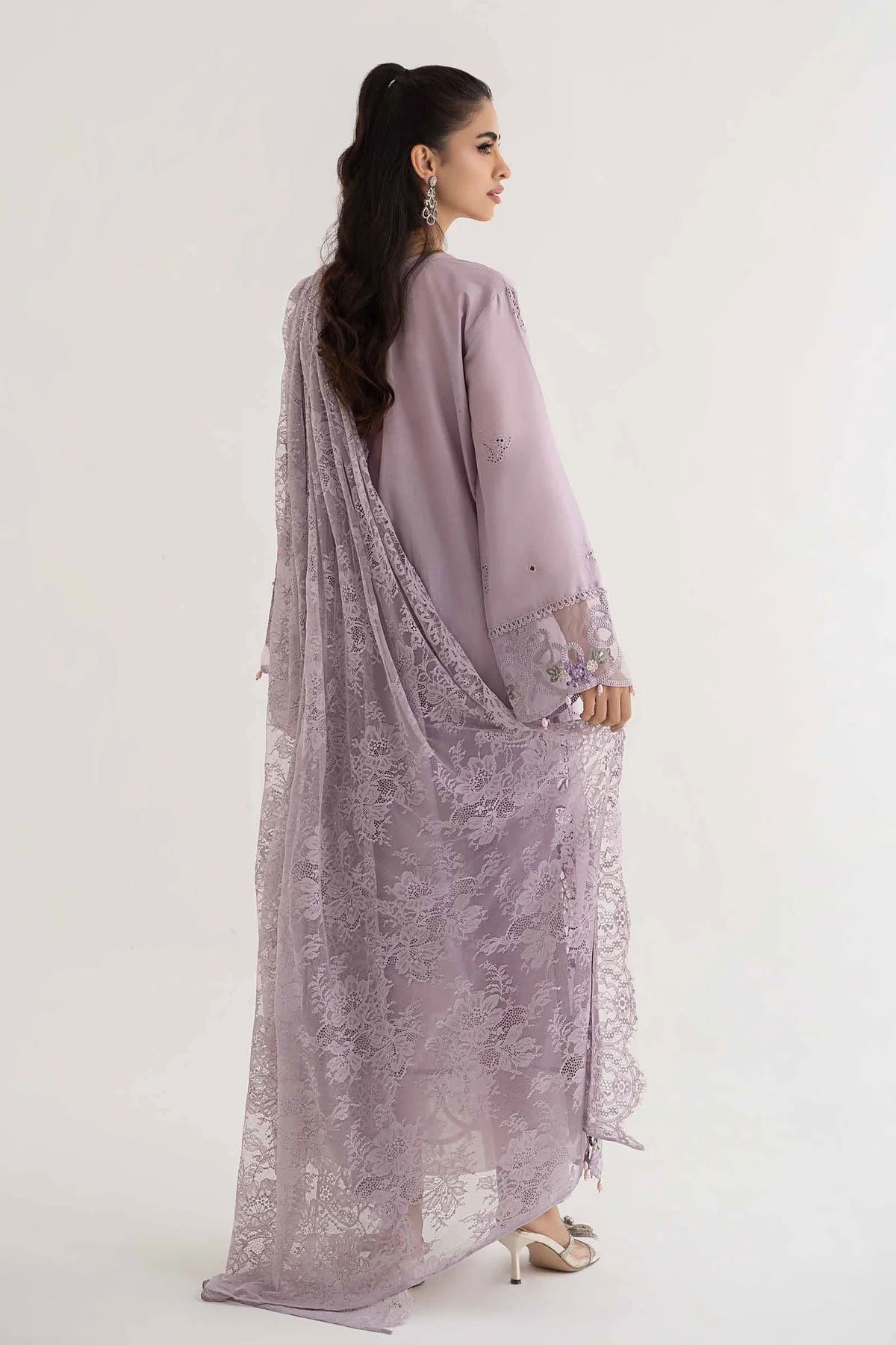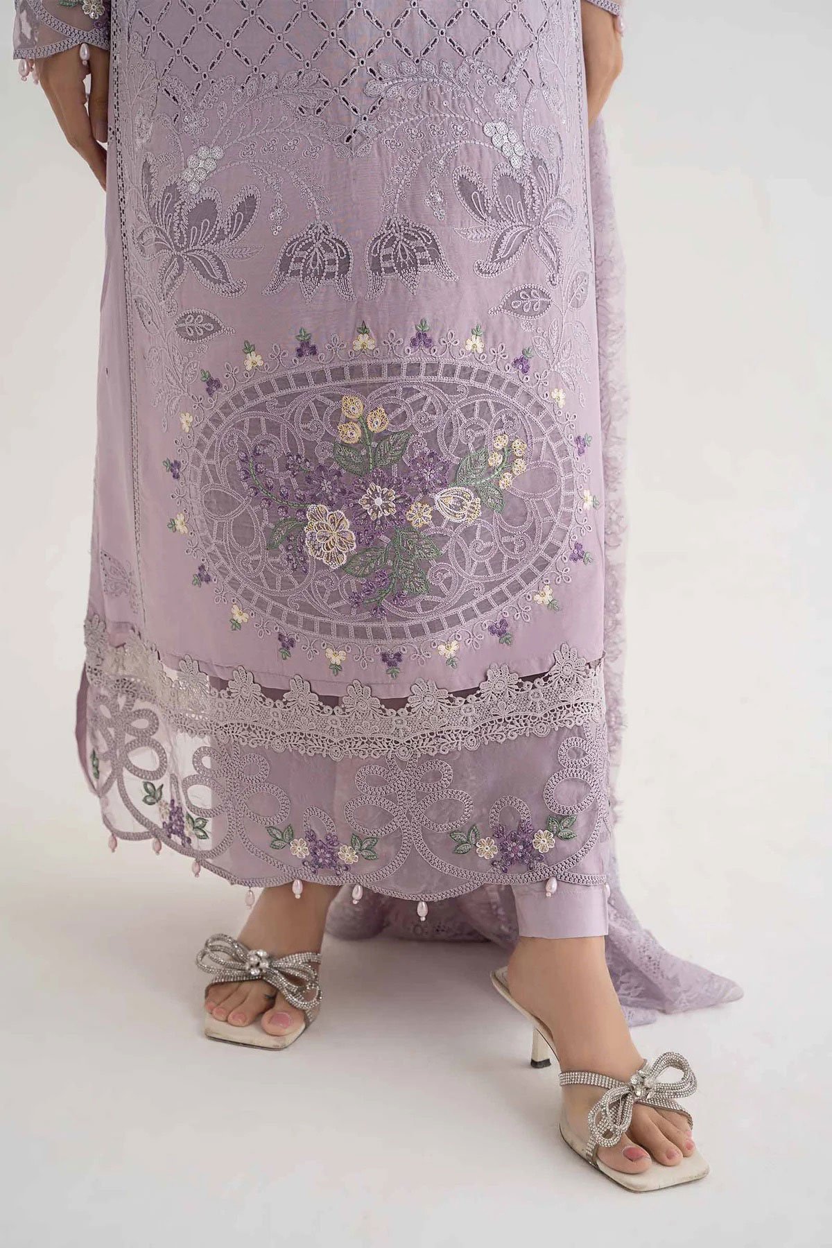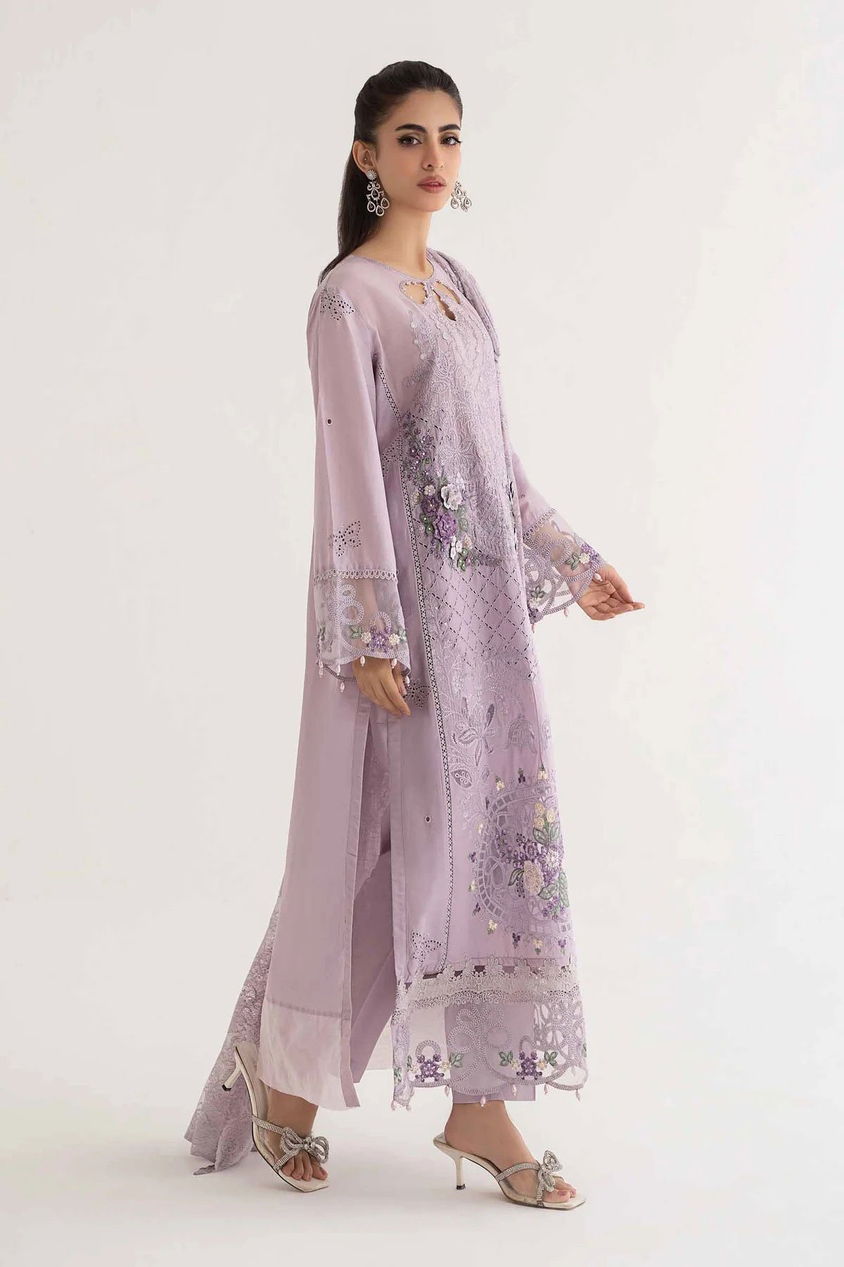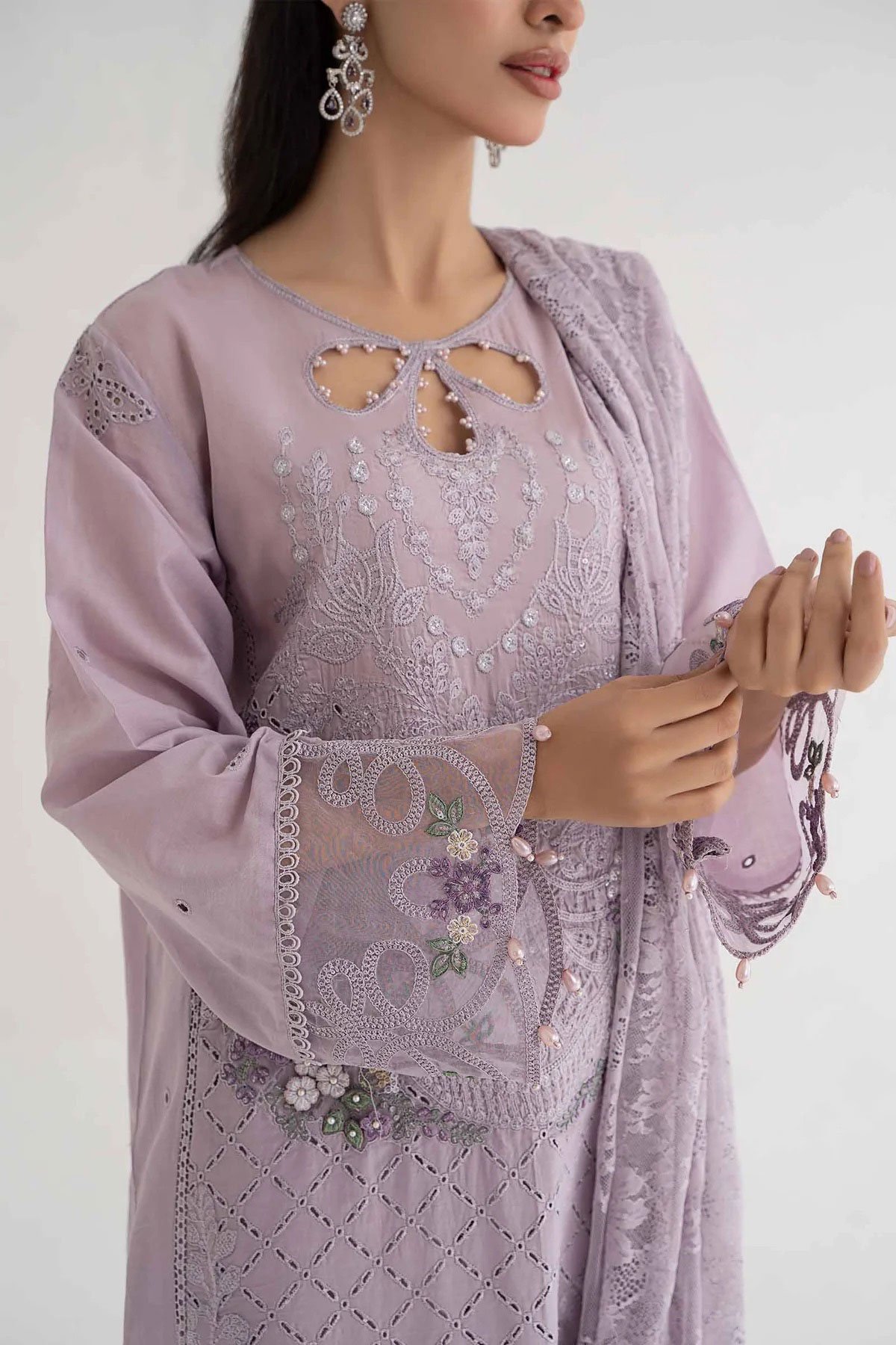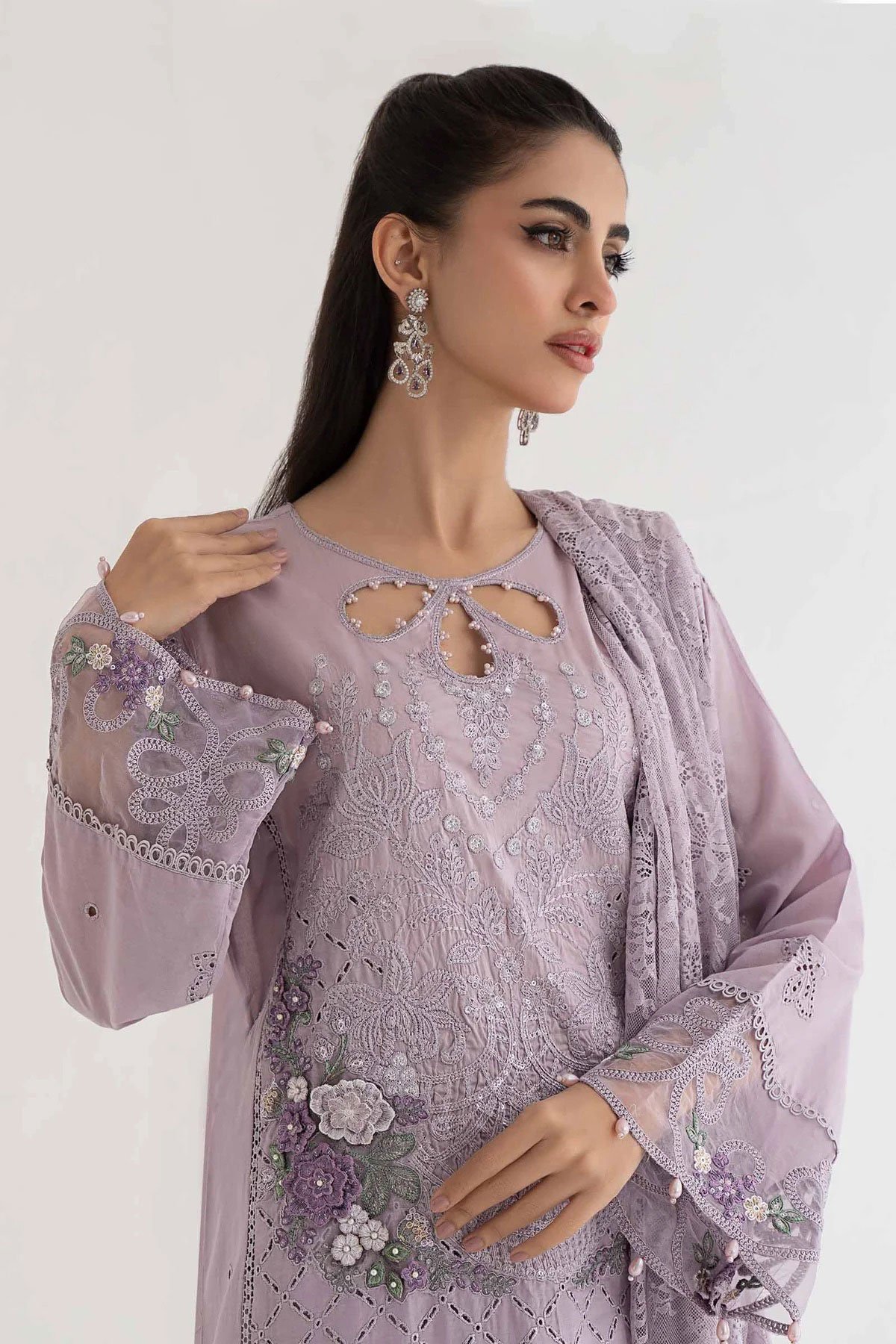 This beautiful 3 piece Maria b inspired suit features a straight shirt with luxury thread work embroidery throughout the front, finished with dangling beads from the border as well as full length embroidered sleeves. It comes with straight leg plain trousers and the look is finished with a crochet net dupatta. Note: Above catalogue pictures are for design reference only.
