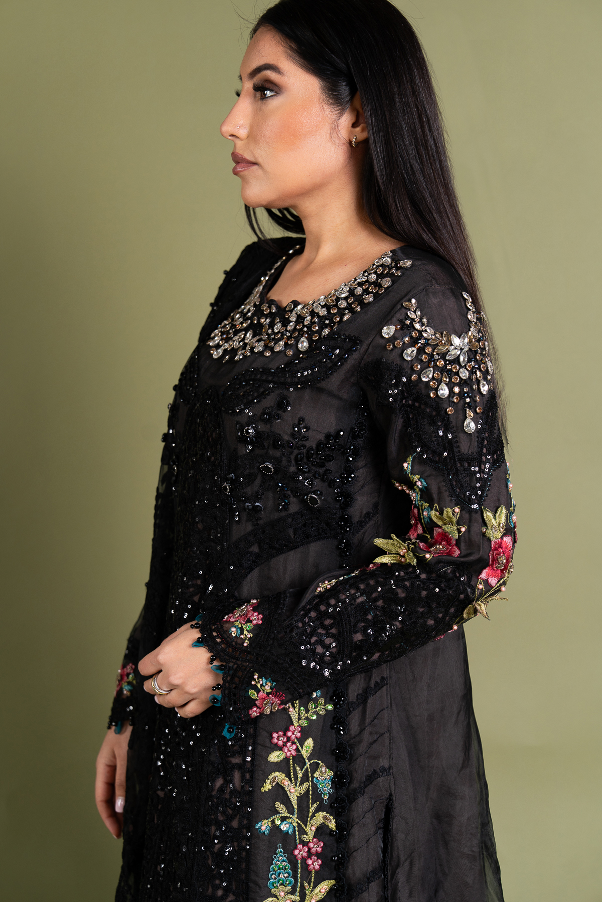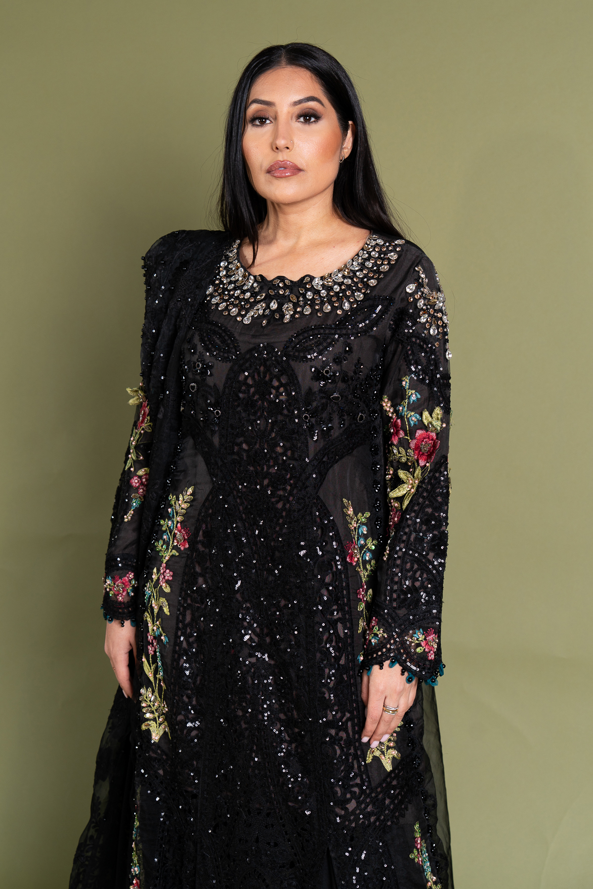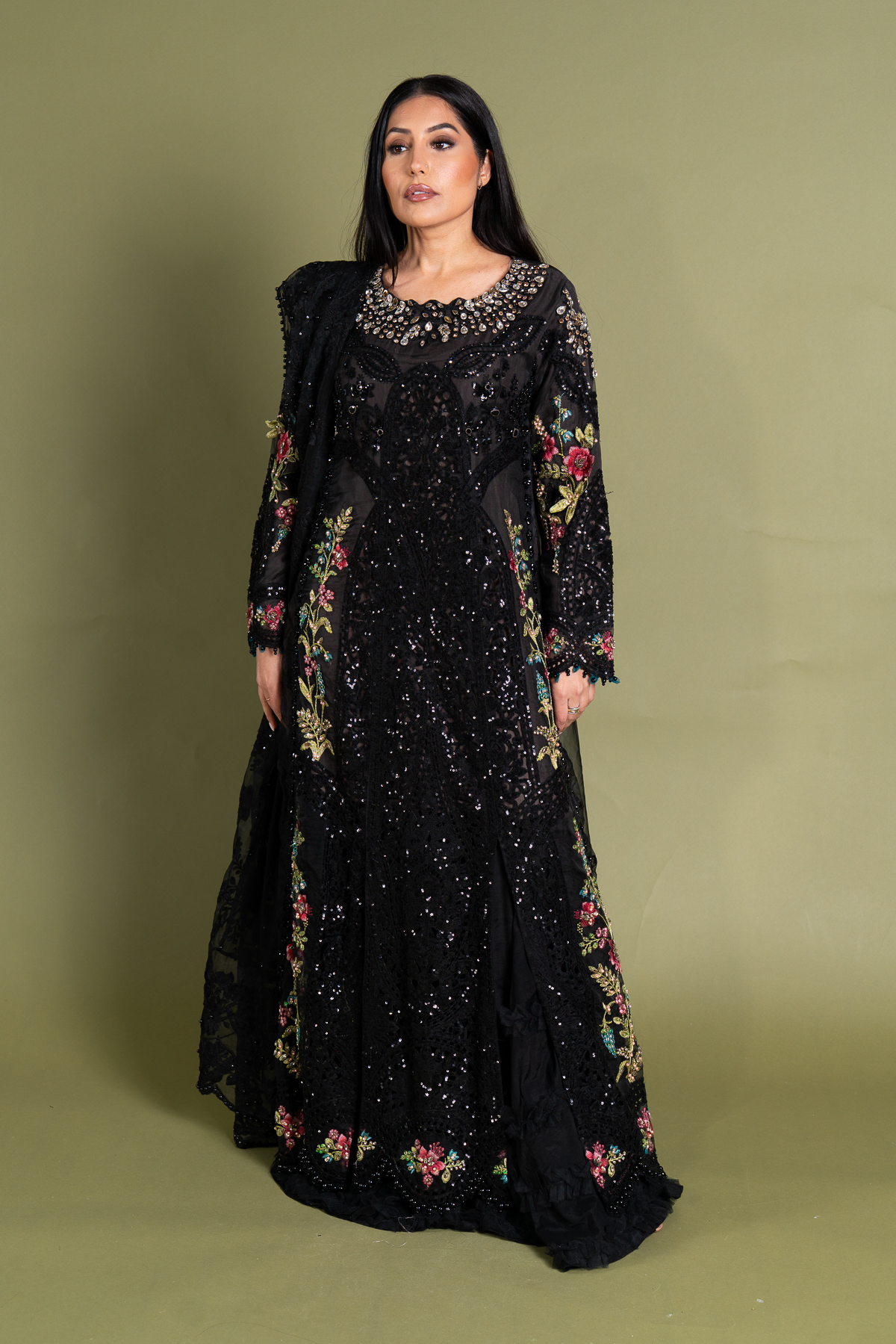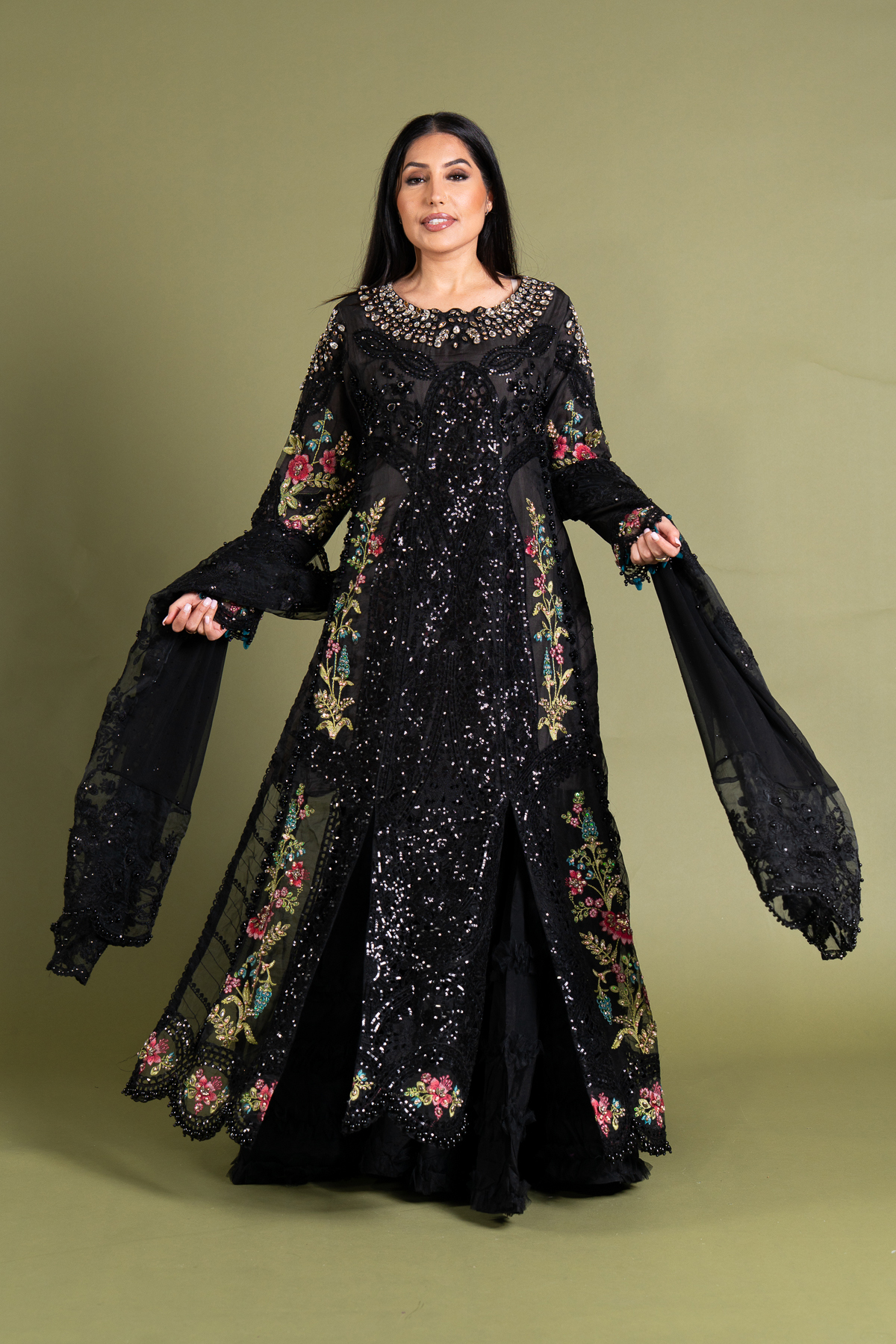 This beautiful 3 piece Maria b wedding collection features a long gown with luxury thread work embroidery throughout with bead embellishments finished with slits on the borders. Paired with crepe plazo trousers and the look is finished with an embroidered organza dupatta.