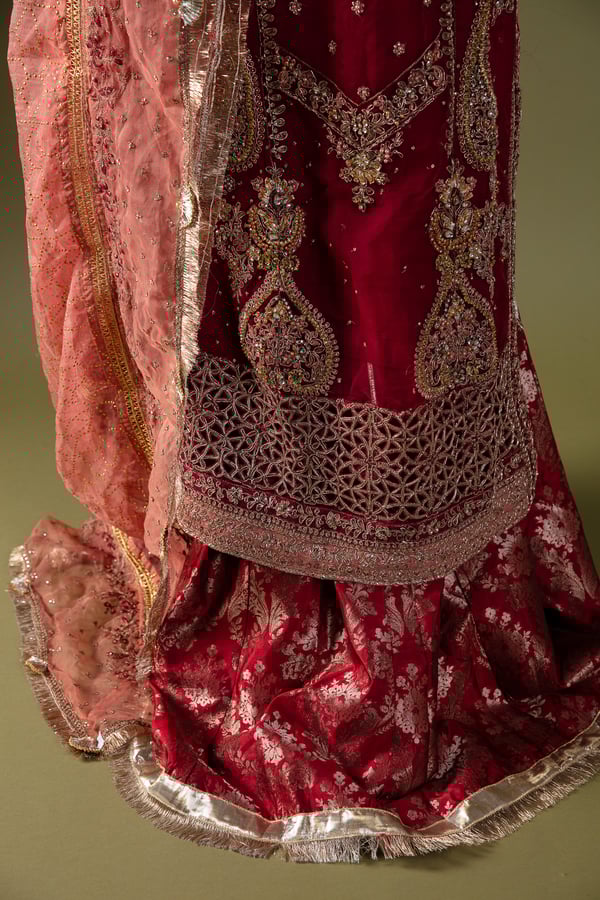 This beautiful 3 piece Maria b inspired wedding collection features a straight shirt with luxury thread work embroidered front with bead embellishment, finished with full length embroidered sleeves. It comes with a banarsi lengha and the look is finished with a contrasted digital printed organza dupatta.