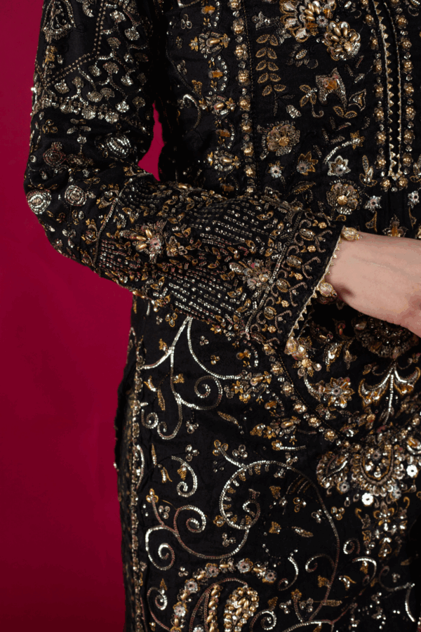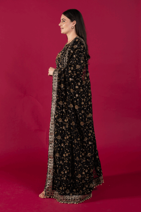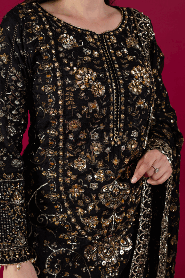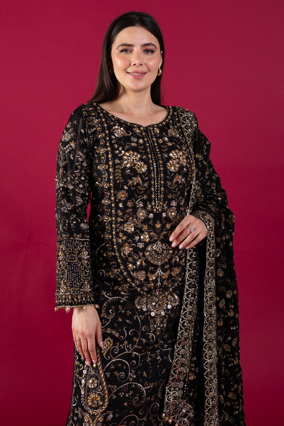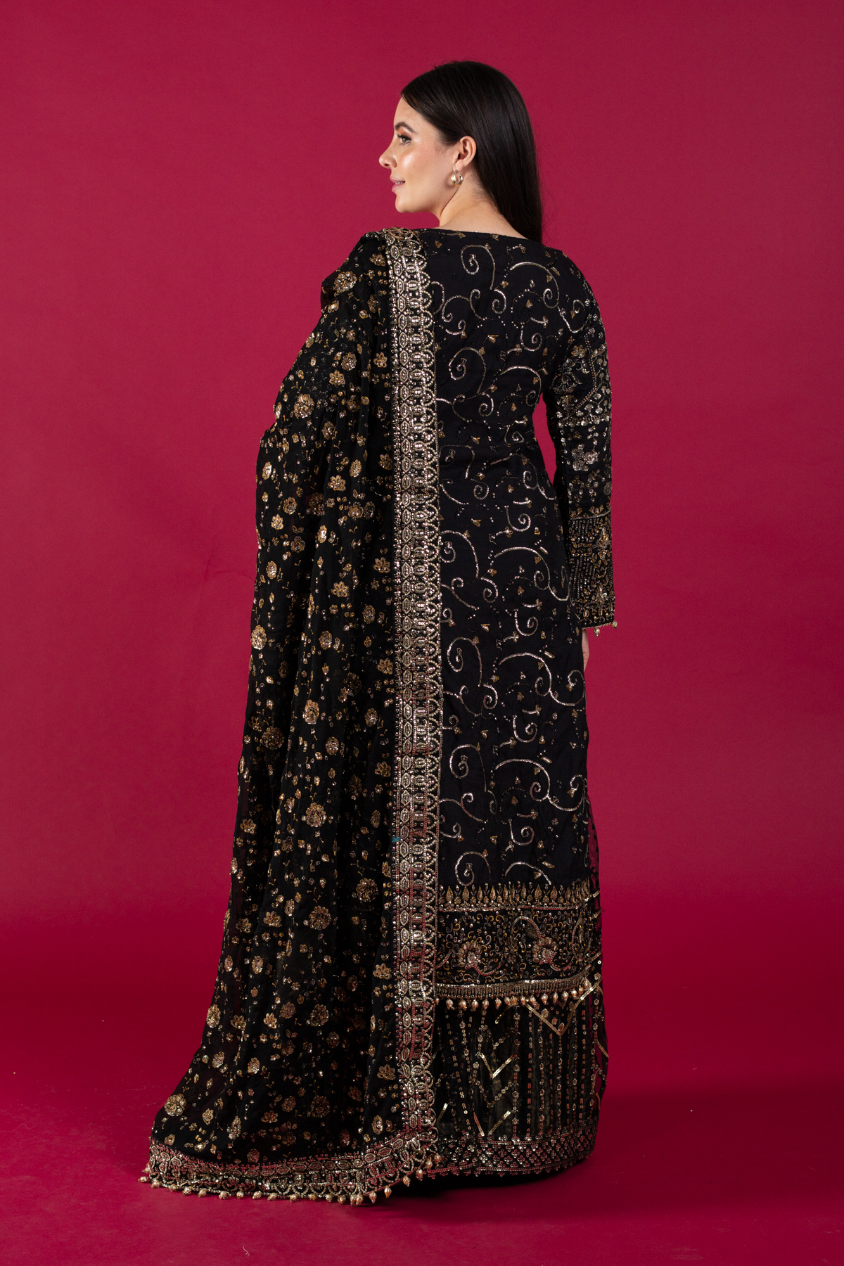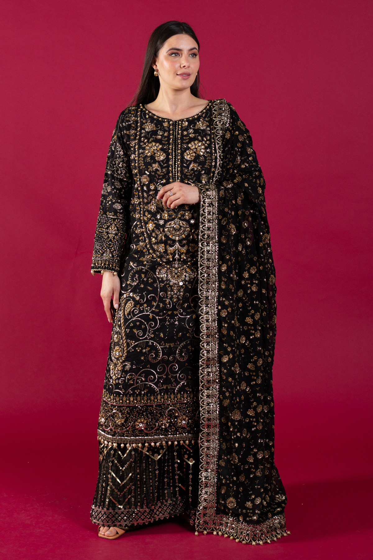 This beautiful 3 piece Maria b inspired suit features a straight shirt with luxury thread work embroidery along with sequin and motif embellishments, finished with full length embroidered sleeves. Paired with an embroidered sharara and the look is finished with a heavy embroidered dupatta. Perfect festive and wedding wear attire to enhance your elegance for an event.