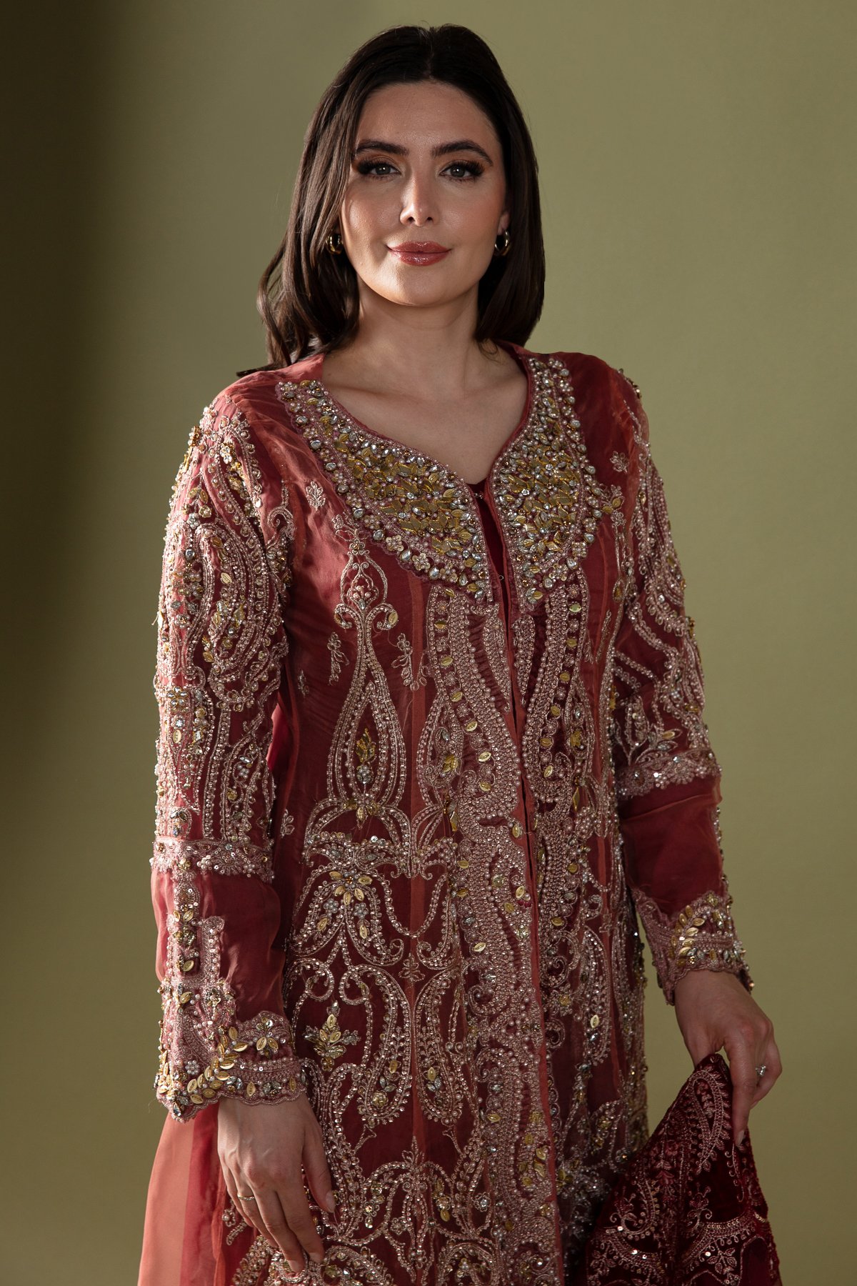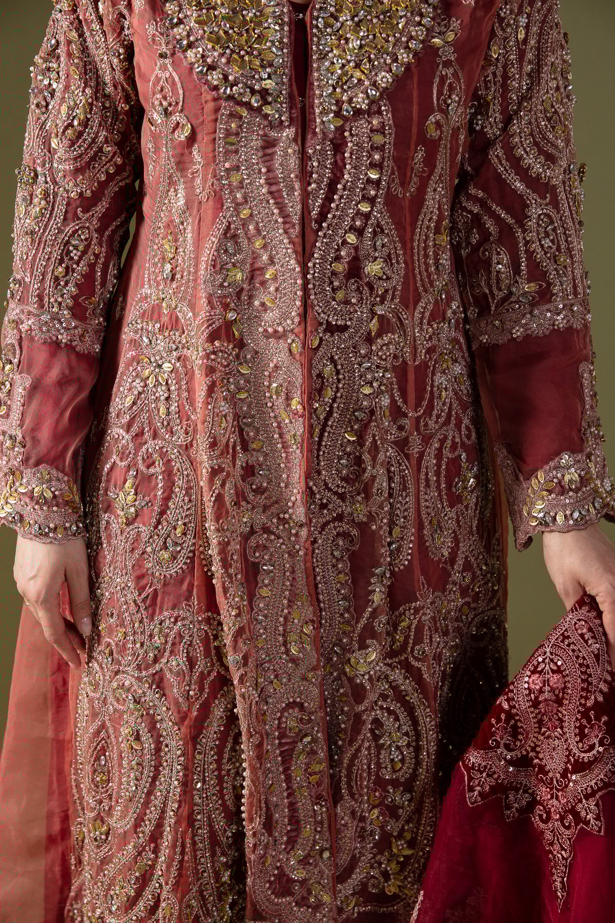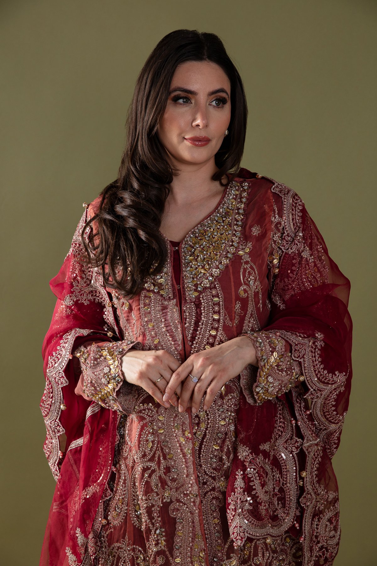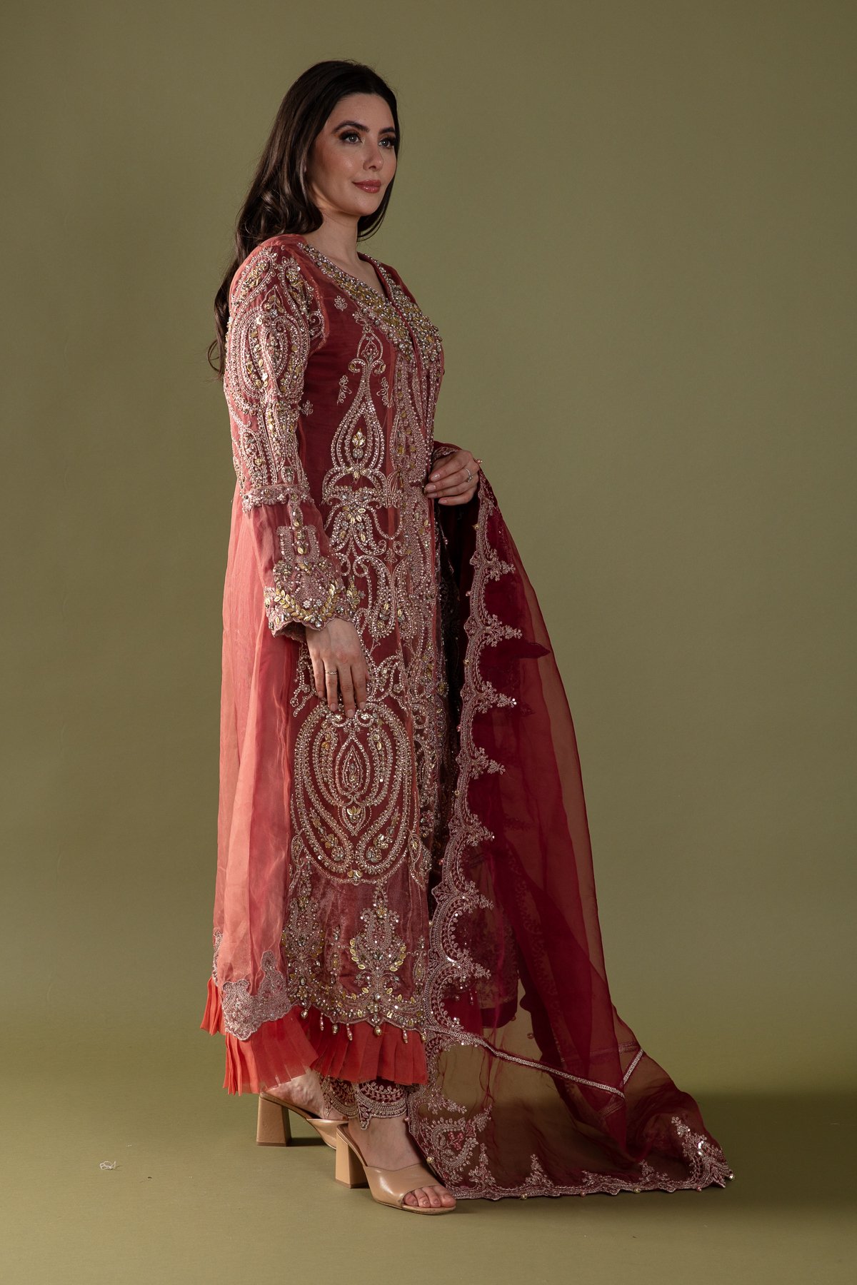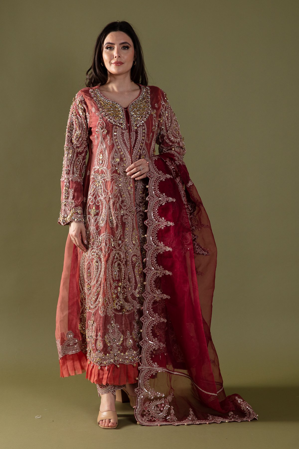 This beautiful 3 piece Maria b inspired wedding collection features an a-line shirt with luxury thread work embroidery throughout the front with beaded embellishments, finished with full length embroidered sleeves. It comes with straight leg trousers and the look is finished with a contrasted organza dupatta.