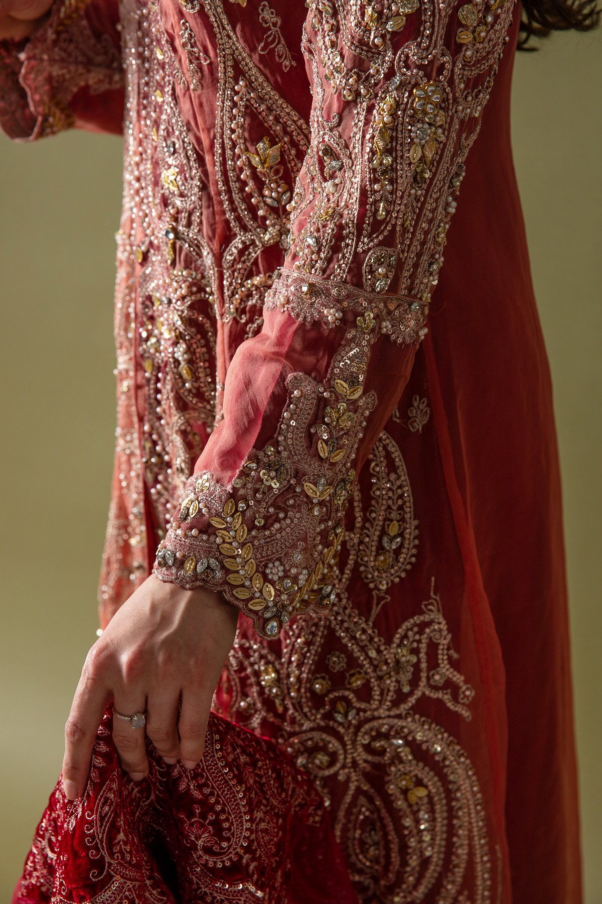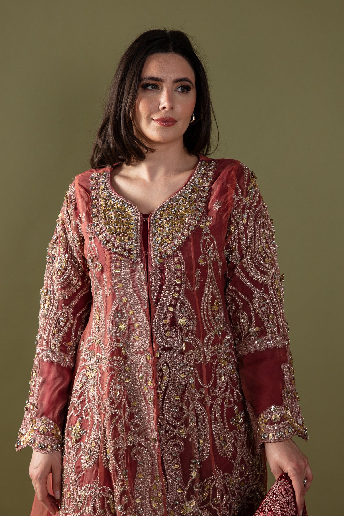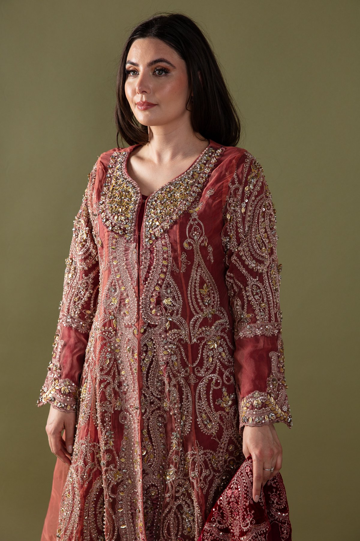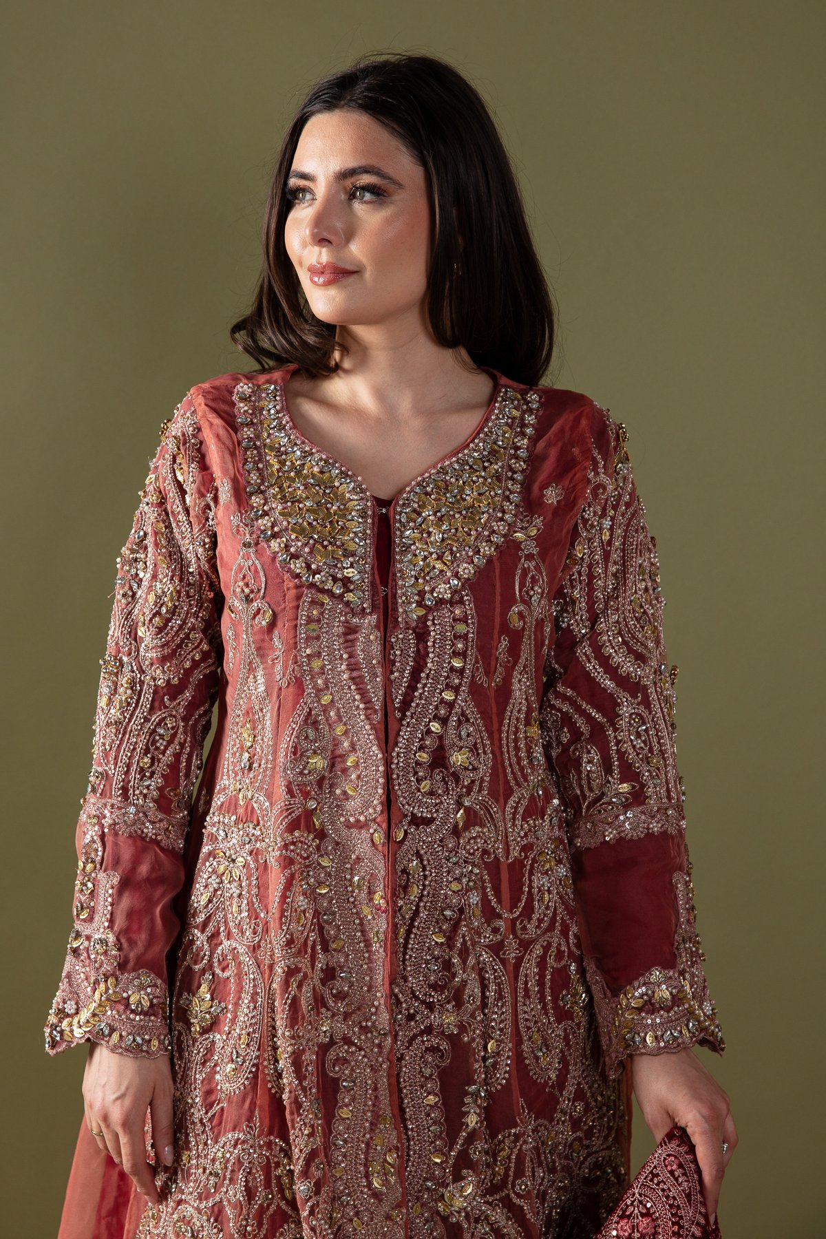 This beautiful 3 piece Maria b inspired wedding collection features an a-line shirt with luxury thread work embroidery throughout the front with beaded embellishments, finished with full length embroidered sleeves. It comes with straight leg trousers and the look is finished with a contrasted organza dupatta.