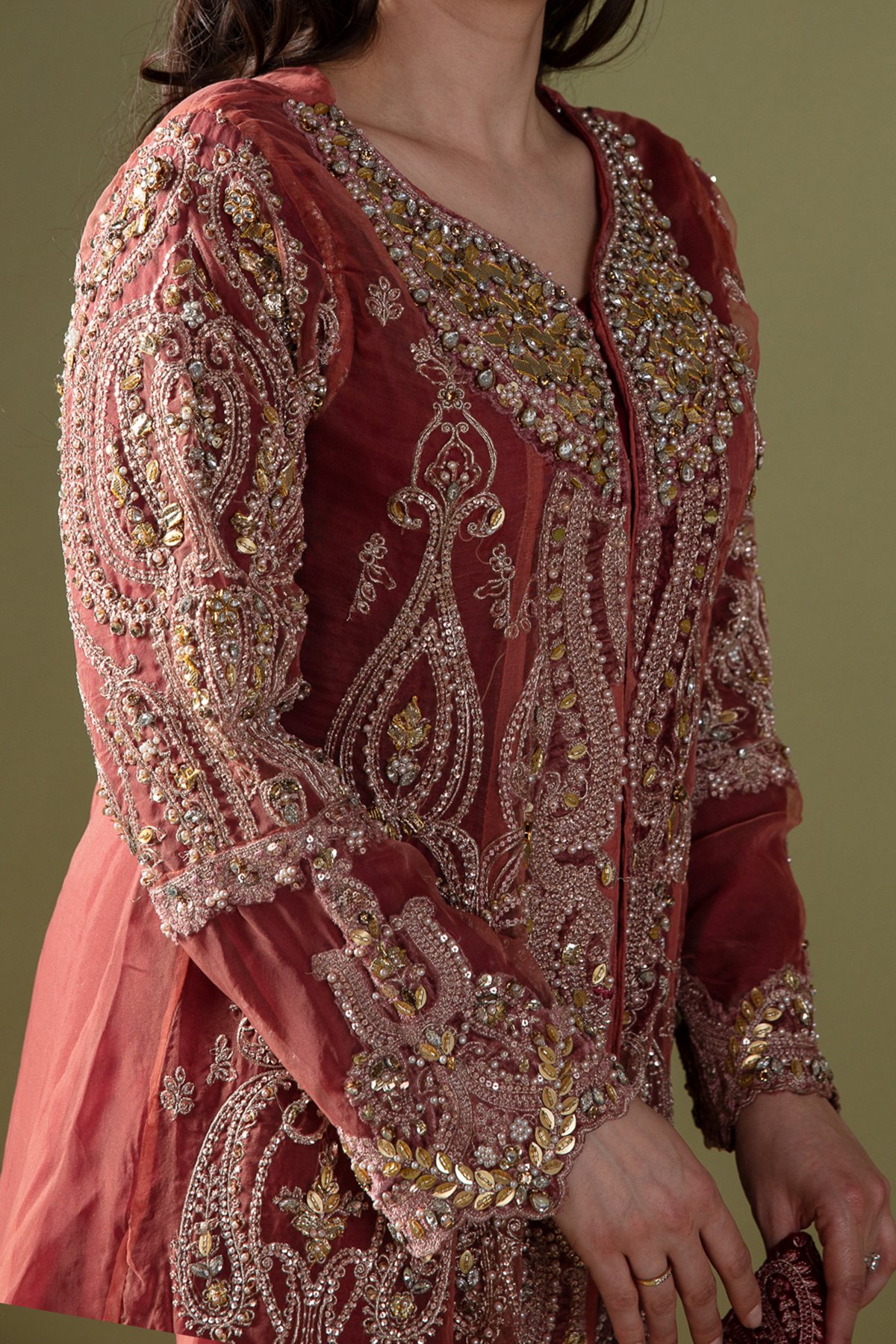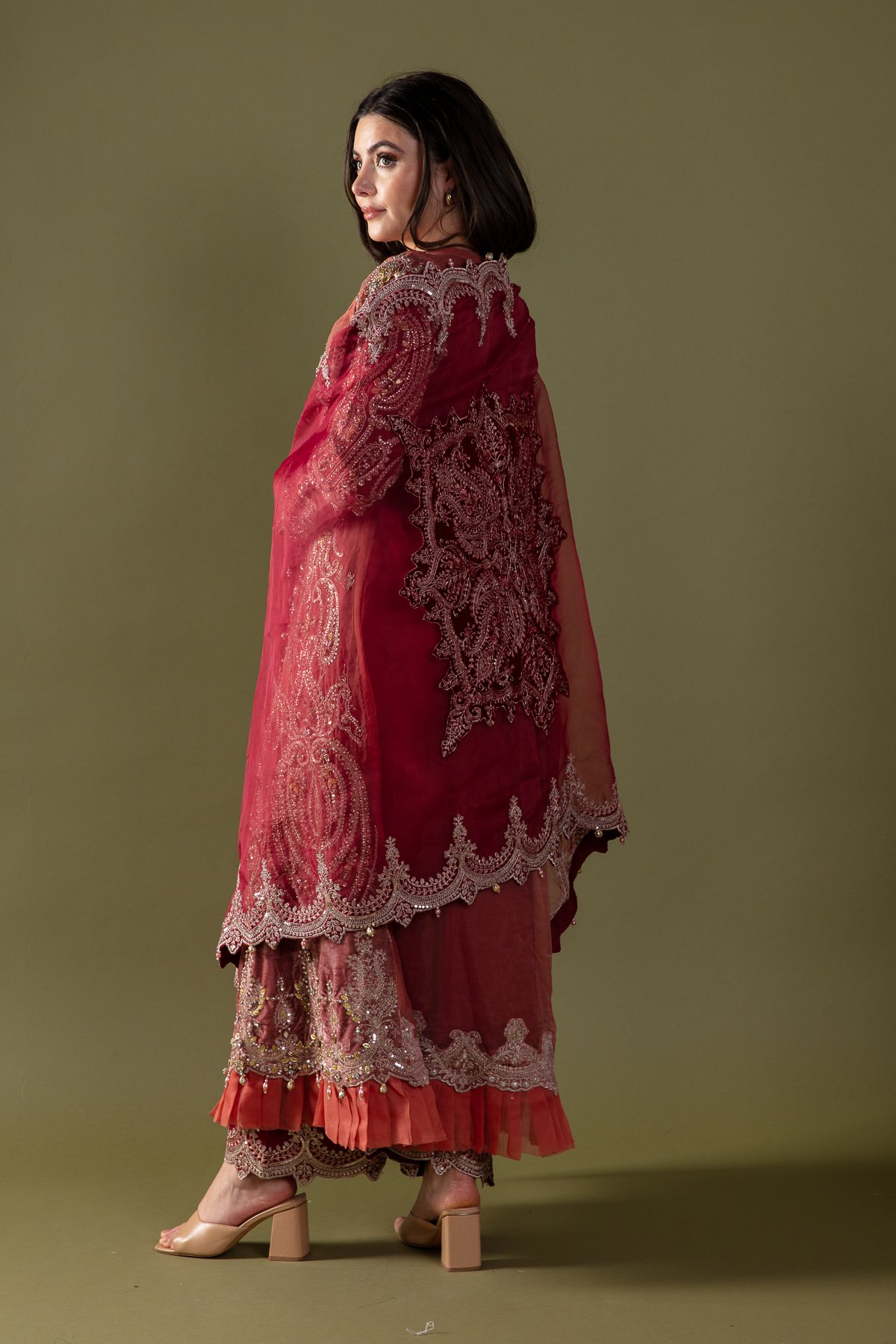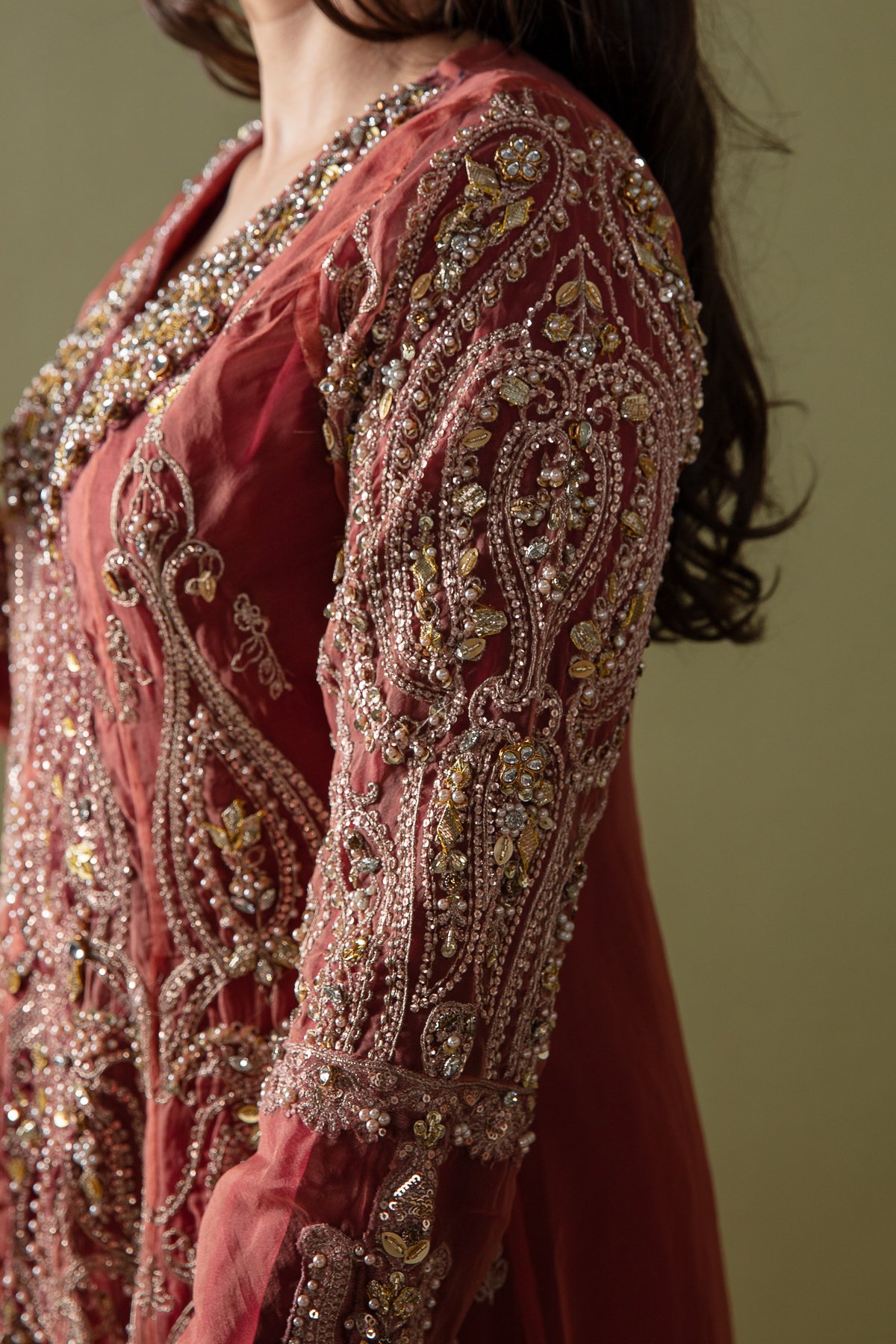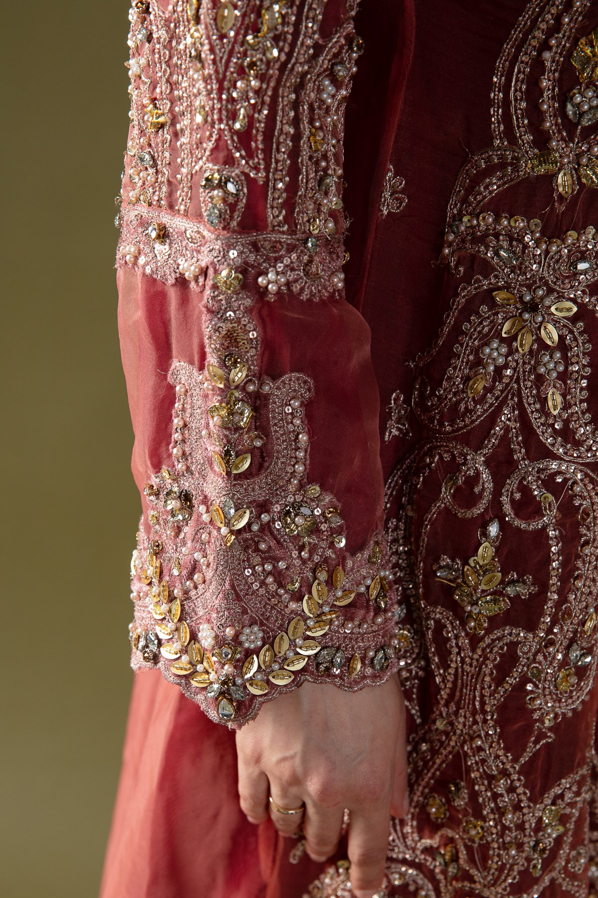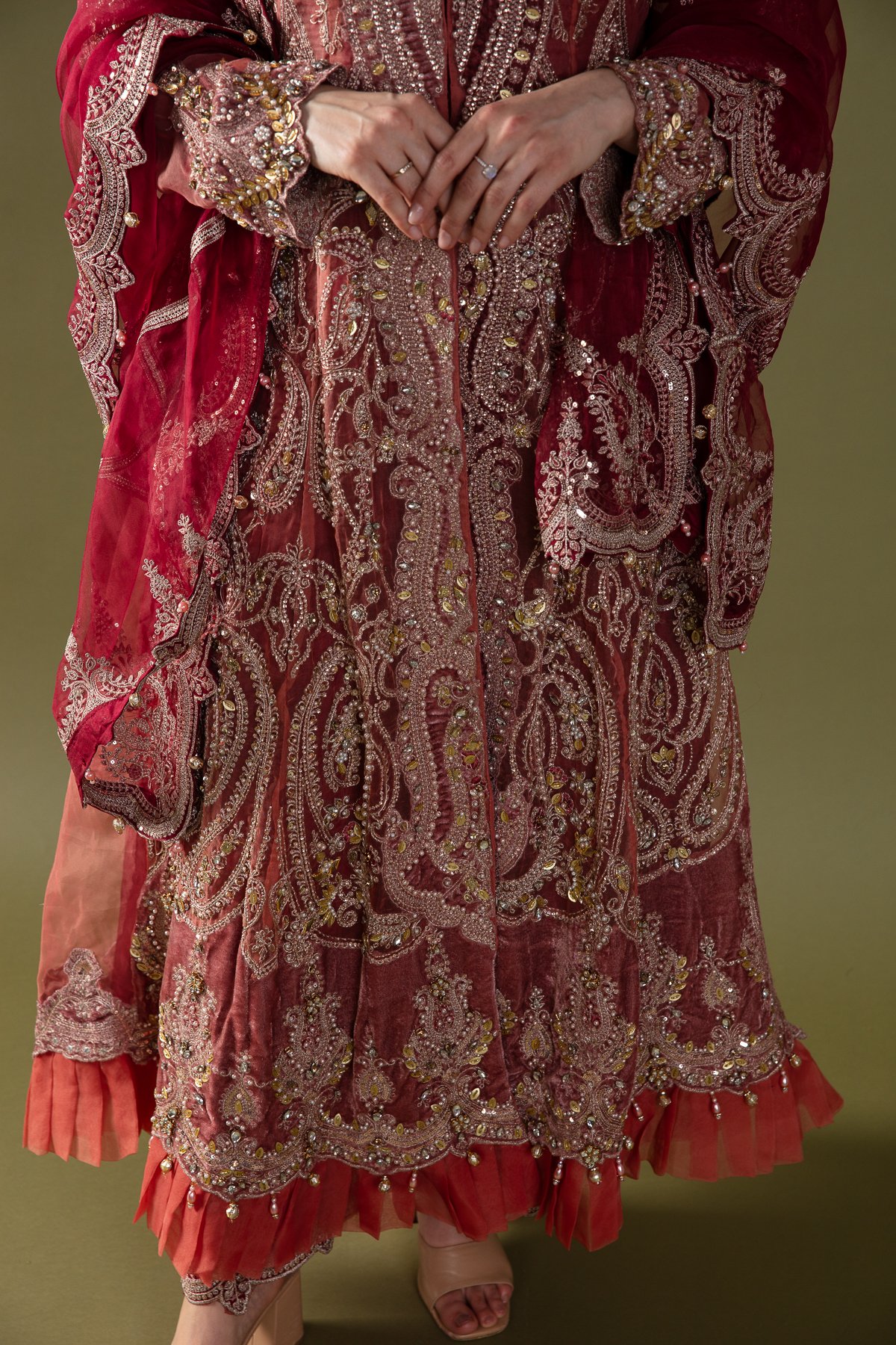 This beautiful 3 piece Maria b inspired wedding collection features an a-line shirt with luxury thread work embroidery throughout the front with beaded embellishments, finished with full length embroidered sleeves. It comes with straight leg trousers and the look is finished with a contrasted organza dupatta.