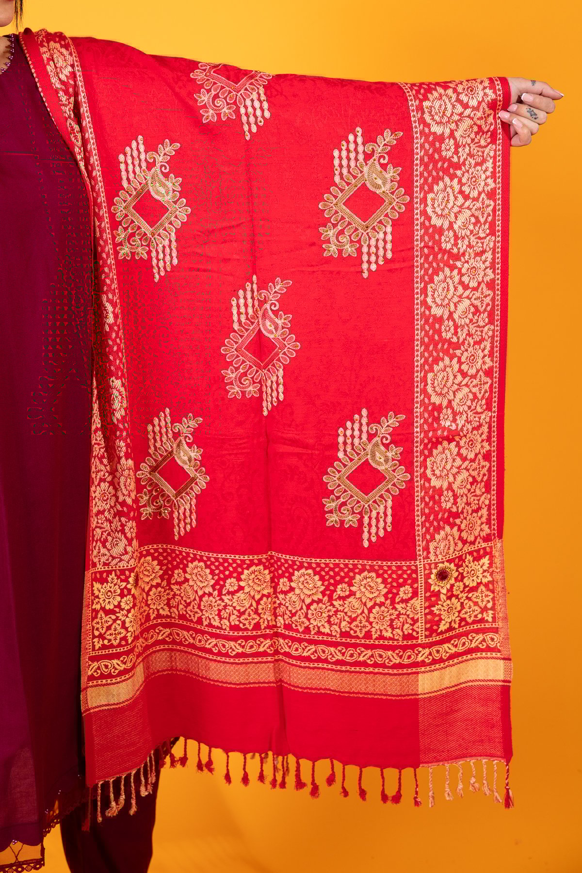 Add a touch of elegance to your wardrobe with this exquisite piece of beautifully floral embroidered shawl. Swathed with delicate weaving on border, this classic stunner is a must in your winter collection.