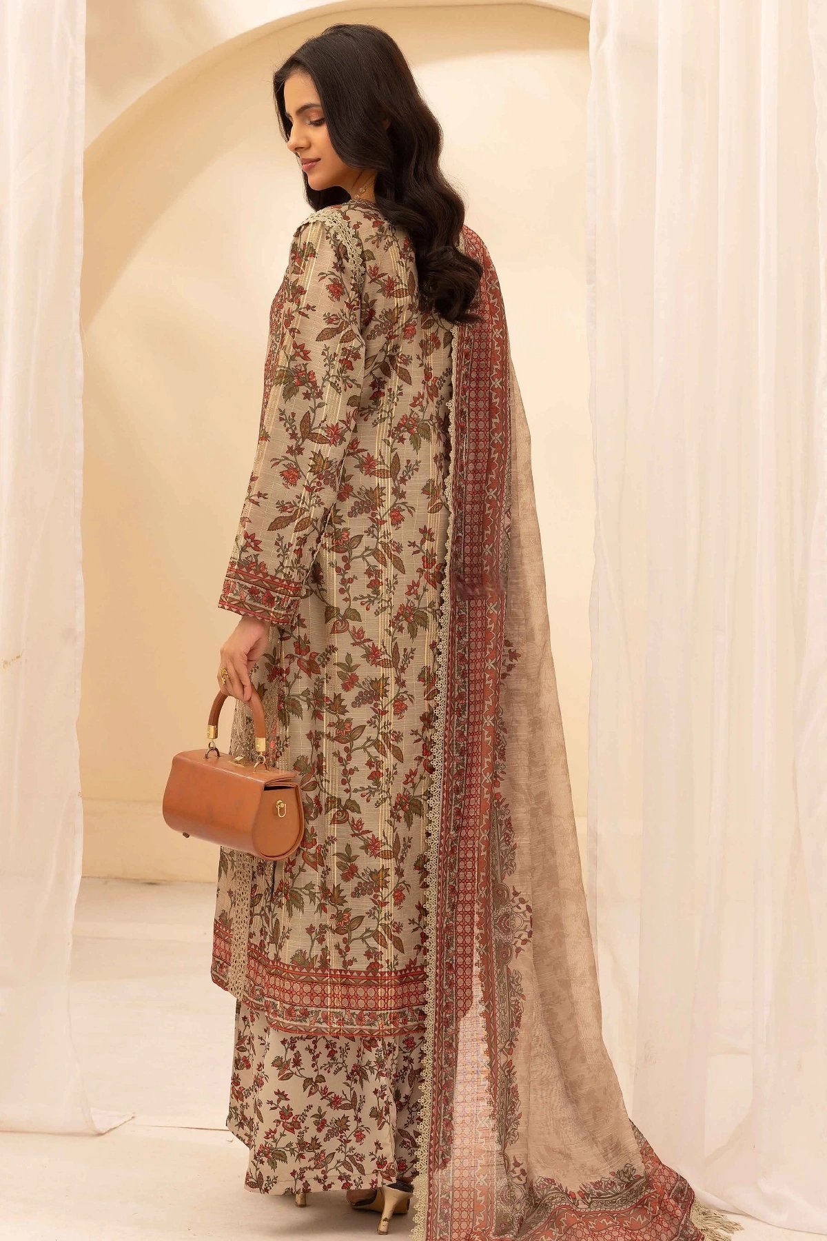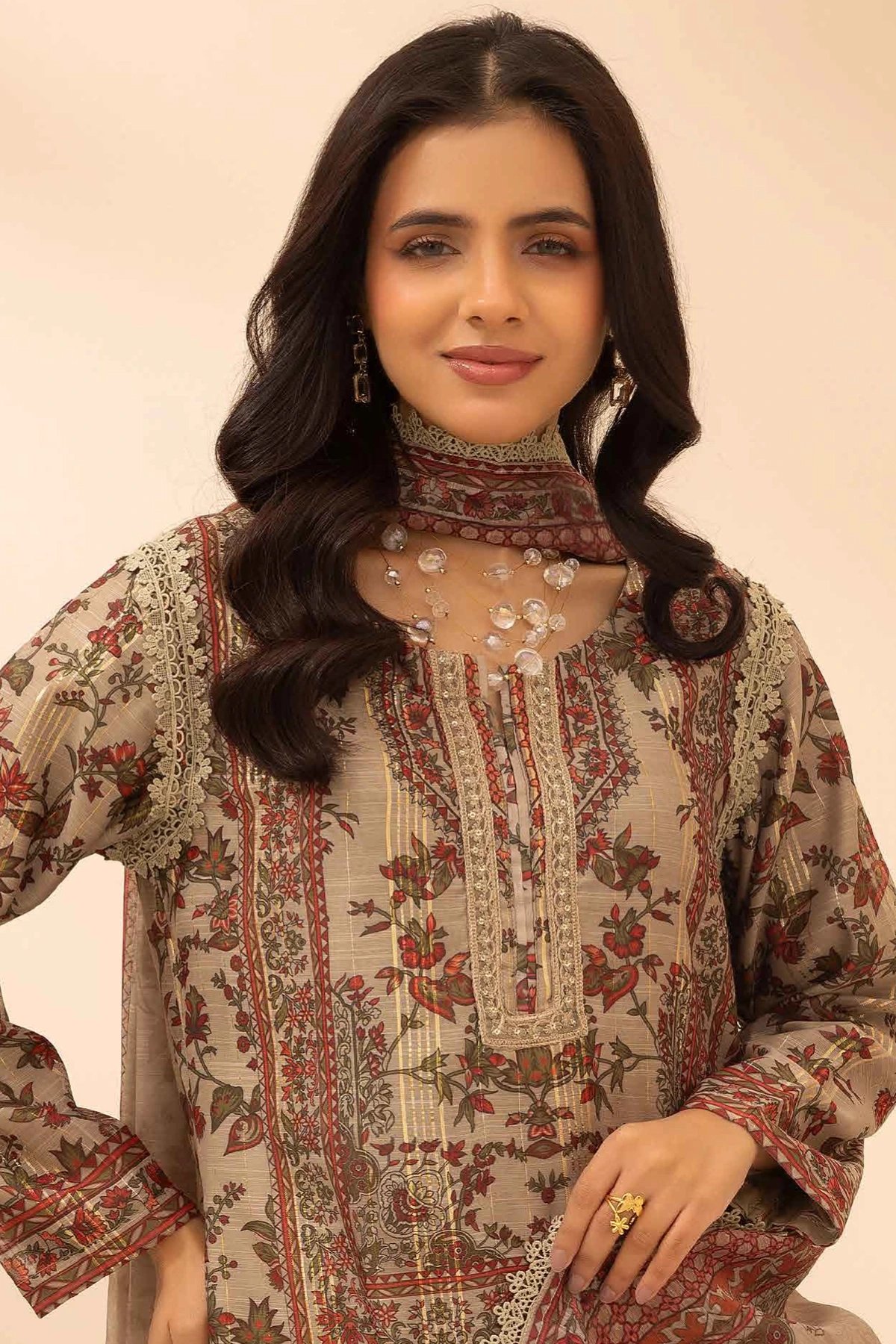 This beautiful 3 piece suit features a straight shirt adorned with intricate paisley and floral motifs in rich shades. The full length sleeve silhouette is complemented by a refined round neckline, adding a graceful touch to the overall look. Paired with matching trousers for a seamless, coordinated finish. The look is finished with a cotton net printed dupatta.