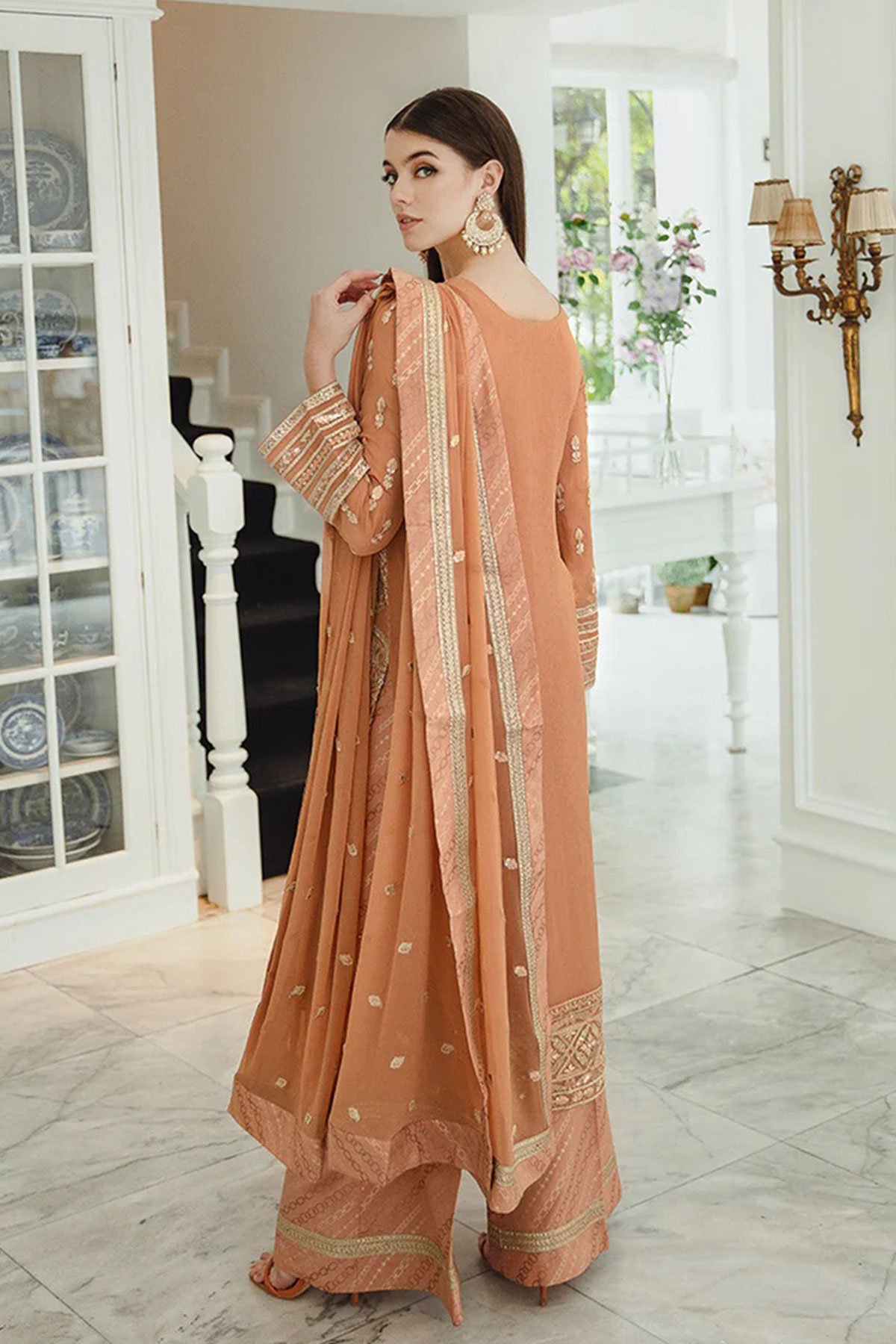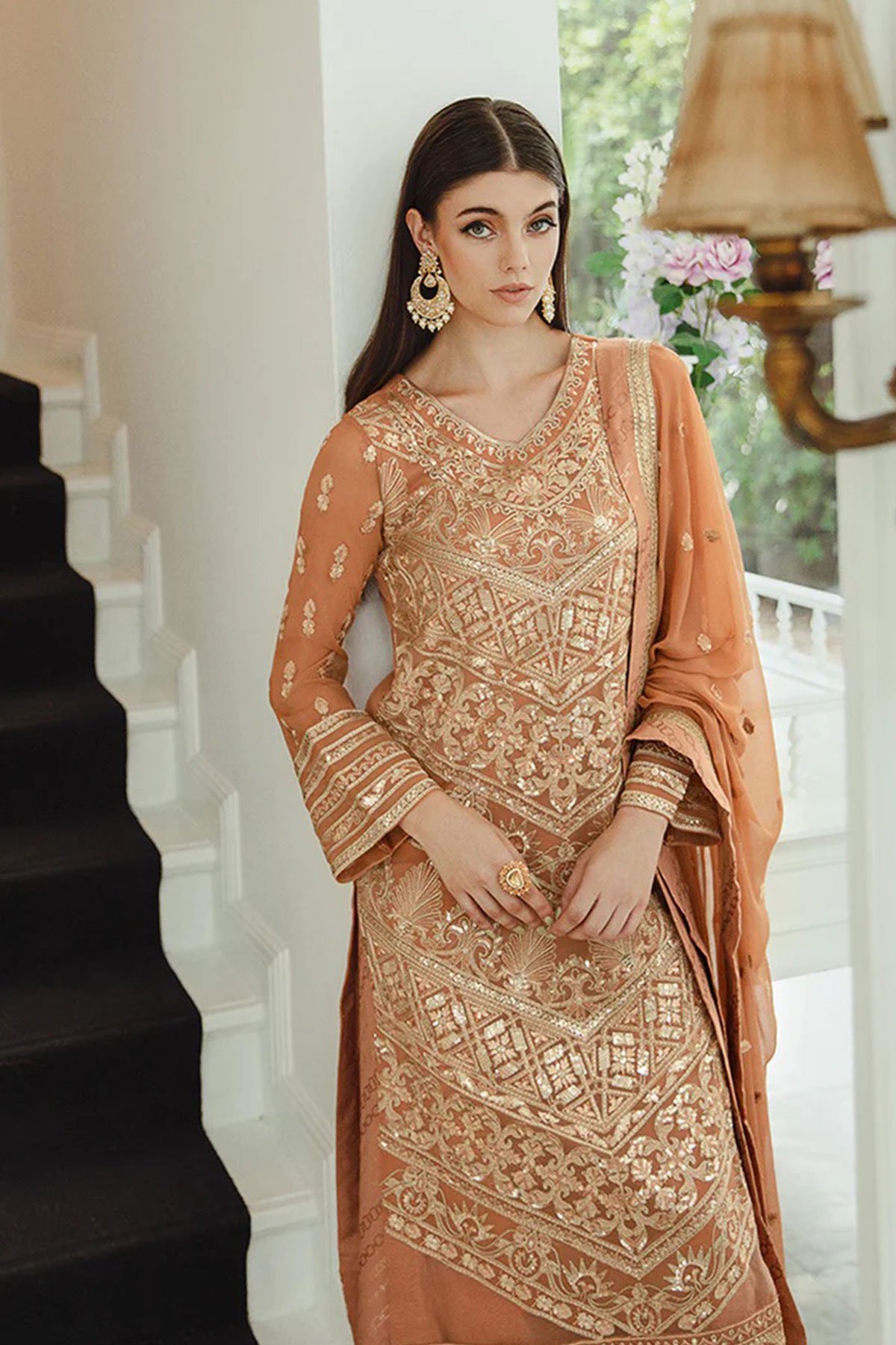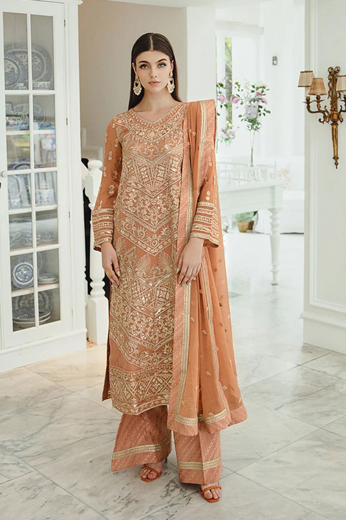 This beautiful Maryum and maria Ariya collection suit features a straight shirt with luxury thread work embroidery throughout with sequence embellishments, finished with full length embroidered sleeves. It comes with plazo trousers and the look is finished with a chiffon embroidered dupatta. Perfect design for this wedding season.