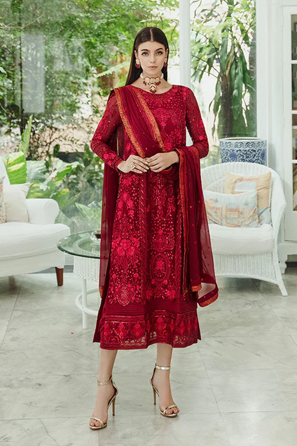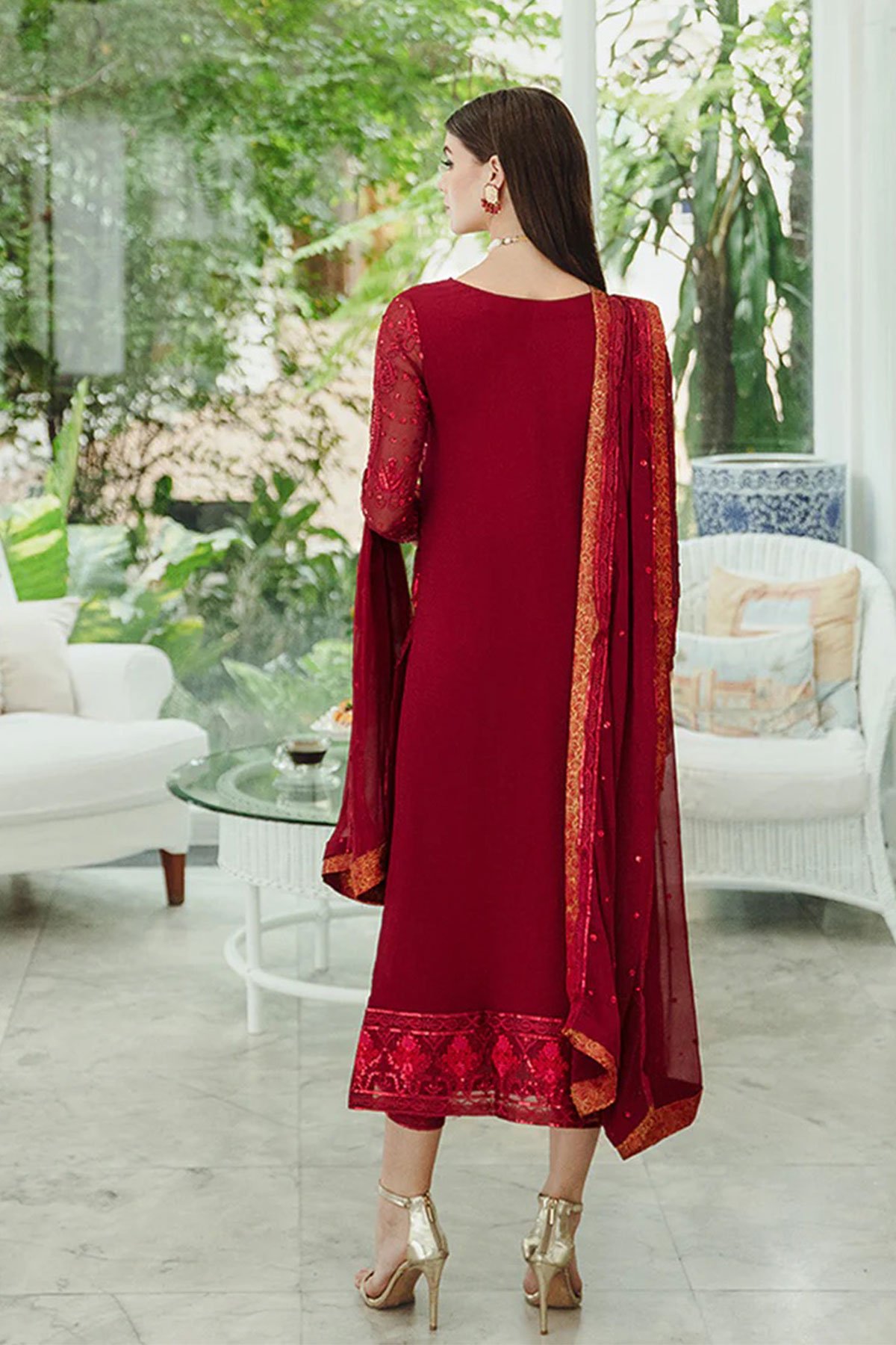 This beautiful Maryum and maria Ariya collection suit features a straight shirt with luxury thread work embroidery throughout with sequence embellishments, finished with full length embroidered sleeves. It comes with straight led trousers and the look is finished with a chiffon embroidered dupatta. Perfect design for this wedding season.