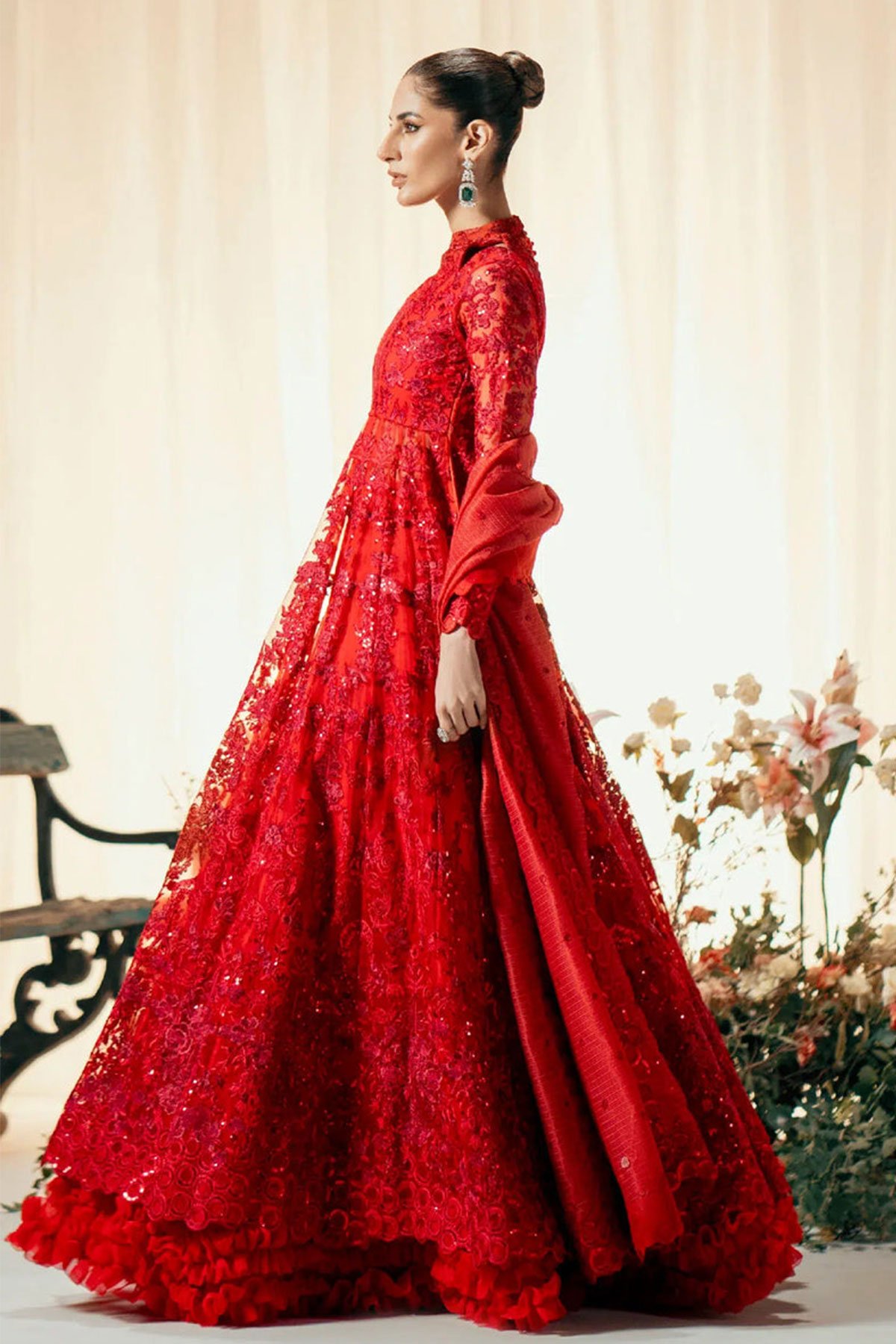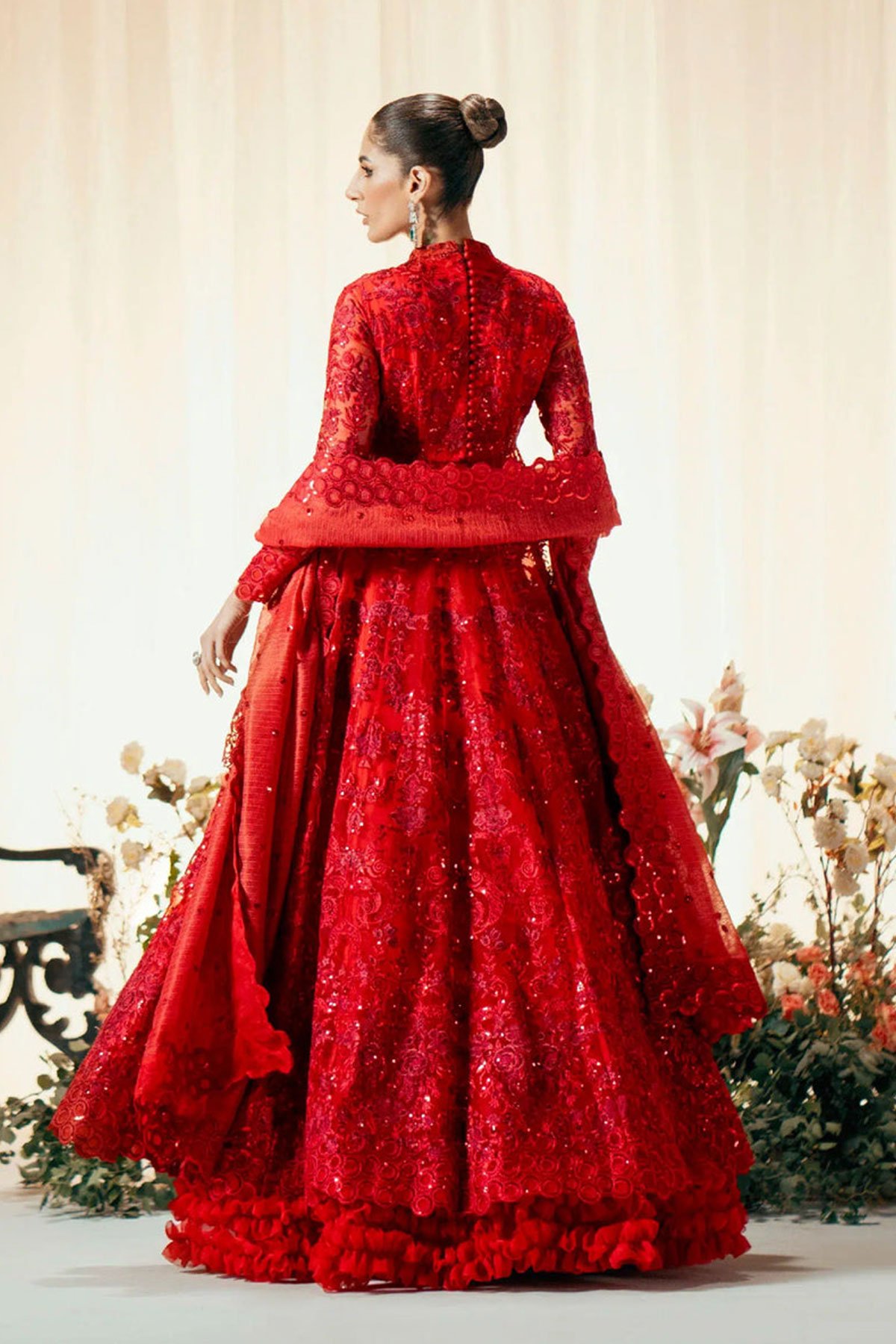 This beautiful 3 piece Maryum and Maria suit features a long organza gown with luxury thread work embroidery throughout the front, back and full length sleeves. Button embellishments on the back enhance the dress, its finished with a cotton silk lengha with cancan attached underneath. The look is finished with an organza embroidered dupatta.