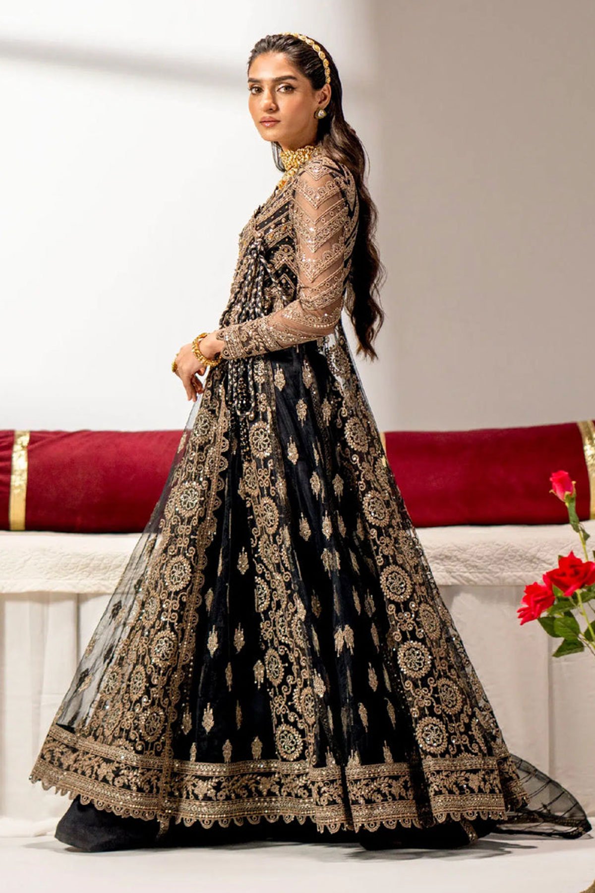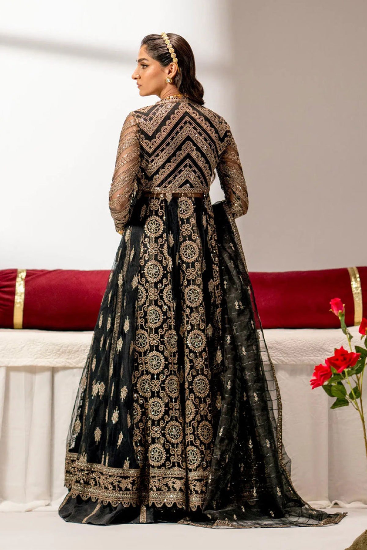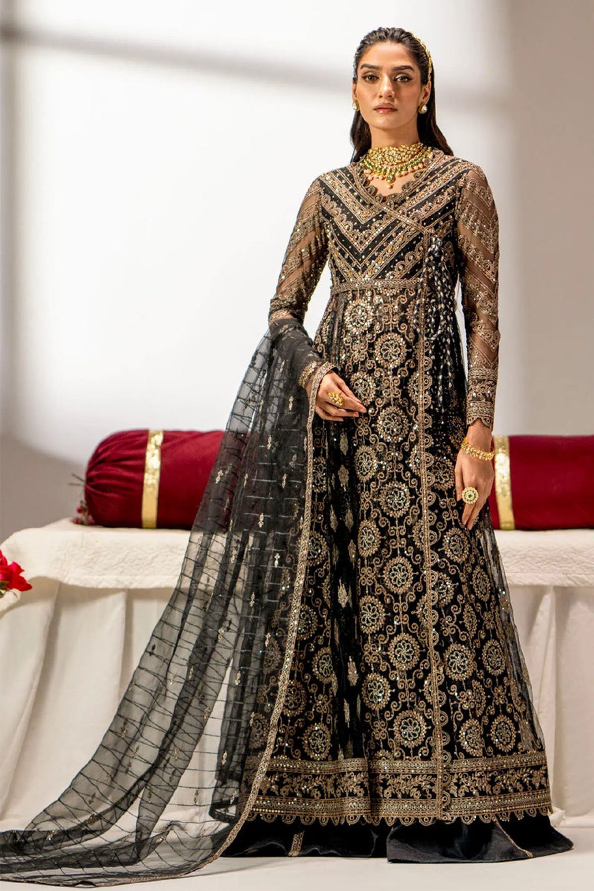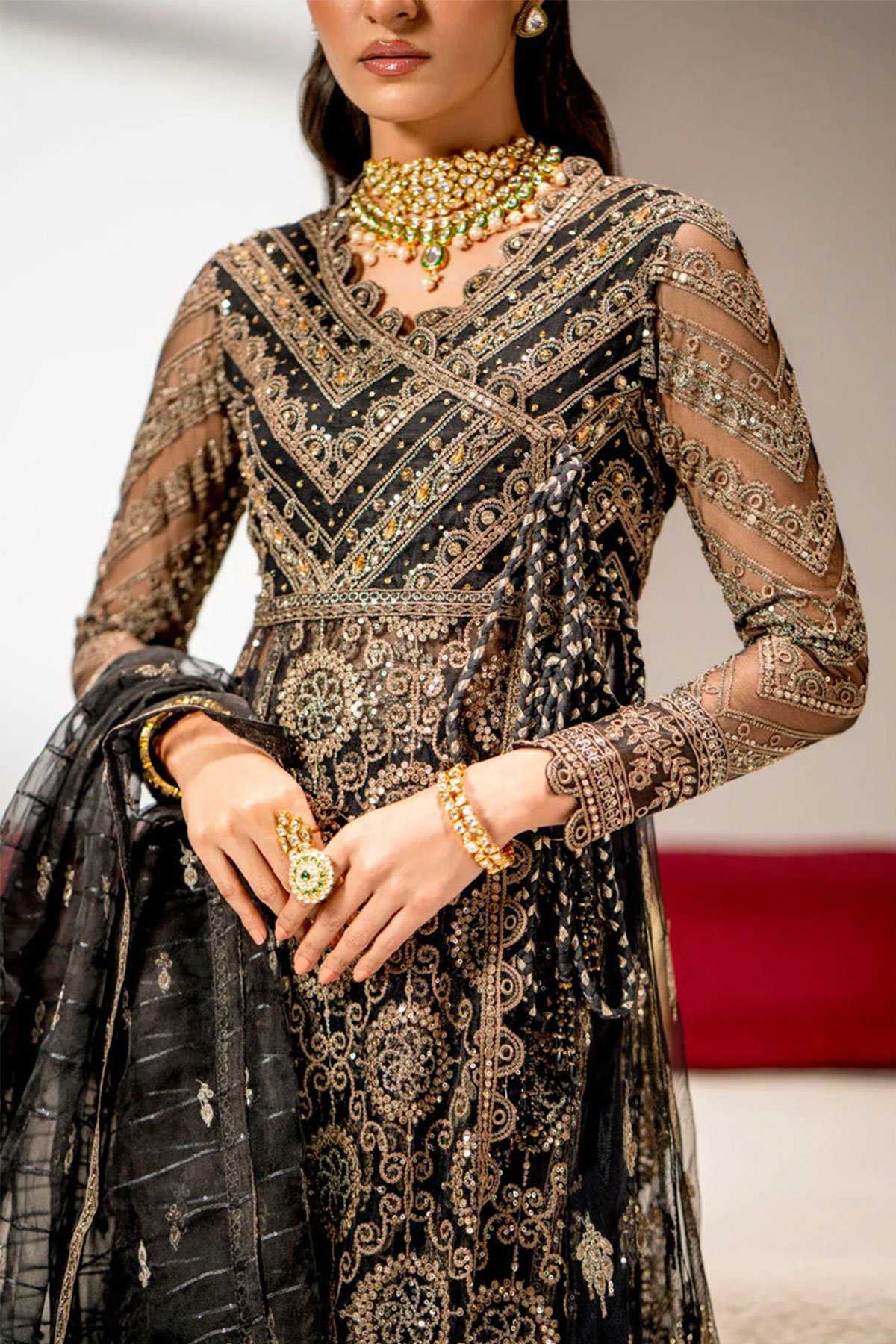 This beautiful 3 piece Maryum and Maria suit features a long organza angrakha style peplum dress with luxury thread work embroidery throughout with sequence embellishment, finished with full length embroidered sleeves. It comes with straight leg trousers and the look is finished with a net embroidered dupatta. Note: Above catalogue pictures are for design reference only.