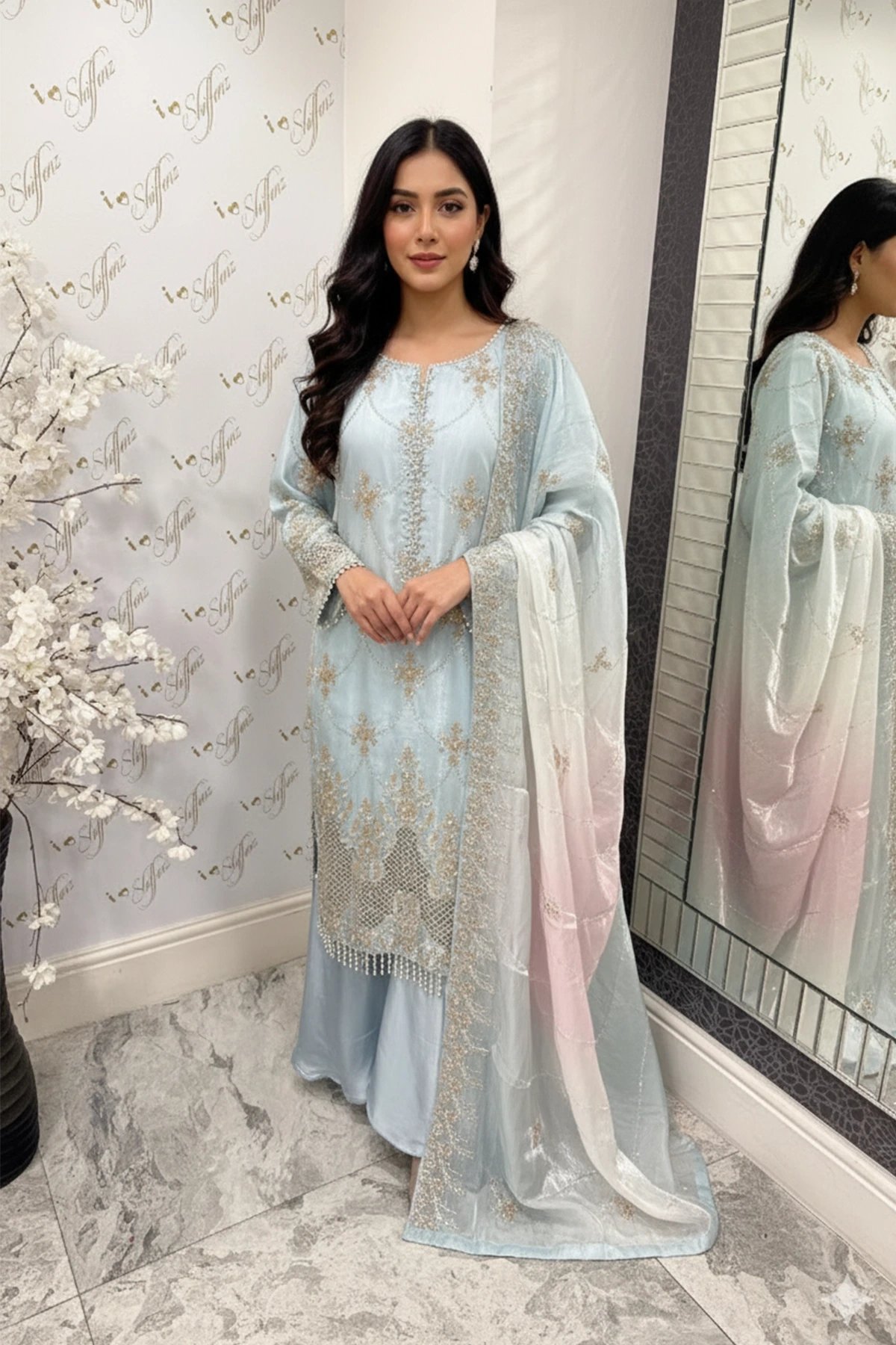 This beautiful 3-piece long shirt suit is crafted from luxurious silk tissue, adorned with delicate sequins and intricate bead work for a refined look. The long shirt is paired with sleek silk plazo trousers, offering both elegance and comfort. Completing the ensemble is a matching silk tissue dupatta, embellished with coordinating sequins and bead work for a graceful finish. Making it perfect for festive occasions and this Eid.