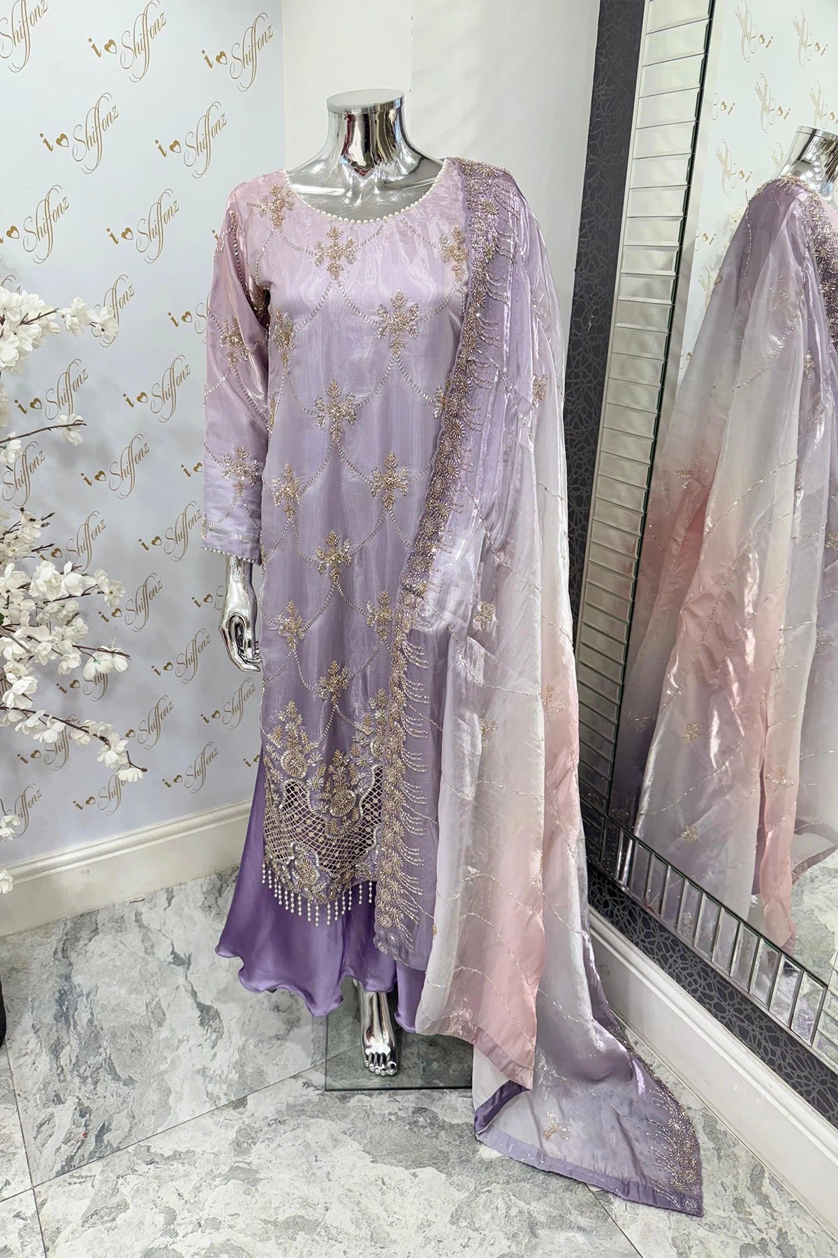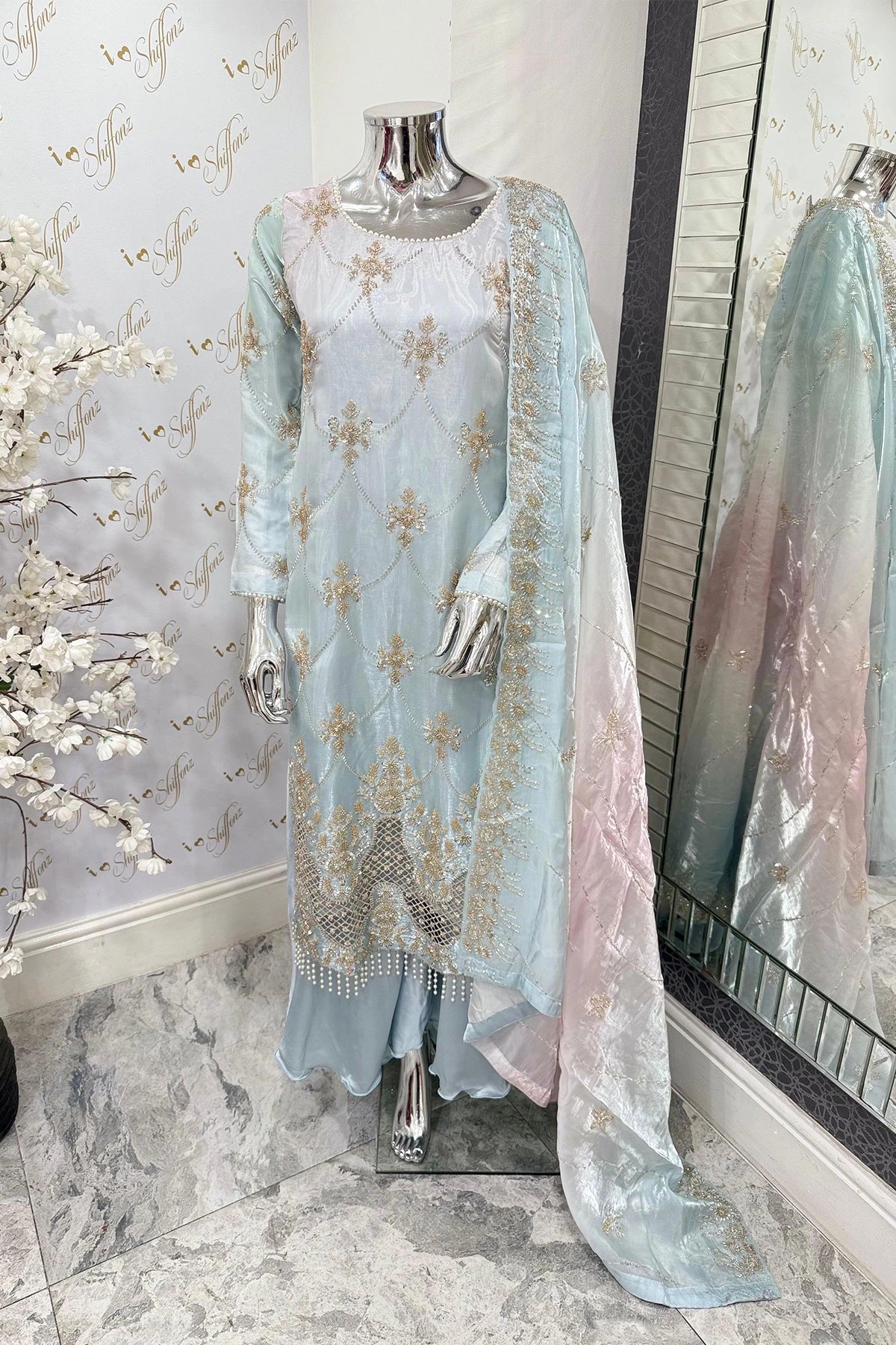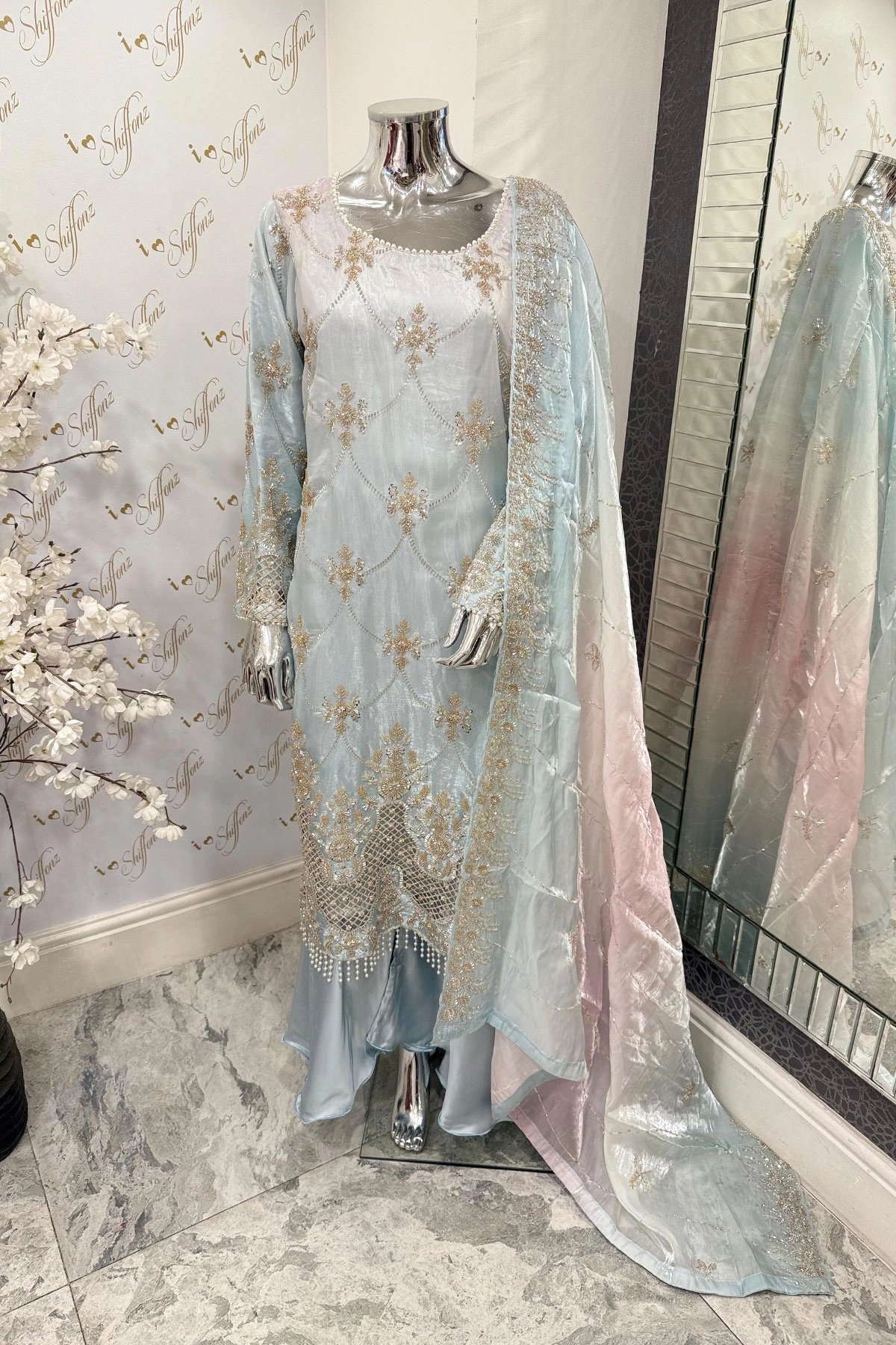 This beautiful 3-piece long shirt suit is crafted from luxurious silk tissue, adorned with delicate sequins and intricate bead work for a refined look. The long shirt is paired with sleek silk plazo trousers, offering both elegance and comfort. Completing the ensemble is a matching silk tissue dupatta, embellished with coordinating sequins and bead work for a graceful finish. Making it perfect for festive occasions and this Eid.