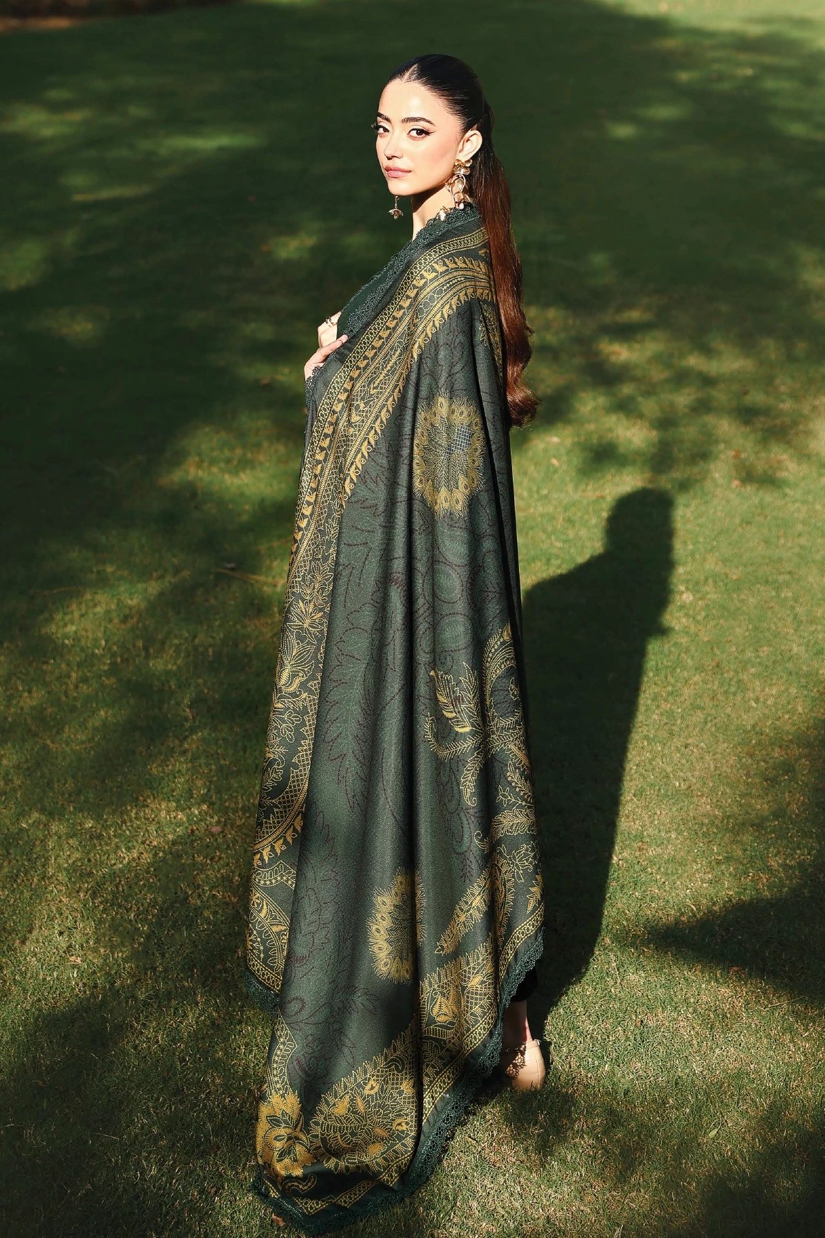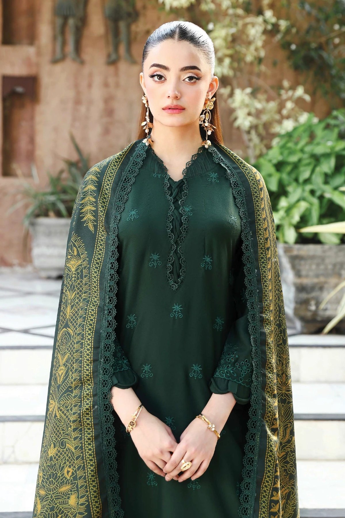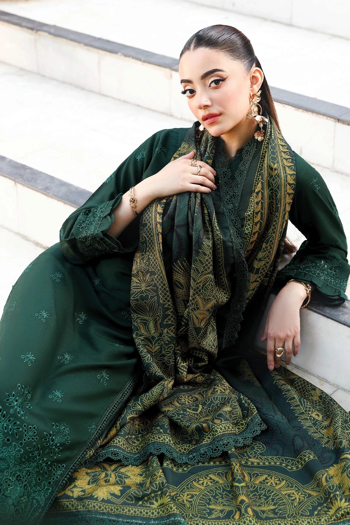 This beautiful 3 piece winter collection features a straight shirt with luxury thread work embroidery along with sequence embellishments, finished with full length embroidered sleeves. Paired with straight leg trousers and the look is finished with a printed wool shawl.