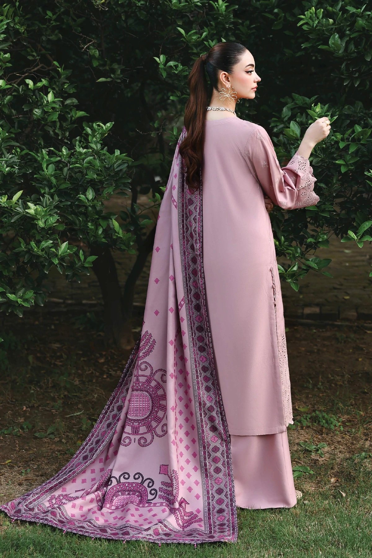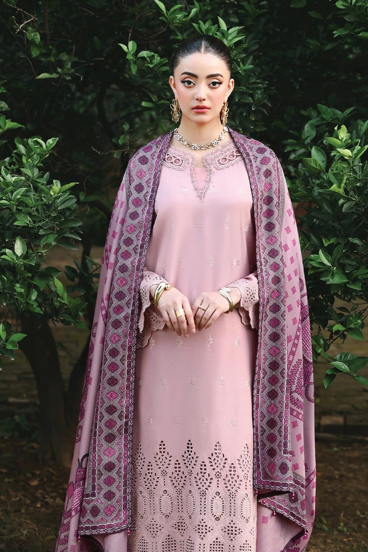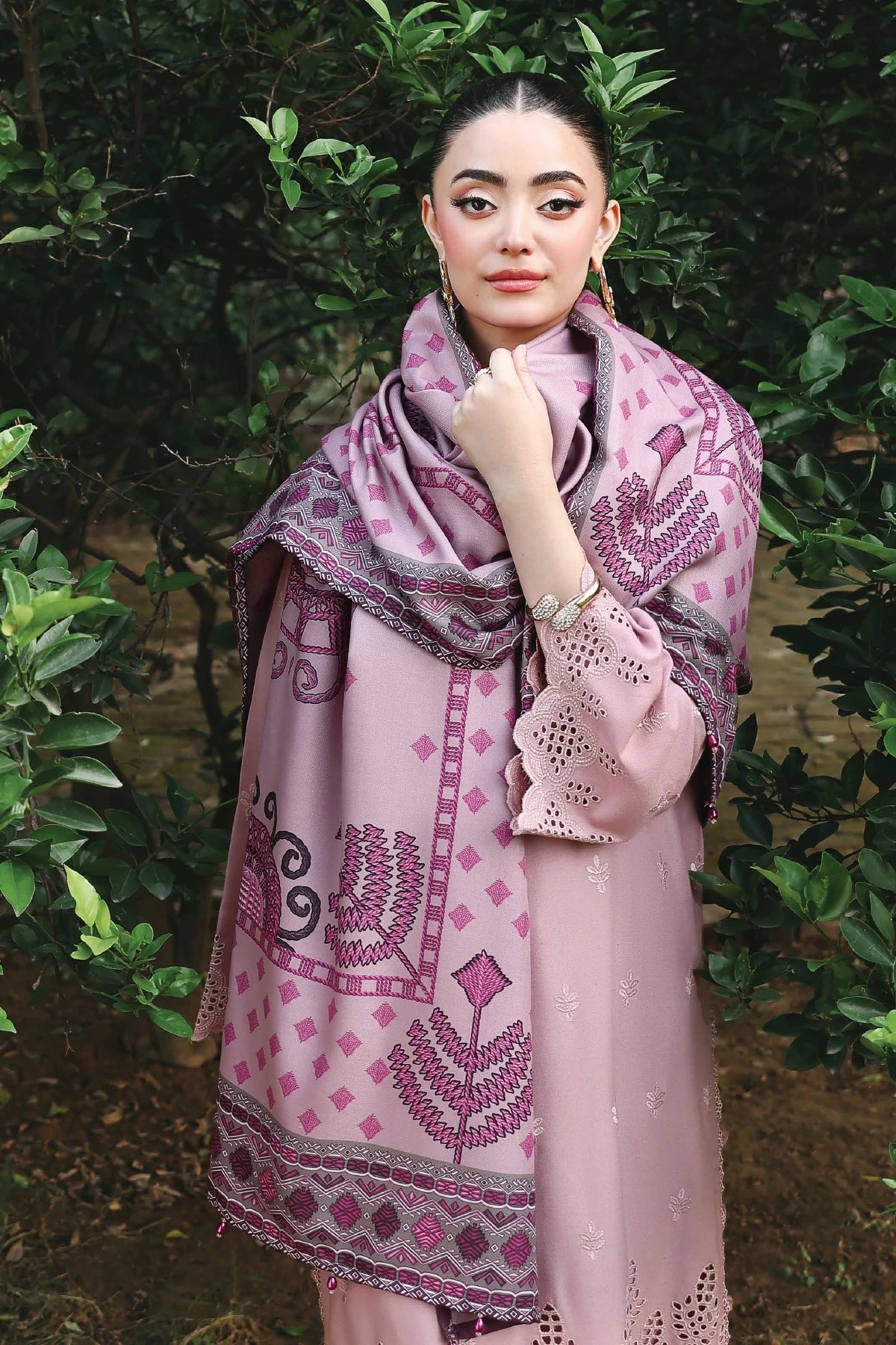 This beautiful 3 piece winter collection features a straight shirt with luxury thread work embroidery along with sequence embellishments, finished with full length embroidered sleeves. Paired with straight leg trousers and the look is finished with a printed wool shawl.