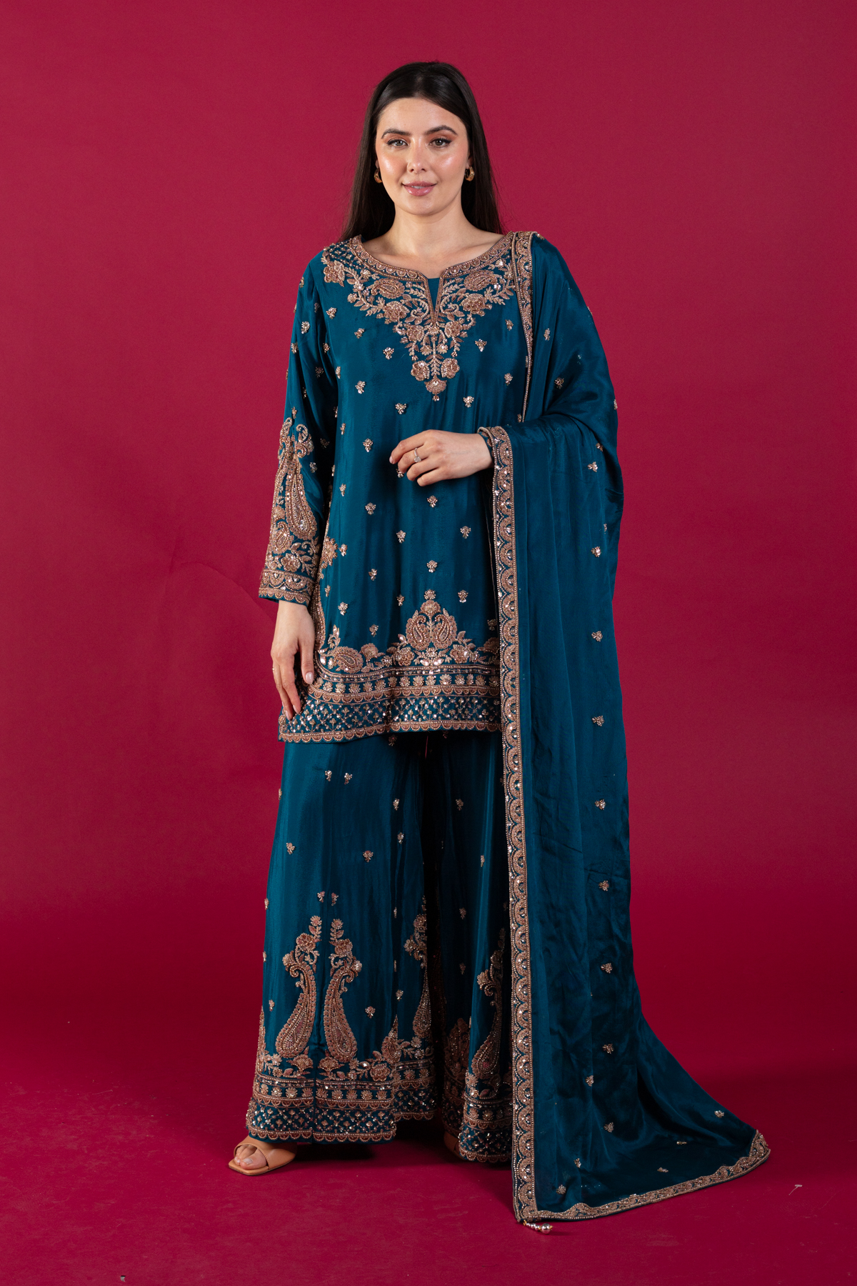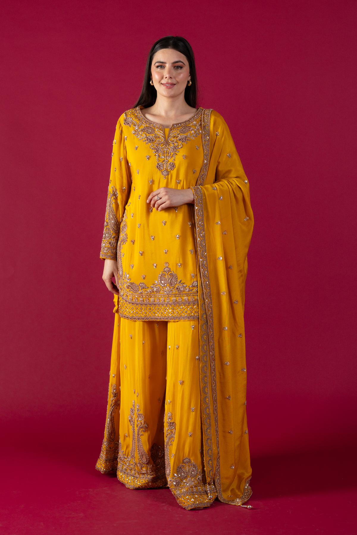 This beautiful 3 piece chiffon suit features a straight shirt with luxury thread work embroidered patterns in between the luxury bead work embellishments, finished with full length embroidered sleeves. Paired with a luxury embroidered sharara and the look is finished with a chiffon embroidered dupatta.