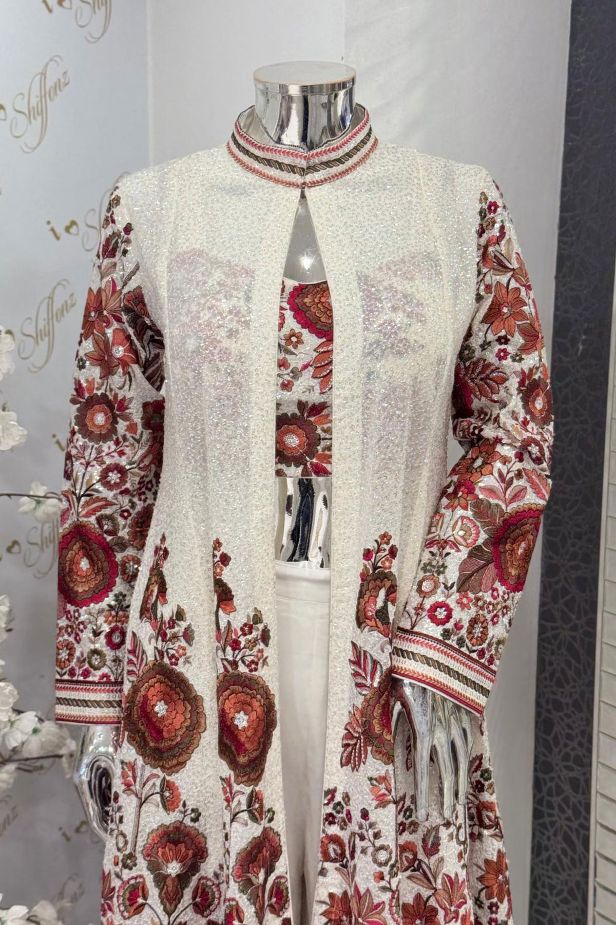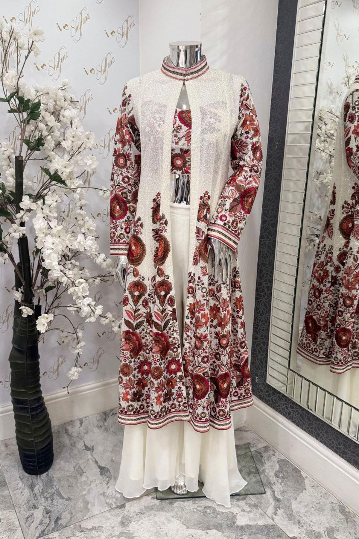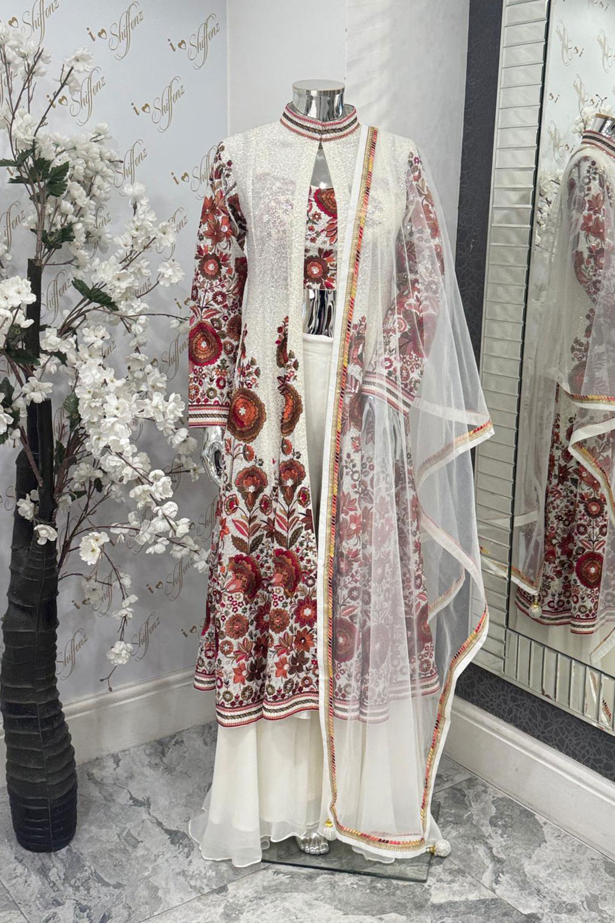 This beautiful 3 piece chiffon suit features a crop embroidered top along with a luxury thread work embroidered a-line jacket with full length embroidered sleeves. Paired with a chiffon sharara and the look is finished with a net dupatta with an embroidered border.