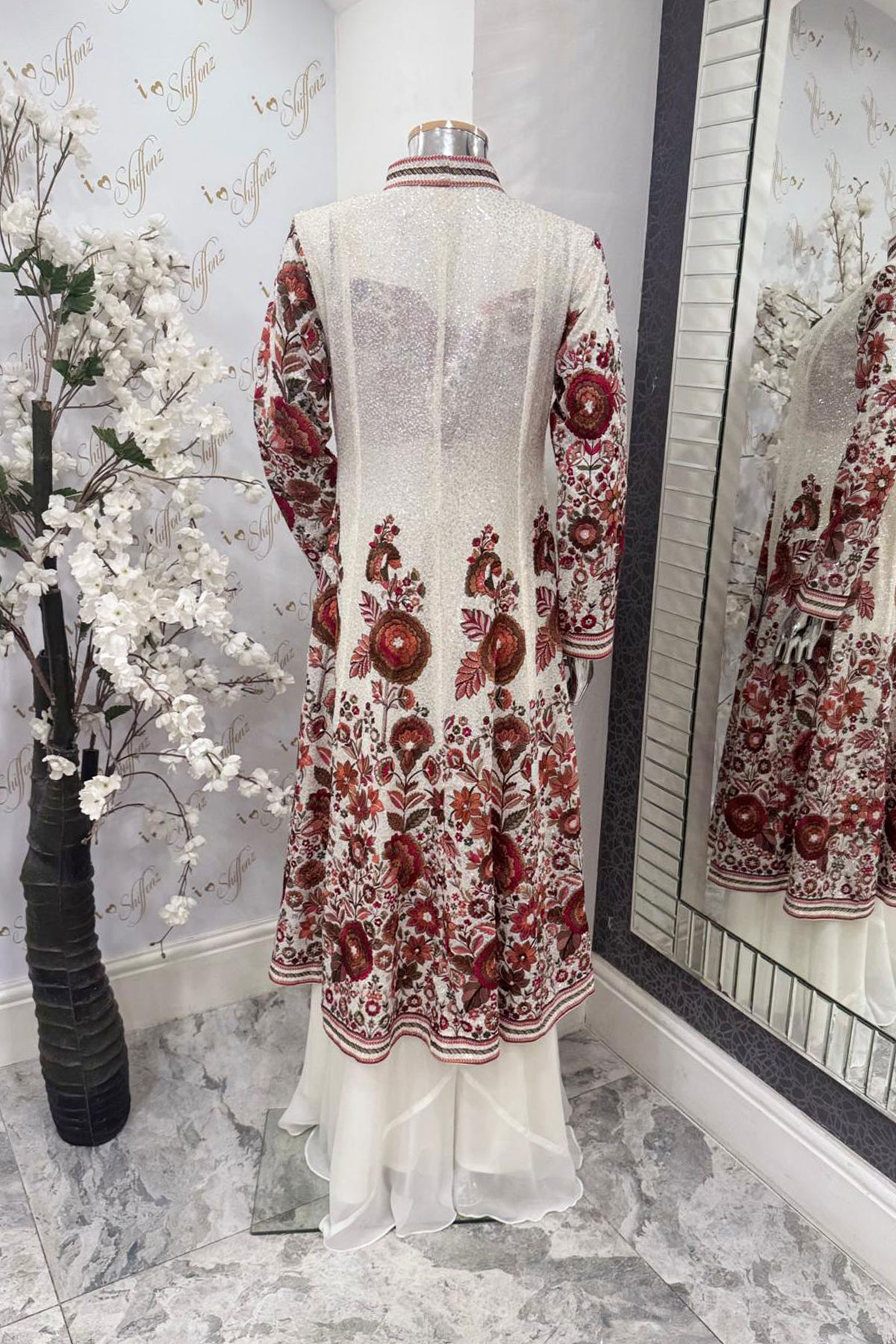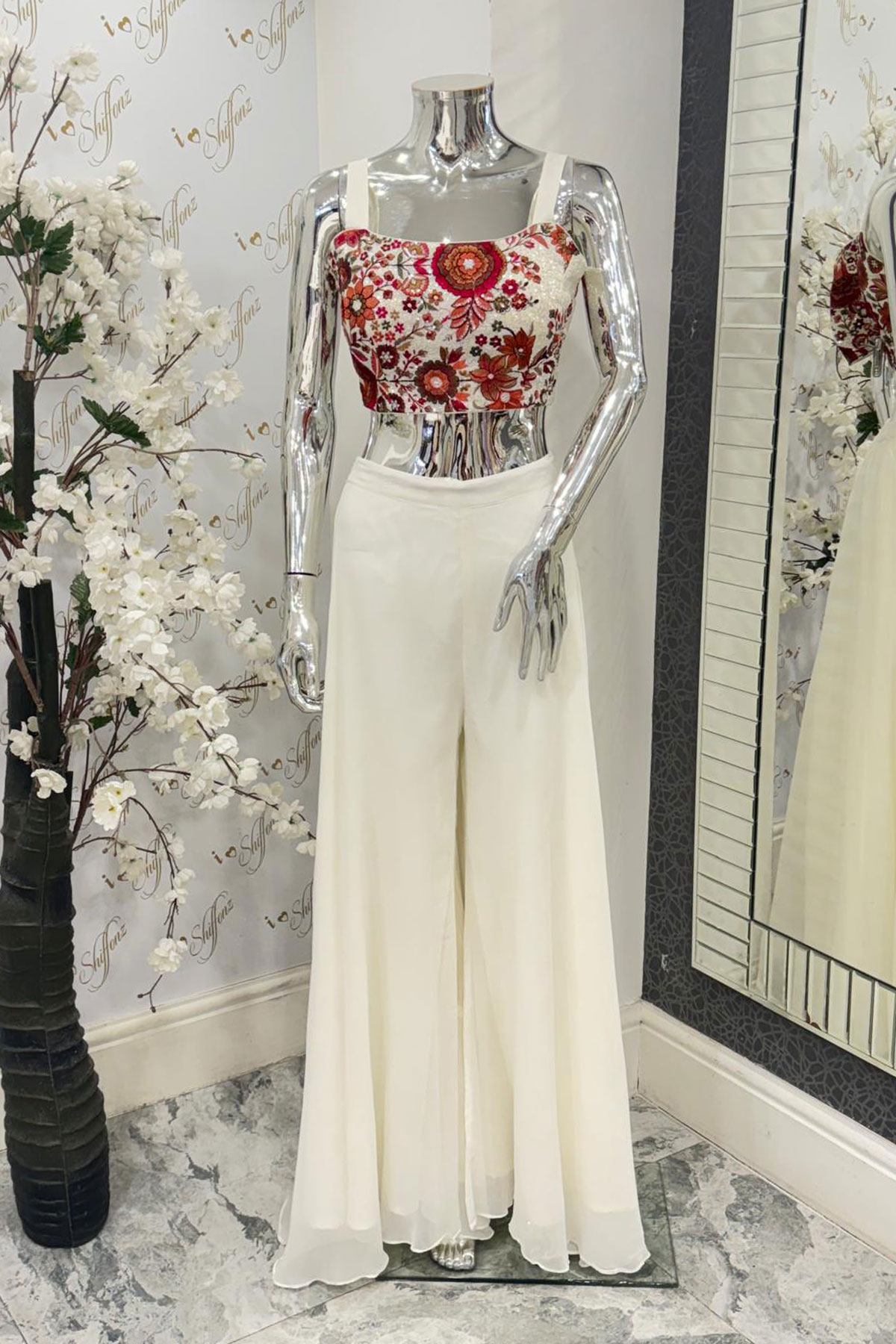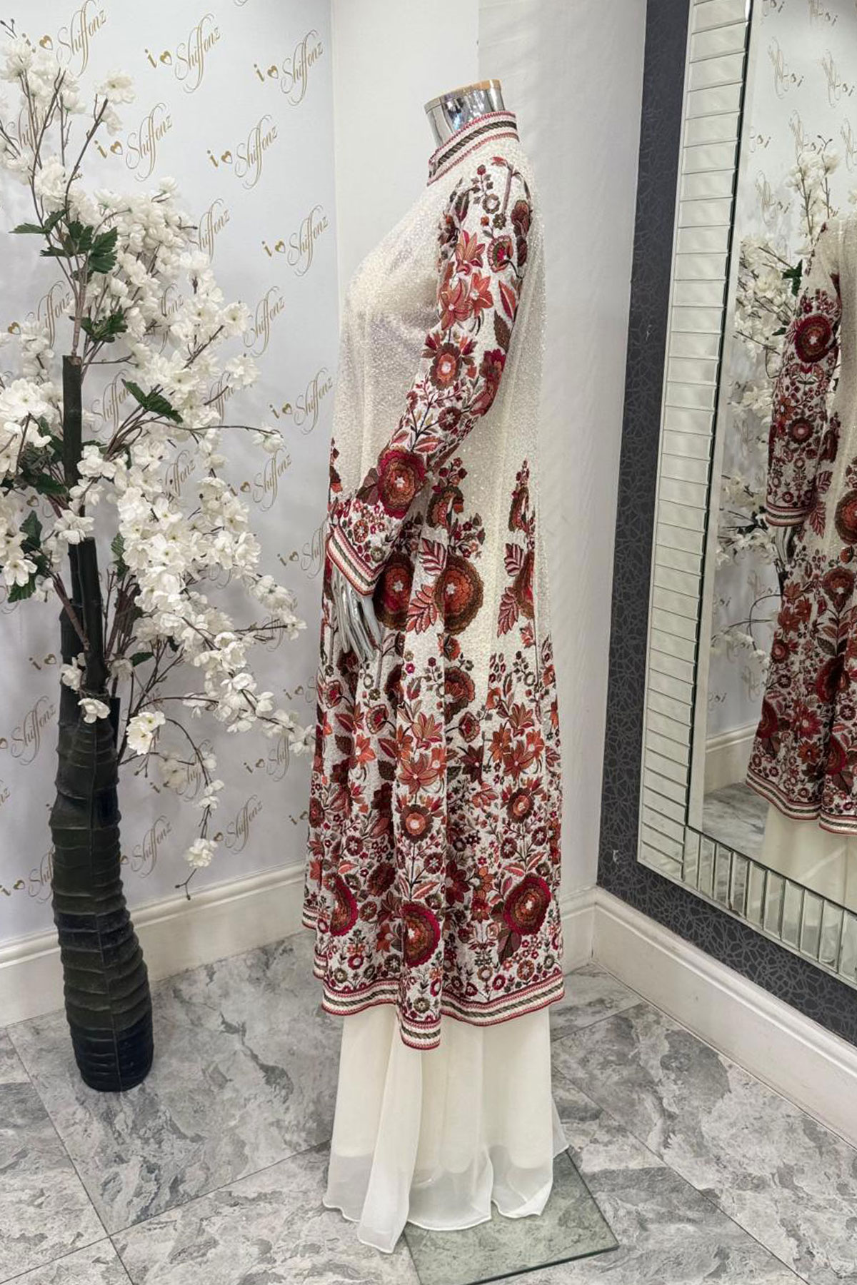 This beautiful 3 piece chiffon suit features a crop embroidered top along with a luxury thread work embroidered a-line jacket with full length embroidered sleeves. Paired with a chiffon sharara and the look is finished with a net dupatta with an embroidered border.
