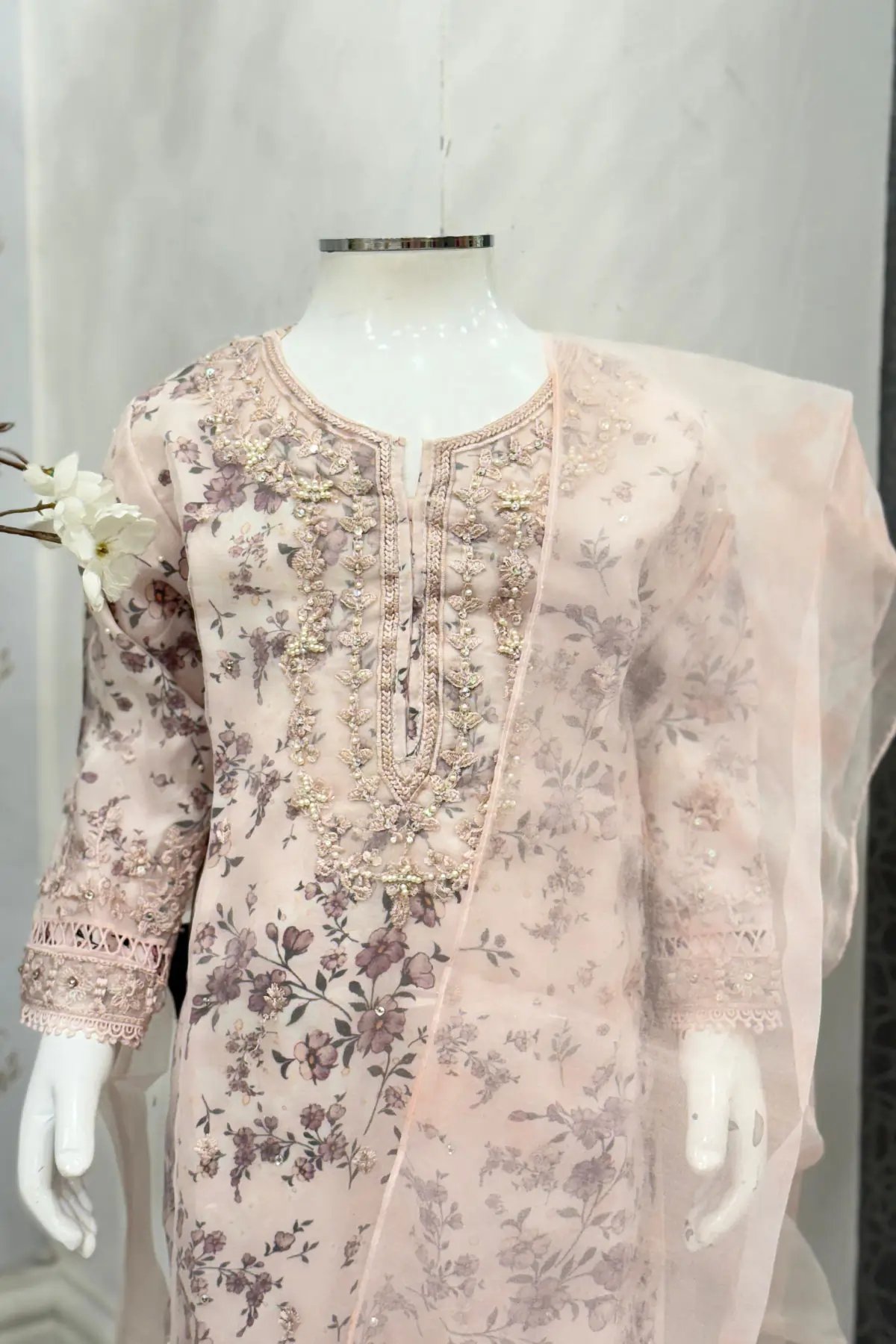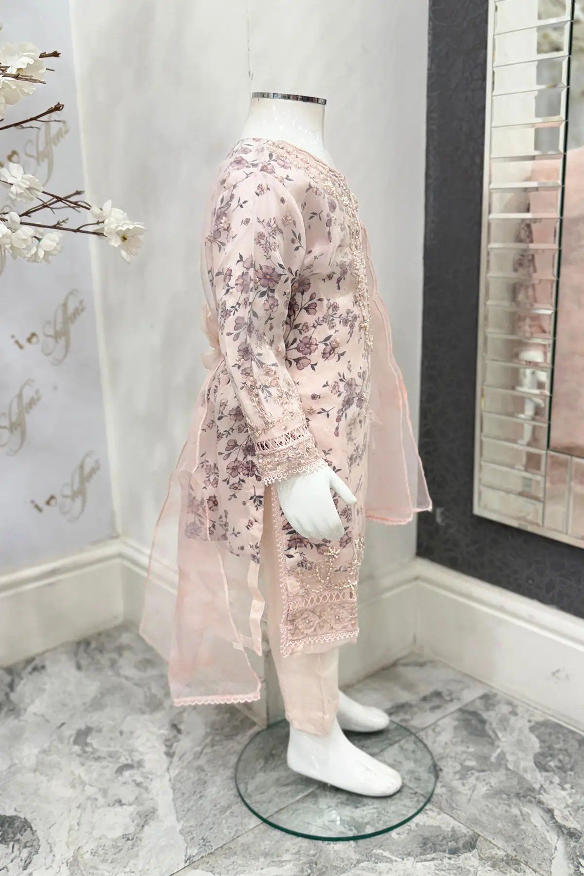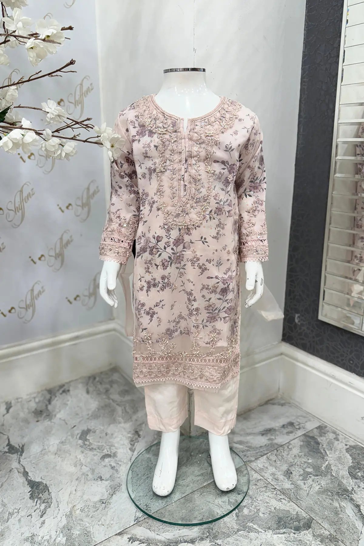 This beautiful 3 piece Mehrunisa kids collection features a straight printed shirt with thread work embroidered front, finished with an organza embroidered border, It comes with full length sleeves with embroidered cuffs. Paired with straight leg trousers and the look is finished with an embroidered organza dupatta.