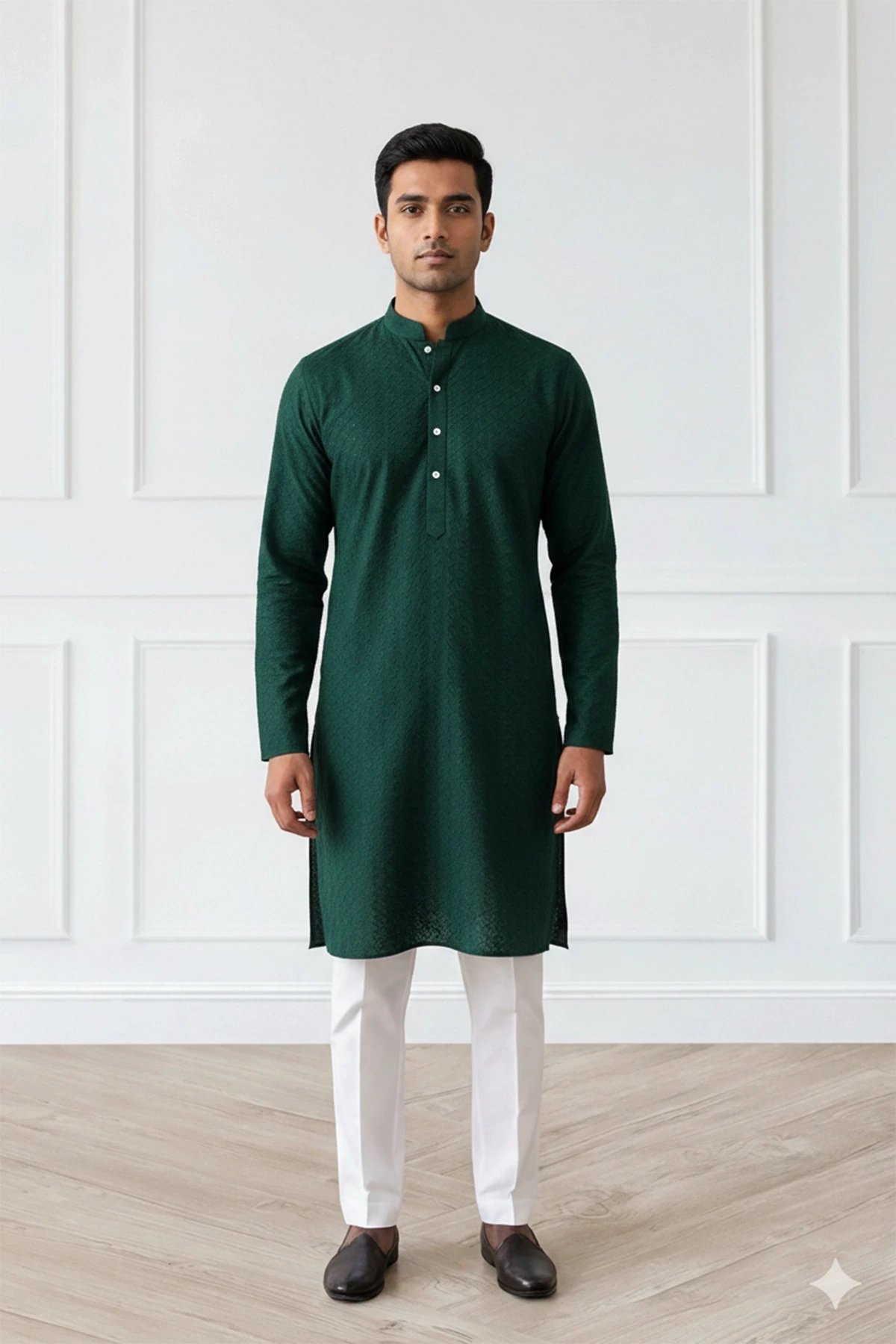 This sophisticated kurta set is crafted from premium chikan kariĀ  fabric featuring intricate tone-on-tone embroidery throughout the body. Designed with a contemporary slim fit, it features a classic mandarin collar and a refined button-down placket adorned with detailed metallic buttons. The look is finished with a cotton churidar trouser.