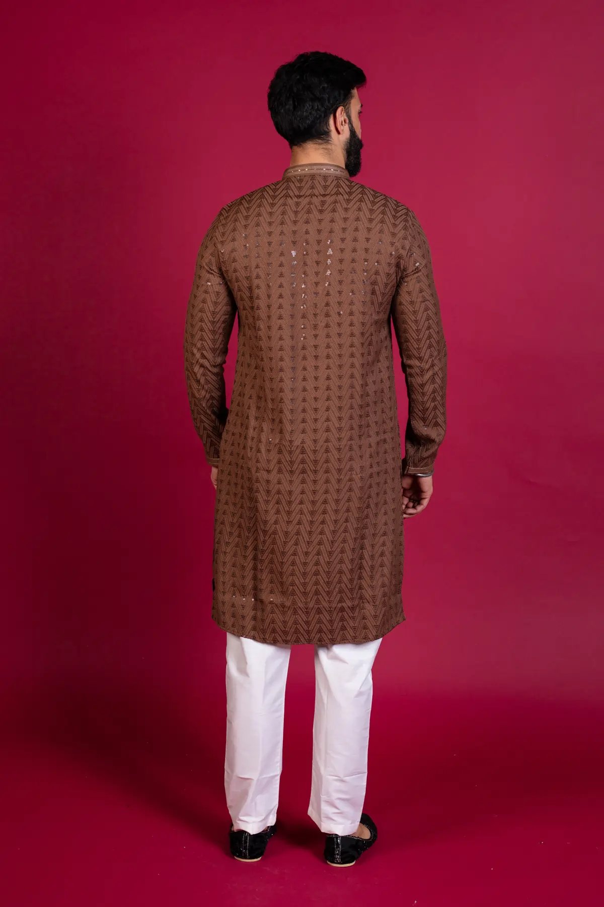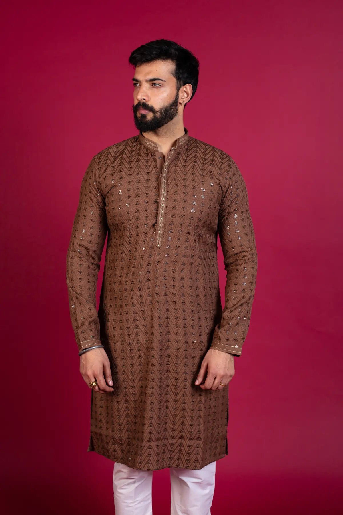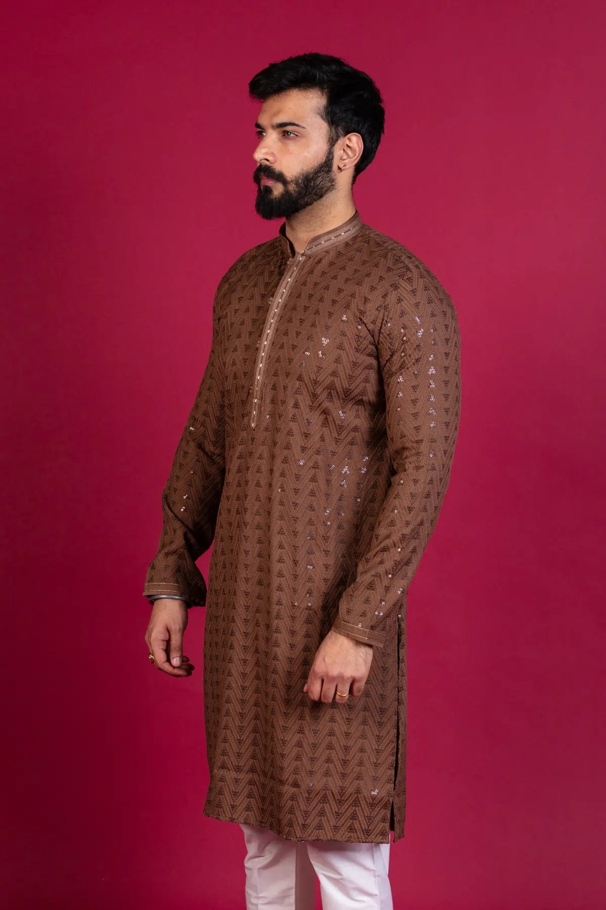 Elevate your ethnic wardrobe with this string patterned kurta set, featuring intricate thread work and sequence embellishment that adds a touch of sparkle. The delicate string patterns provide a sophisticated texture, making this kurta set a refined choice for any festive occasion. Complete the look with raw silk trousers.