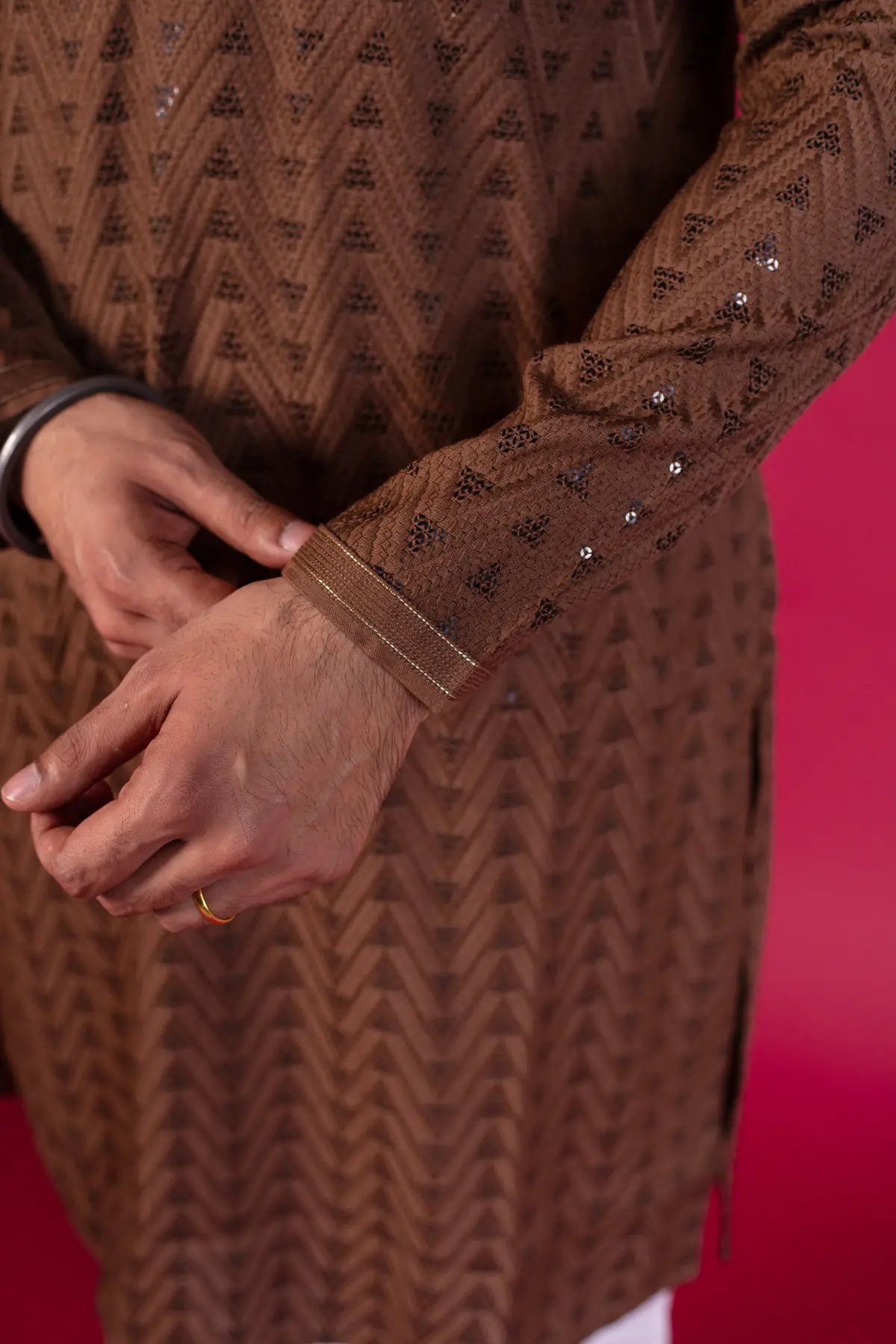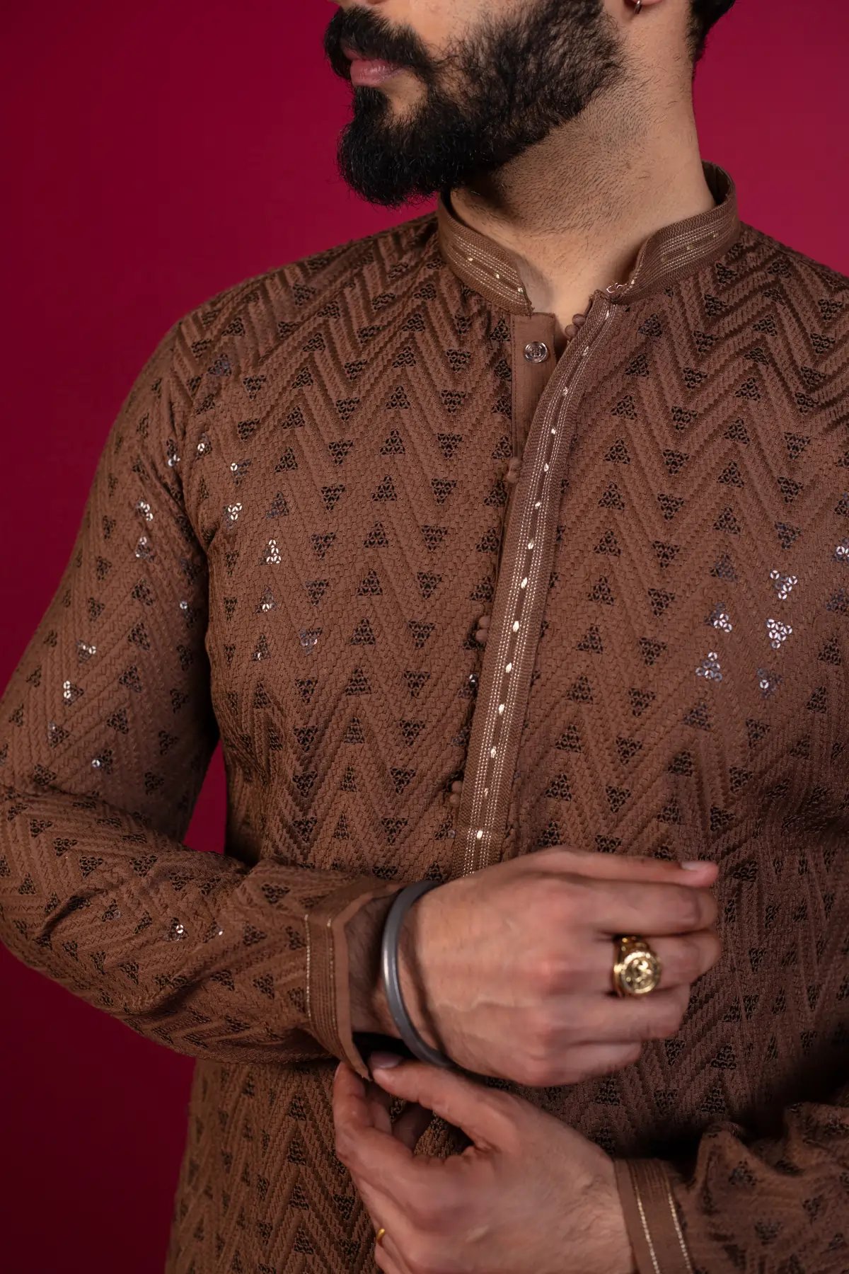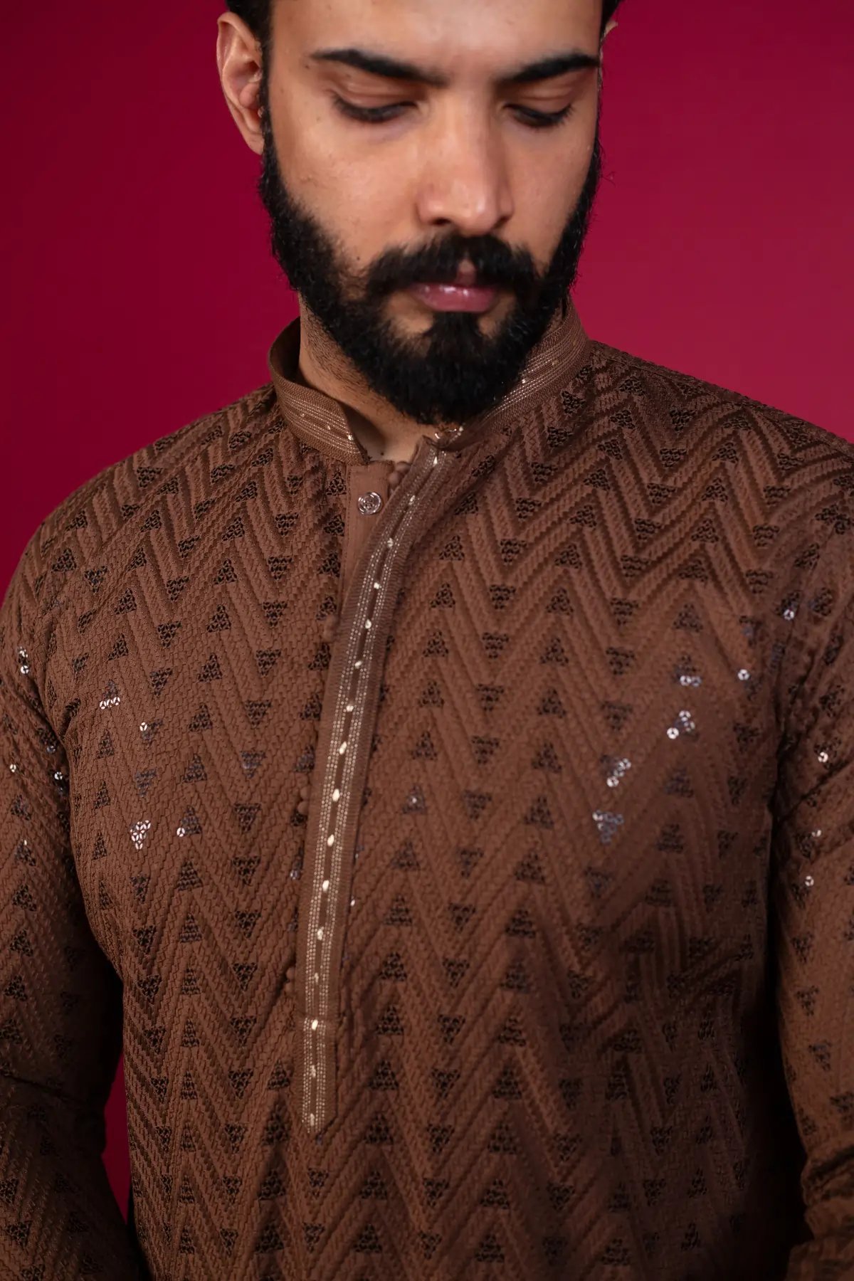 Elevate your ethnic wardrobe with this string patterned kurta set, featuring intricate thread work and sequence embellishment that adds a touch of sparkle. The delicate string patterns provide a sophisticated texture, making this kurta set a refined choice for any festive occasion. Complete the look with raw silk trousers.