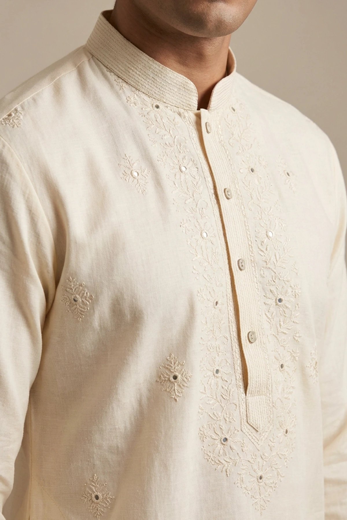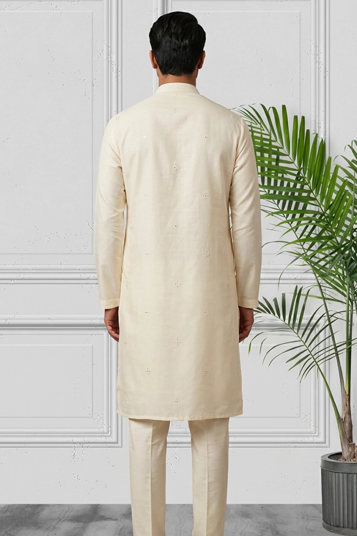 This classic cream kurta trouser set features a clean, minimal design crafted in a soft, smooth fabric for a refined and comfortable feel. The kurta is tailored in a straight, knee-length silhouette with a band collar, half-button placket, full sleeves, and subtle self-embroidery detailing across the front for an elegant touch. Paired with slim-fit matching trousers, the ensemble offers a timeless and versatile look perfect for festive, formal, and everyday occasions. Note: Design details and embellishments may vary slightly from the imagery shown.