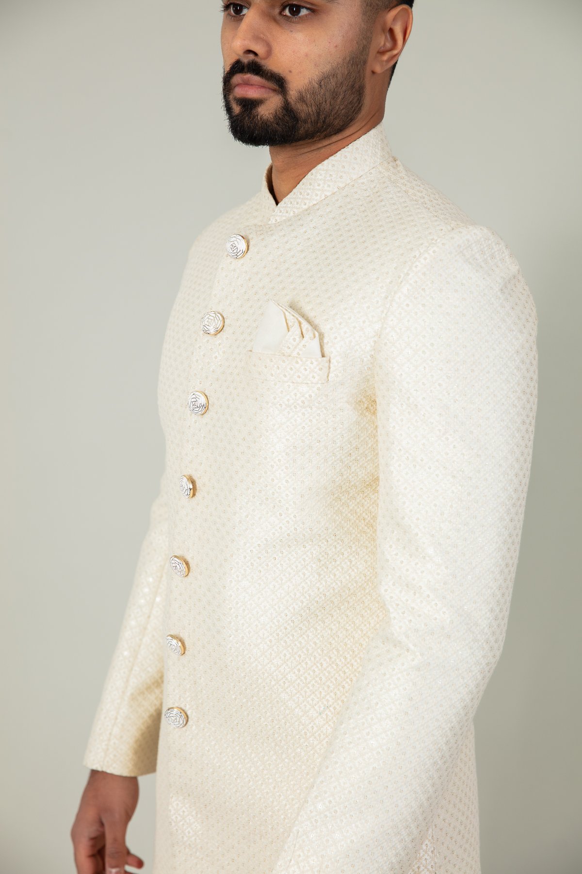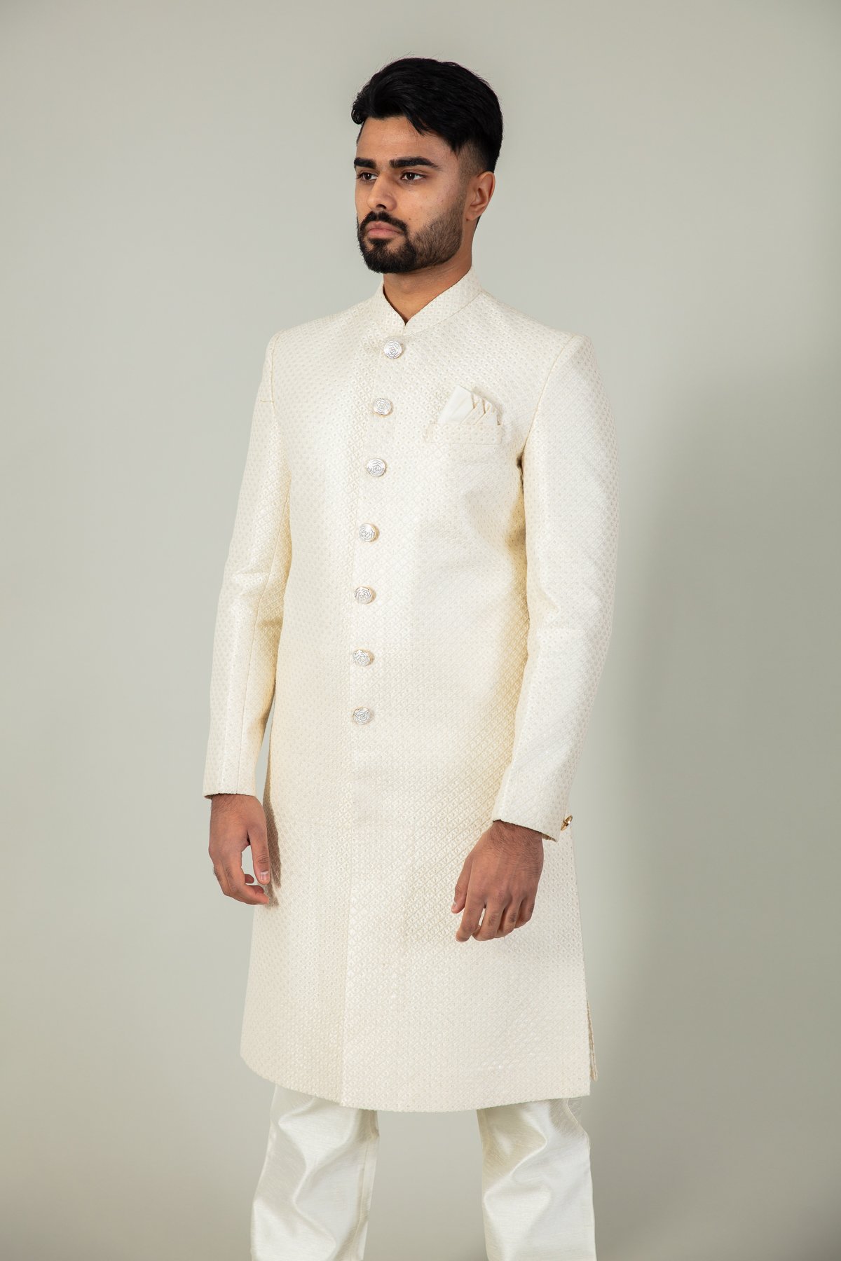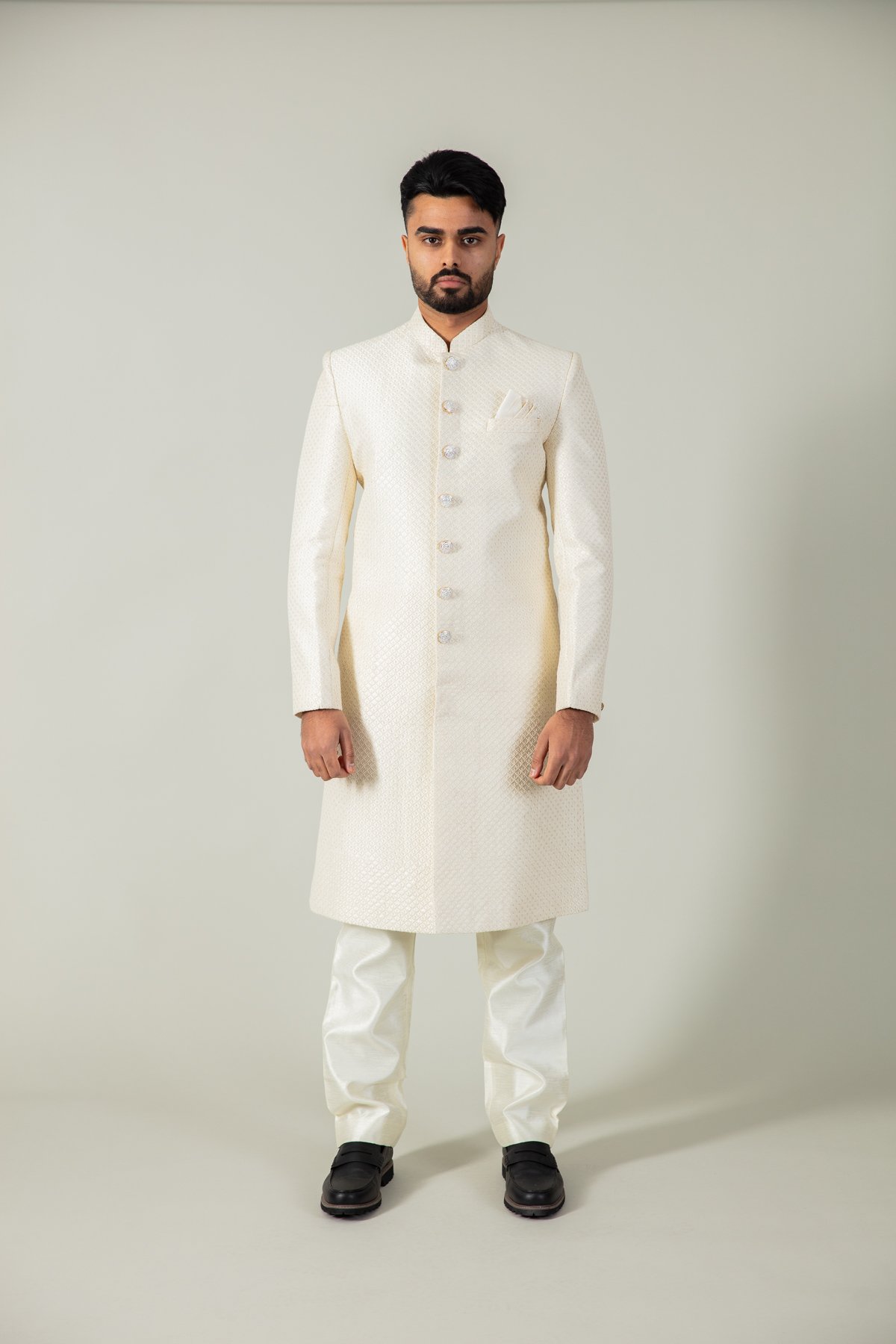 This beautiful men’s sherwani features a brocade coat designed with embroidered detailing all over the front and full length sleeves. It comes with a mandarin collar and has silver button embellishments across the middle. It’s finished with a plain dupion silk churidar.
