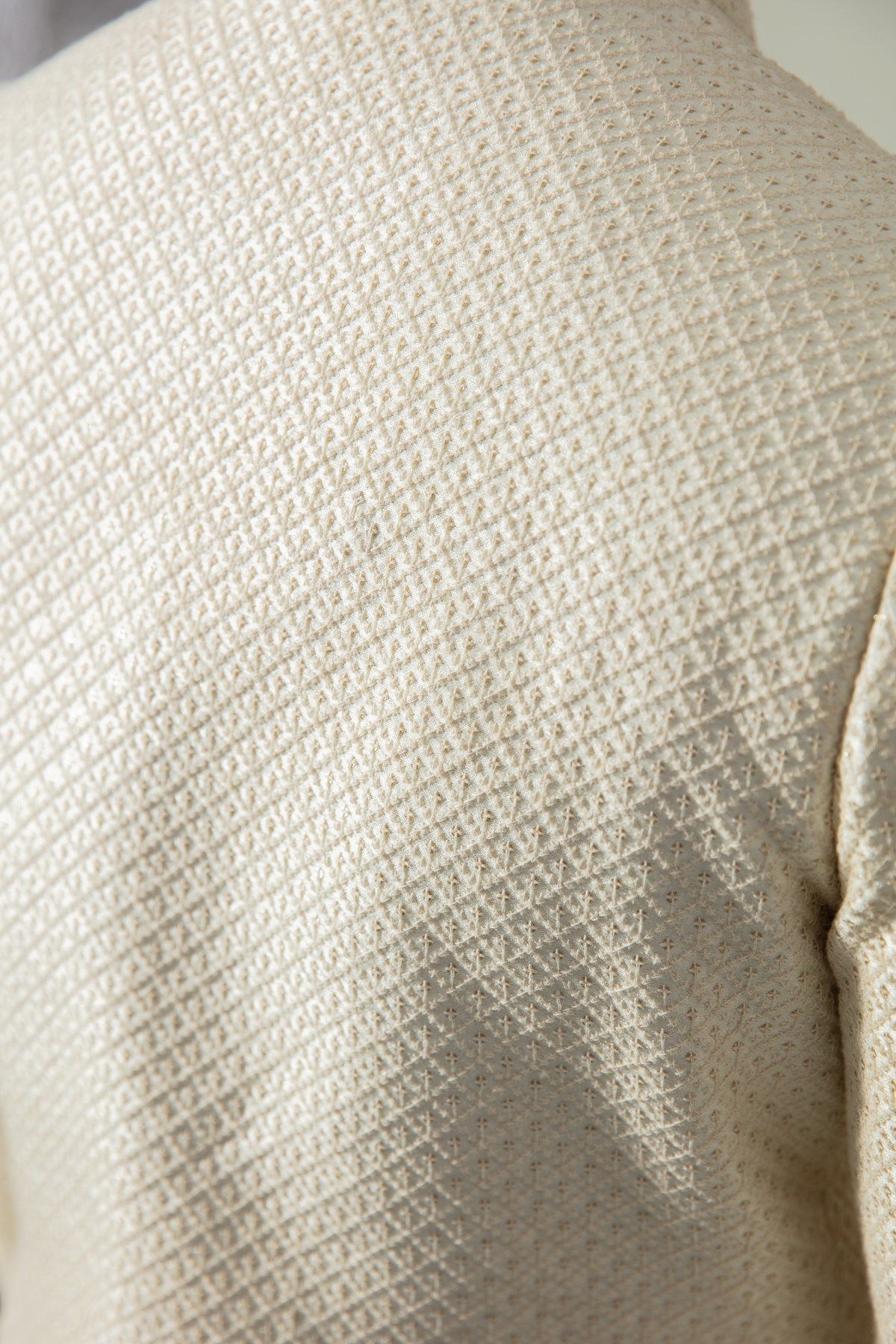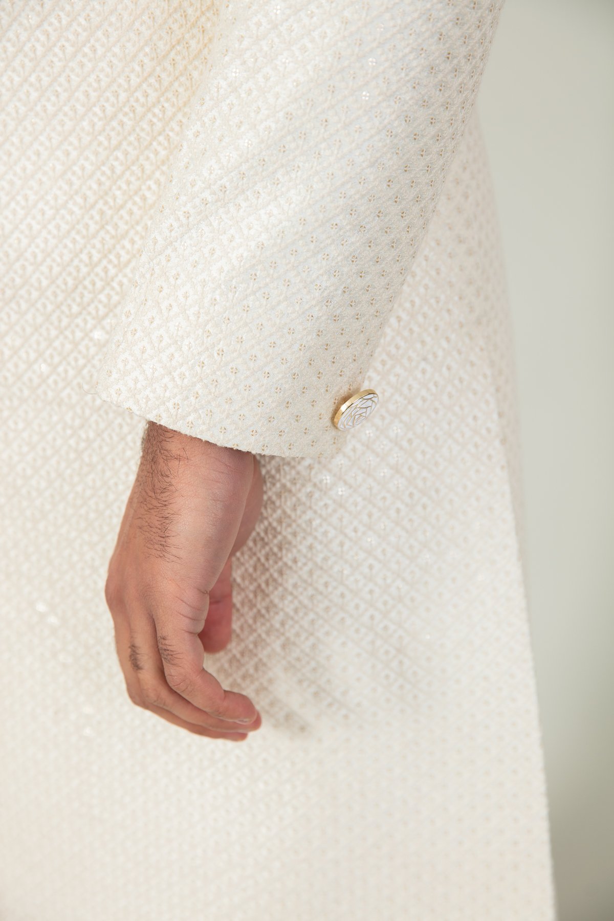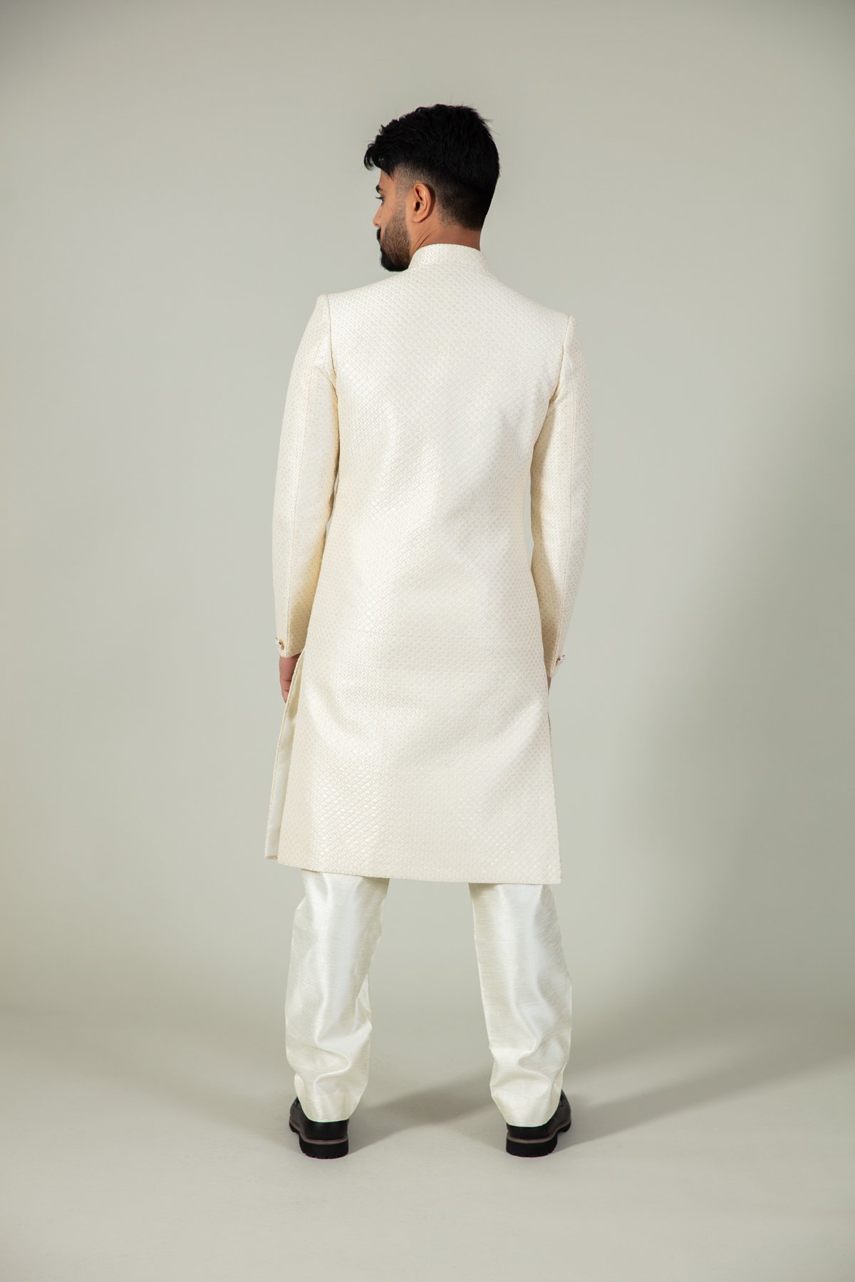 This beautiful men’s sherwani features a brocade coat designed with embroidered detailing all over the front and full length sleeves. It comes with a mandarin collar and has silver button embellishments across the middle. It’s finished with a plain dupion silk churidar.