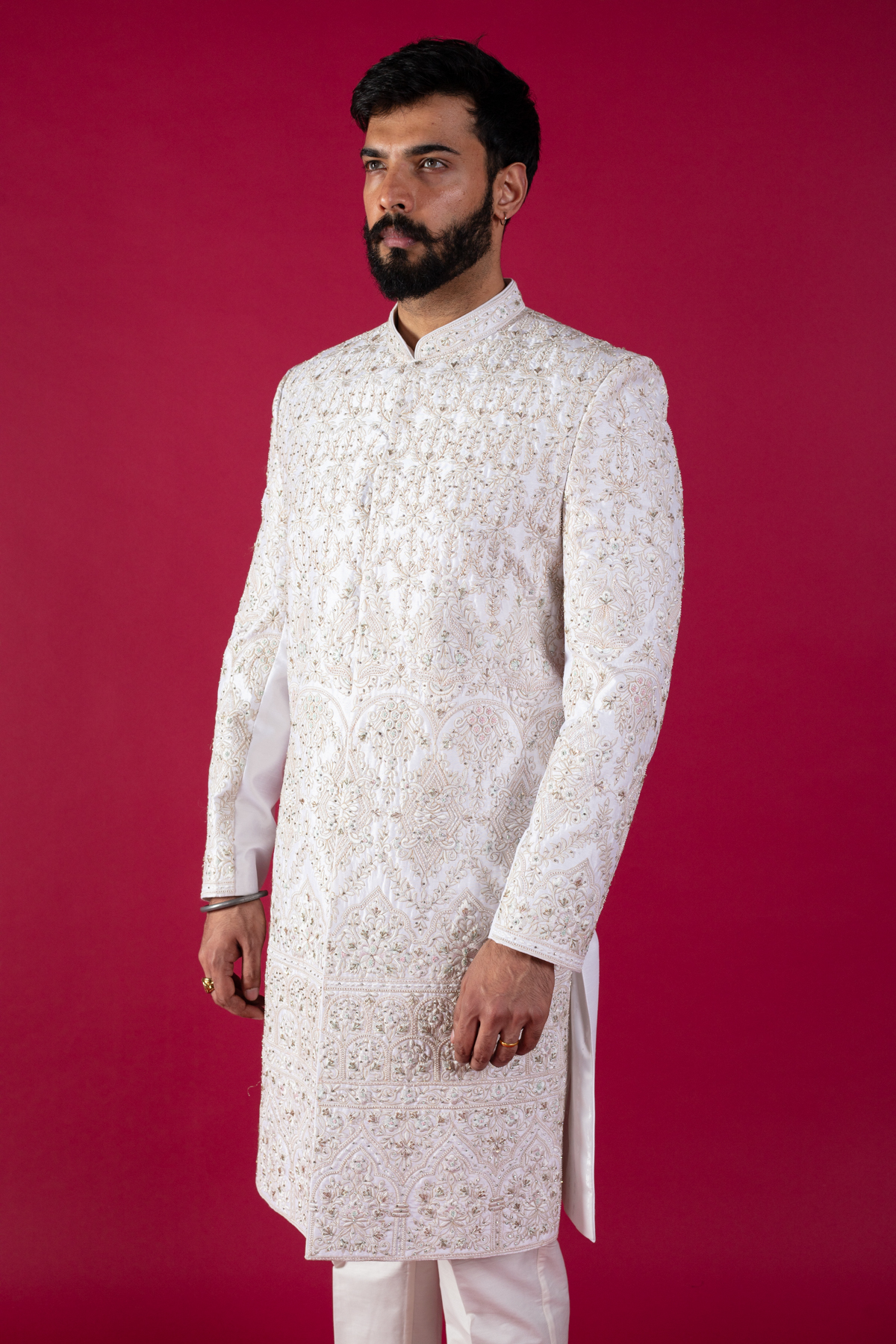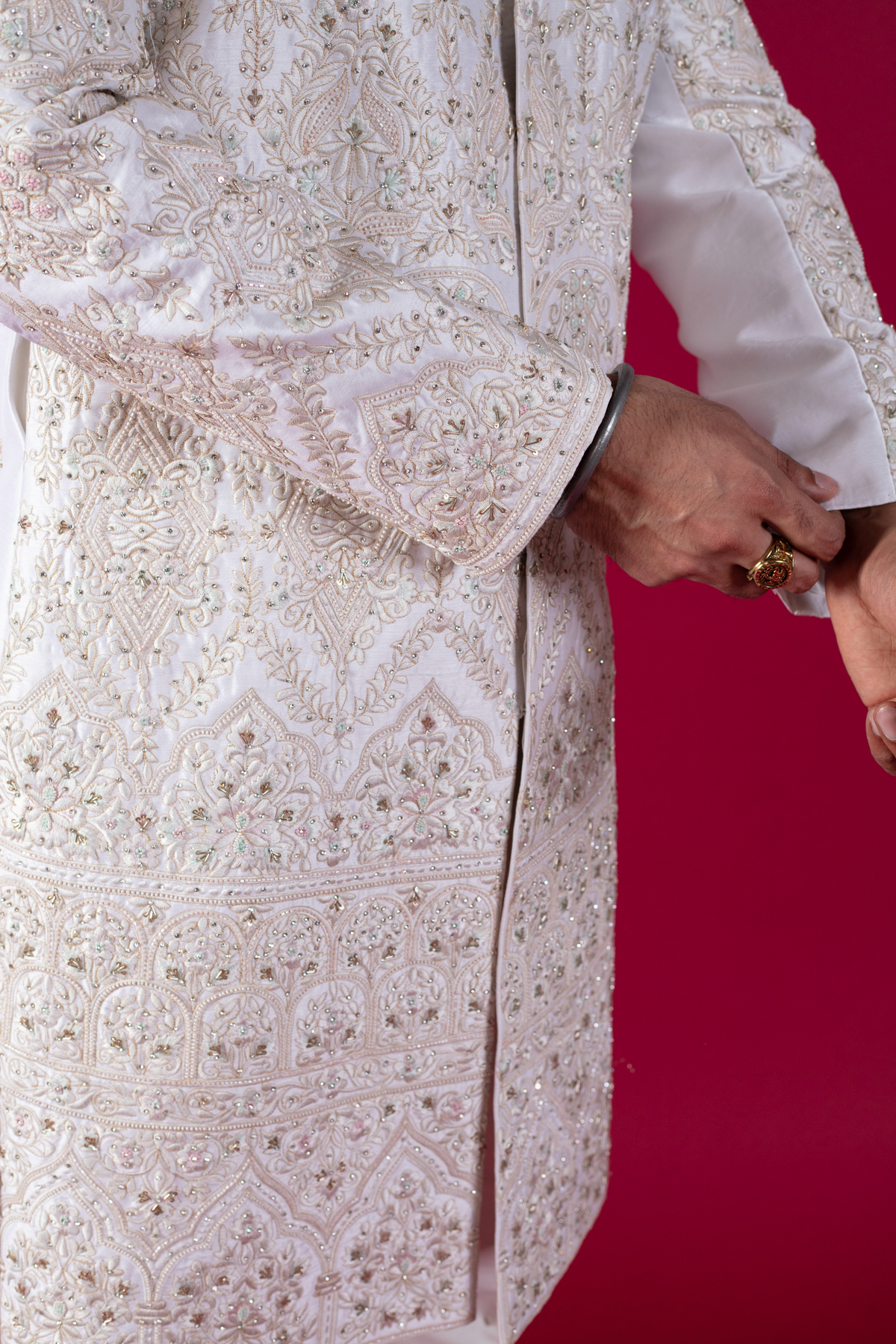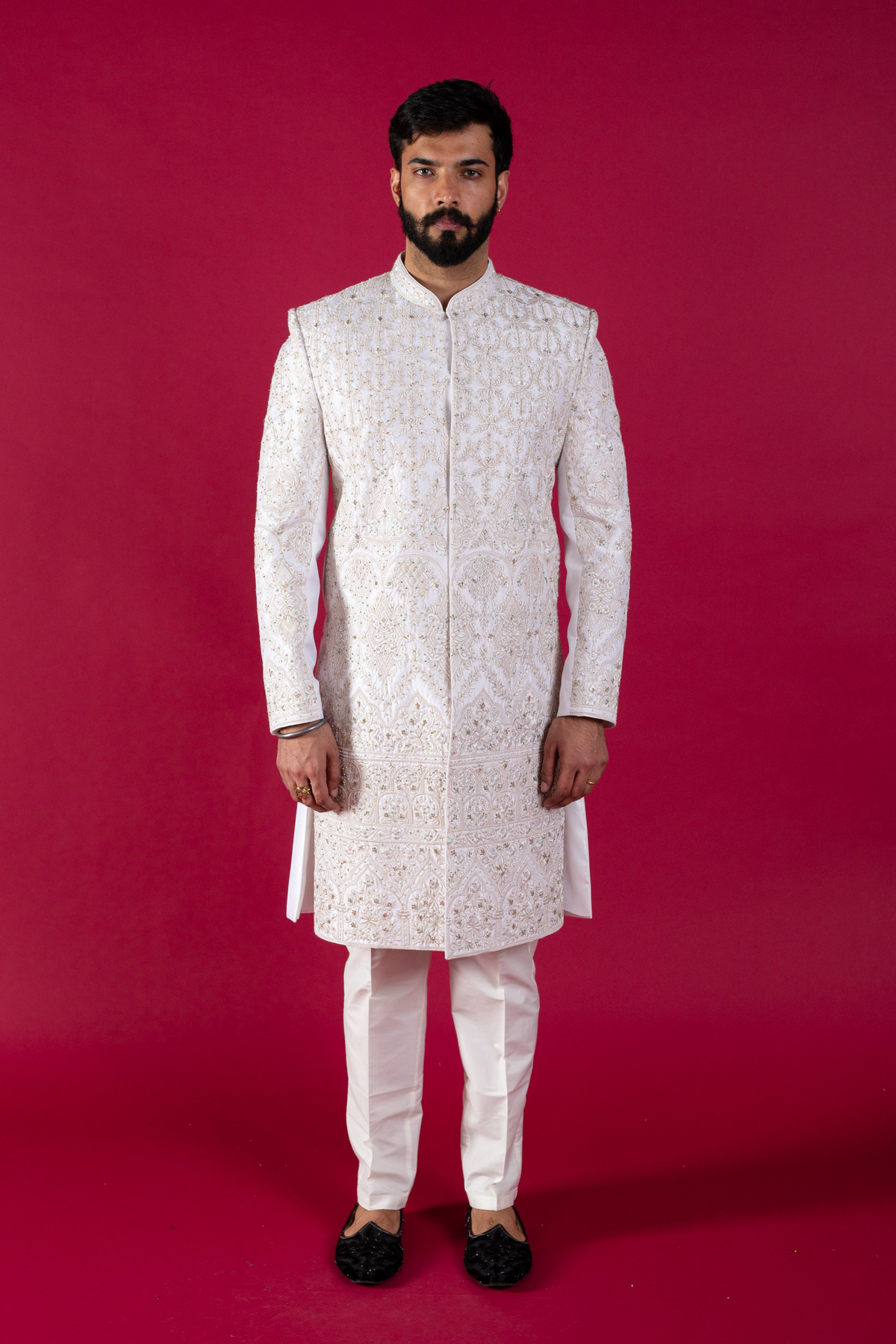 Men’s sherwani featuring luxury thread work embroidery along with beads and scattered diamante’s throughout, finished with an embroidered belt to enhance the waist and a peplum inner shirt in raw silk. The look is finished with raw silk trousers.