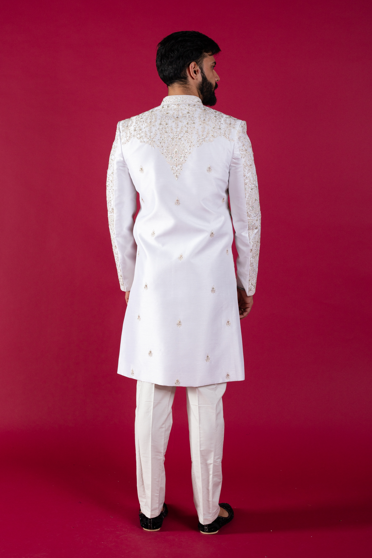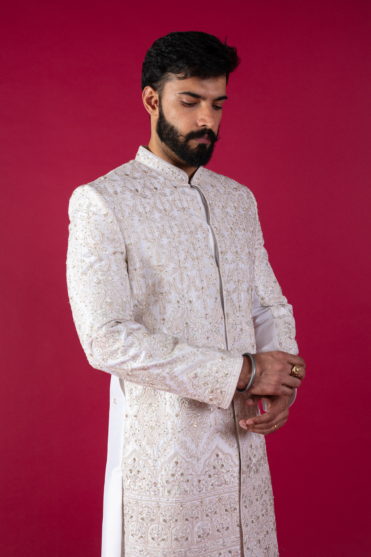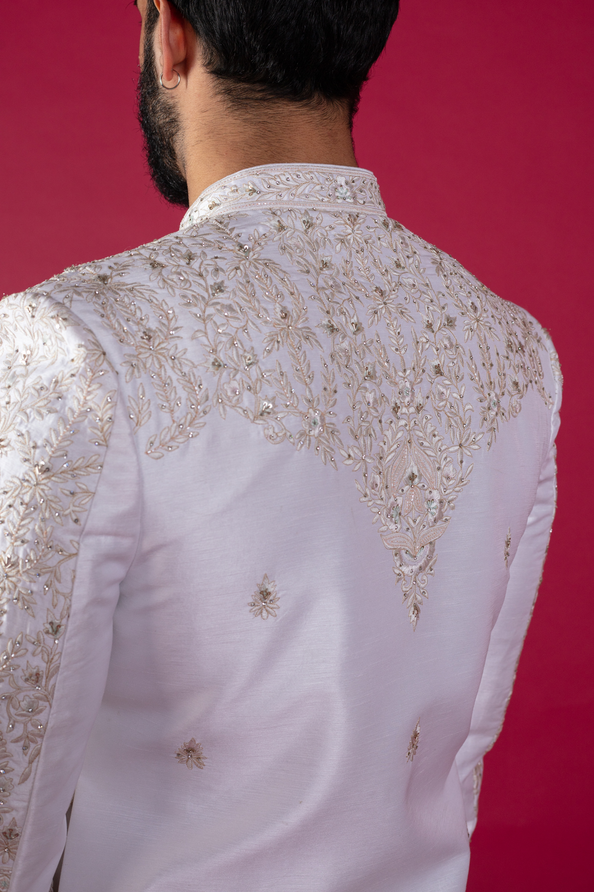 Men’s sherwani featuring luxury thread work embroidery along with beads and scattered diamante’s throughout, finished with an embroidered belt to enhance the waist and a peplum inner shirt in raw silk. The look is finished with raw silk trousers.