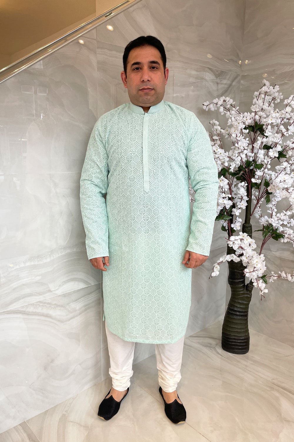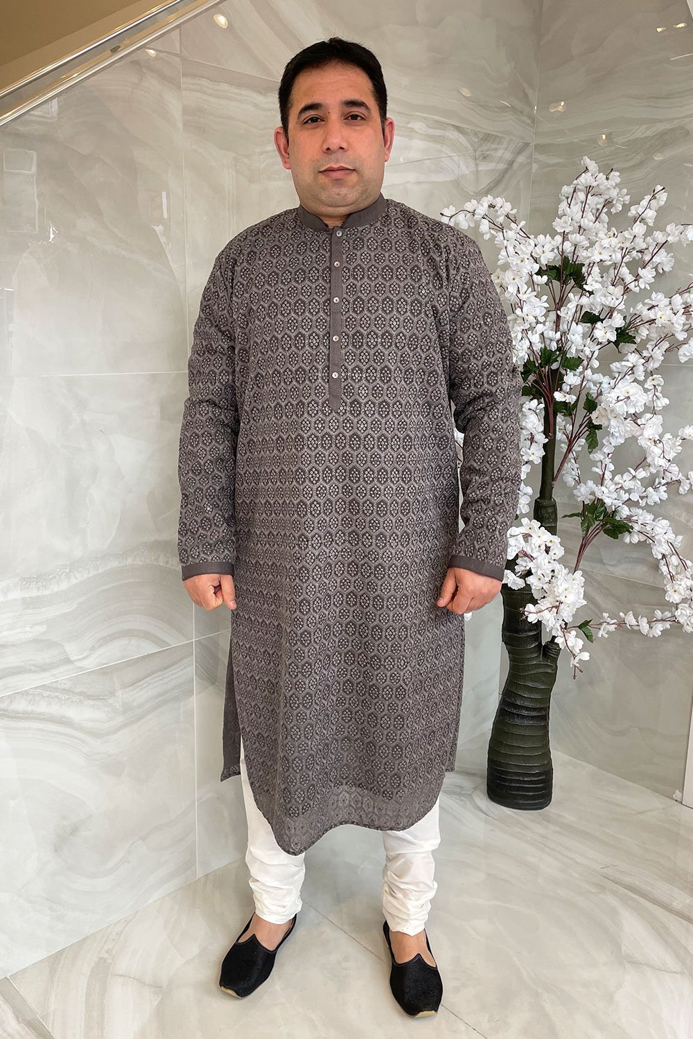 This beautiful 2 piece men’s suit features a straight shirt with thread-work embroidery throughout the front, back and full length sleeves, along with an embroidered border across the front and collar. The look is finished with plain churidaar trousers.