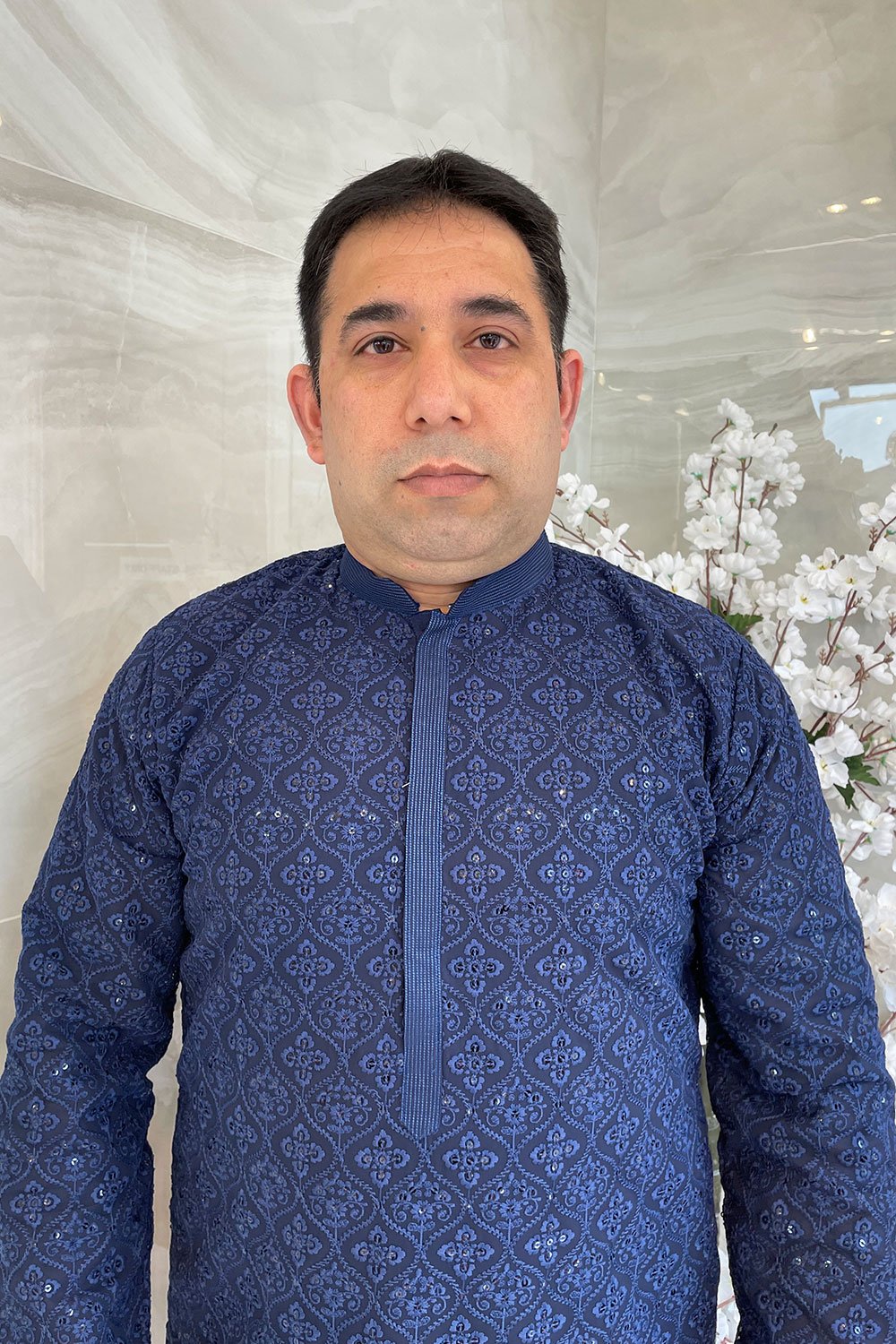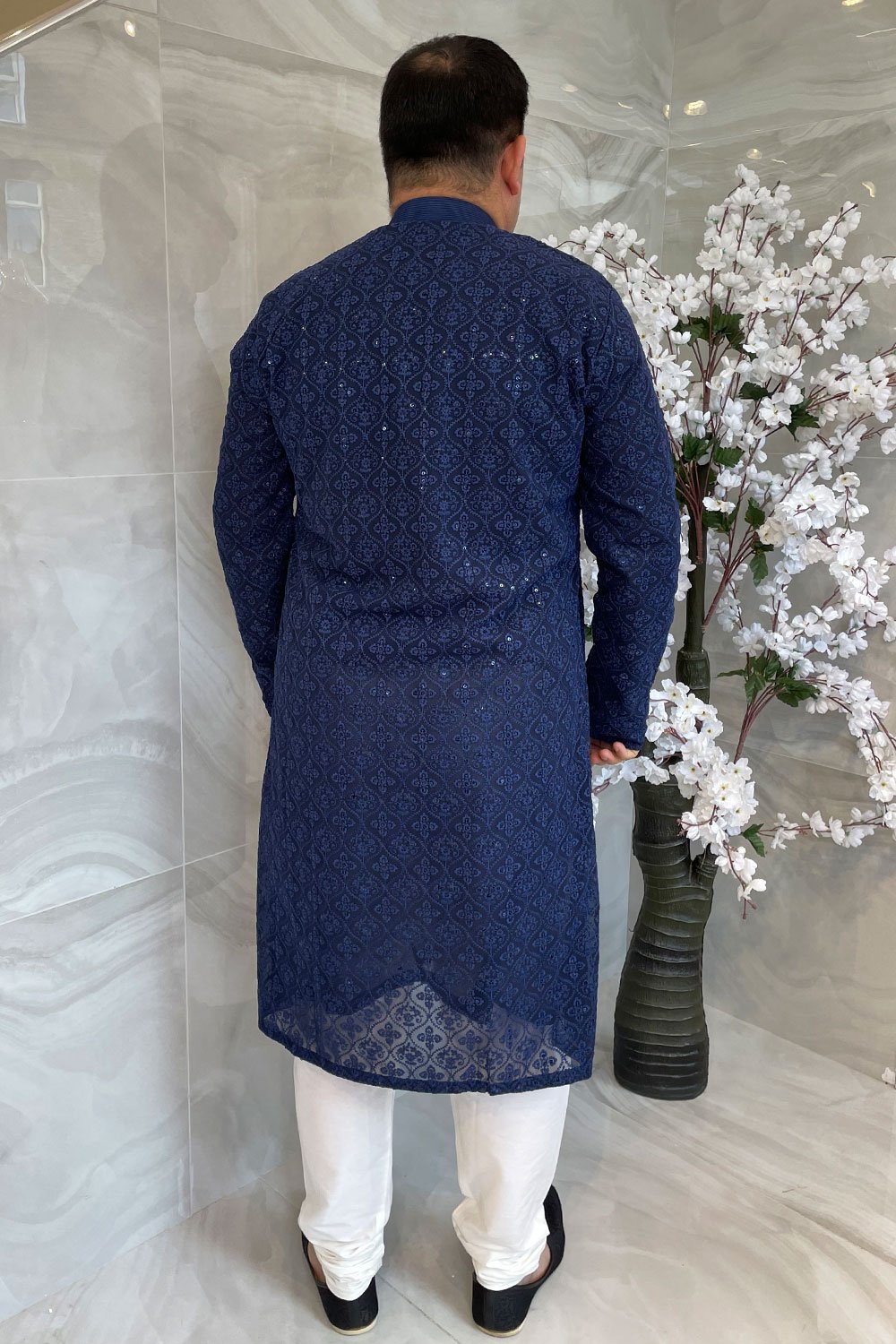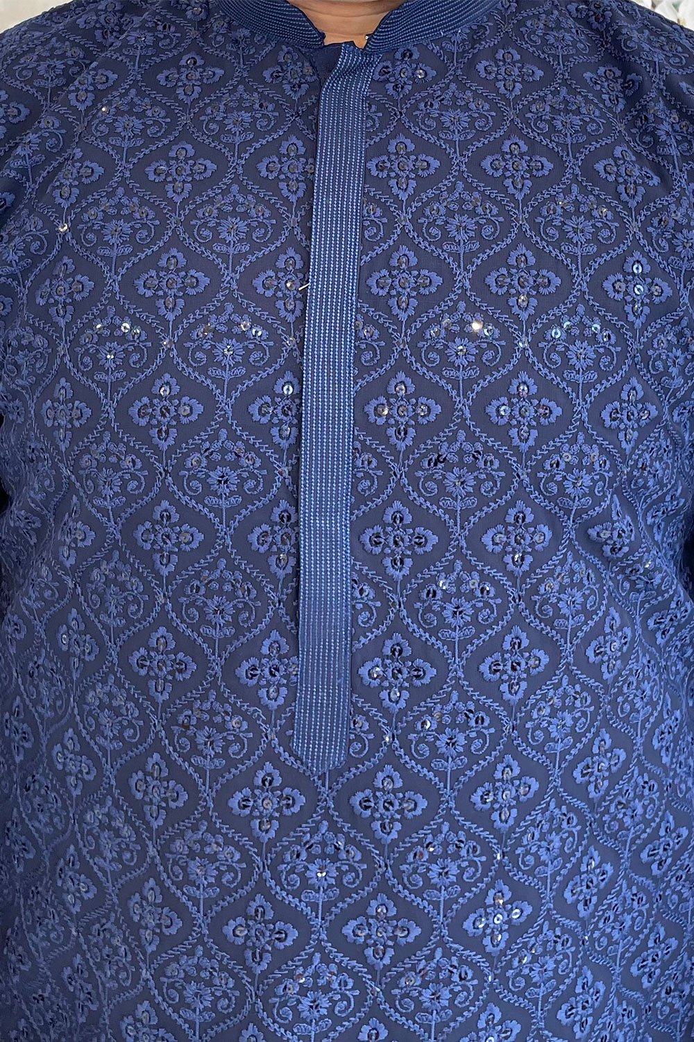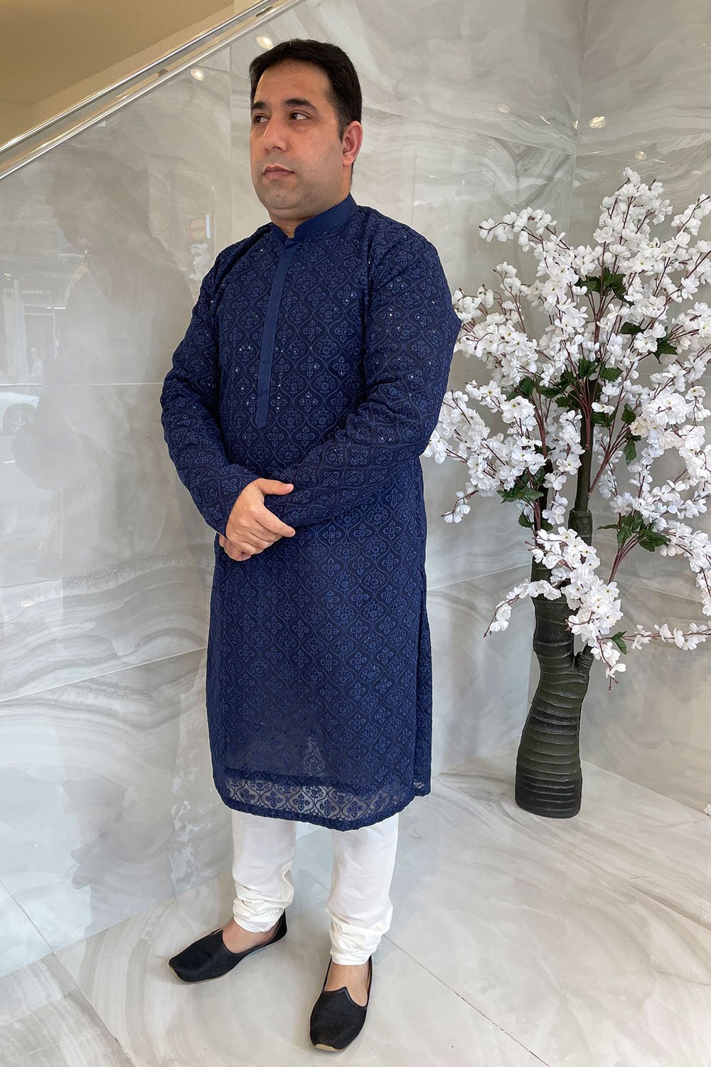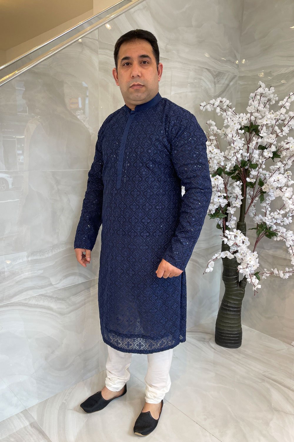 This beautiful 2 piece men’s suit features a straight shirt with sequence embroidery throughout the front, back and full length sleeves, along with an embroidered border across the front and collar. The look is finished with plain churidaar trousers.