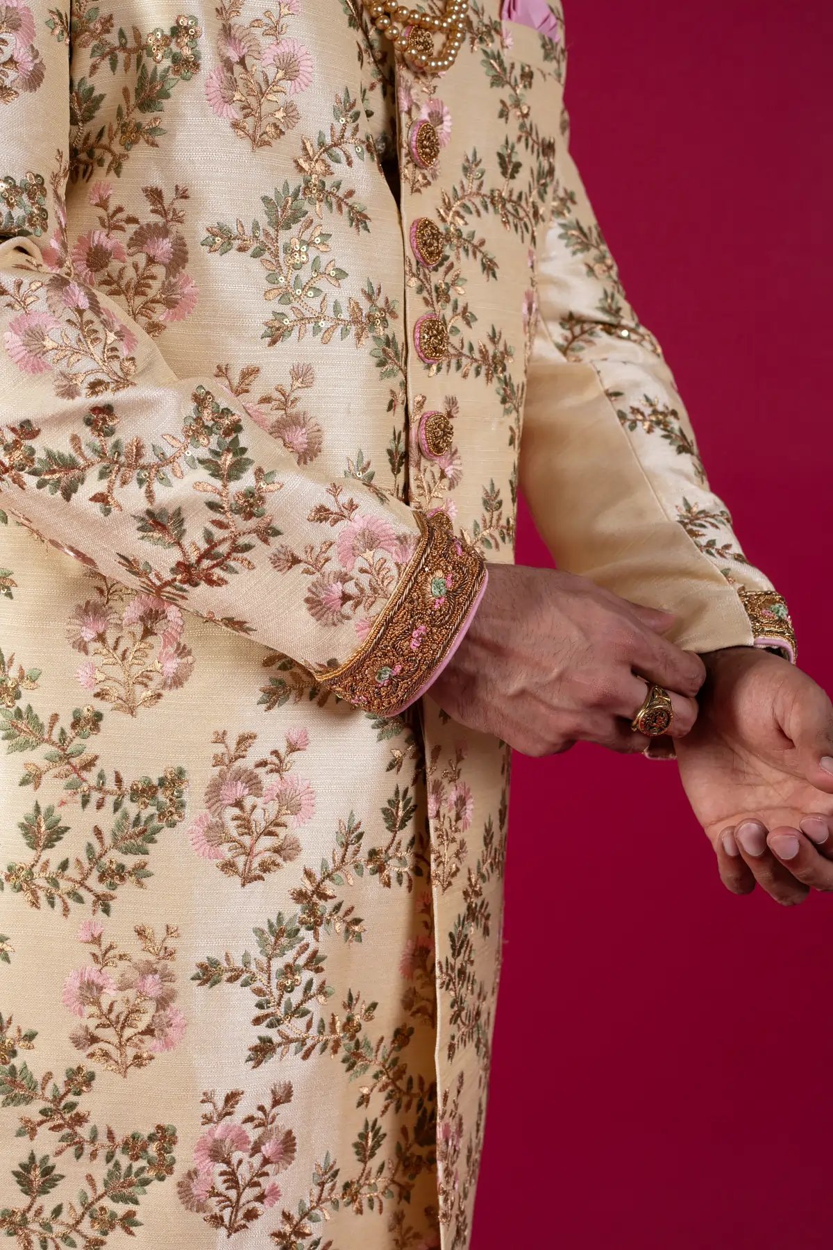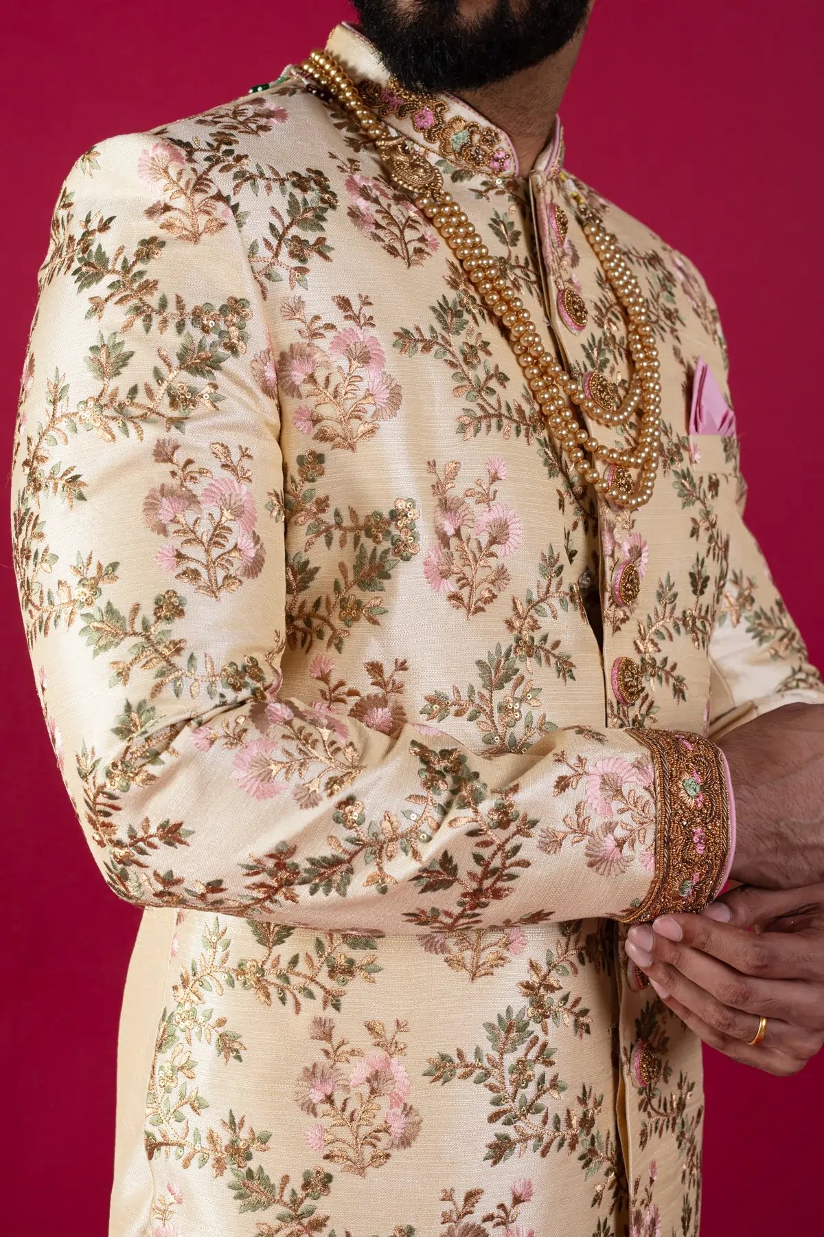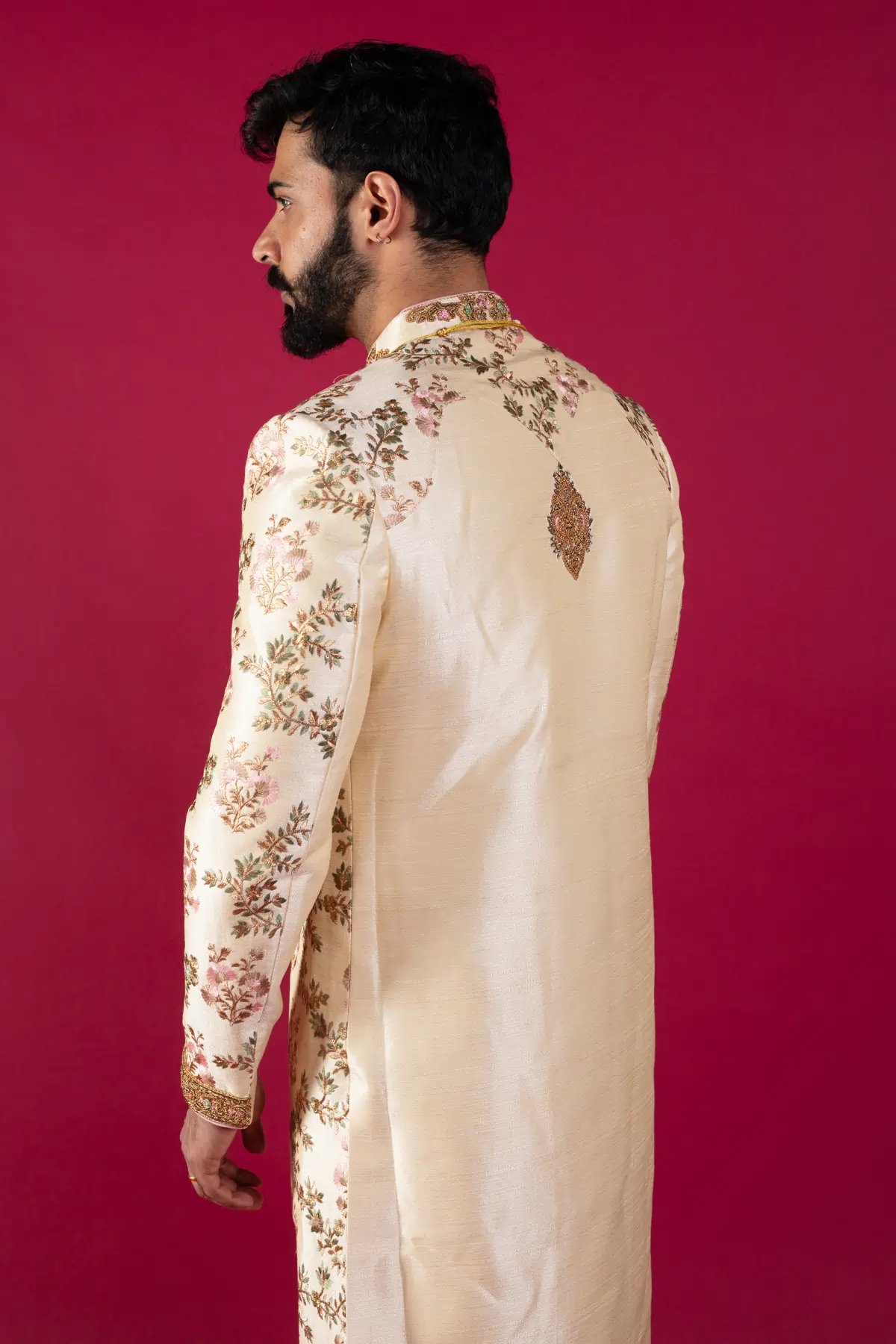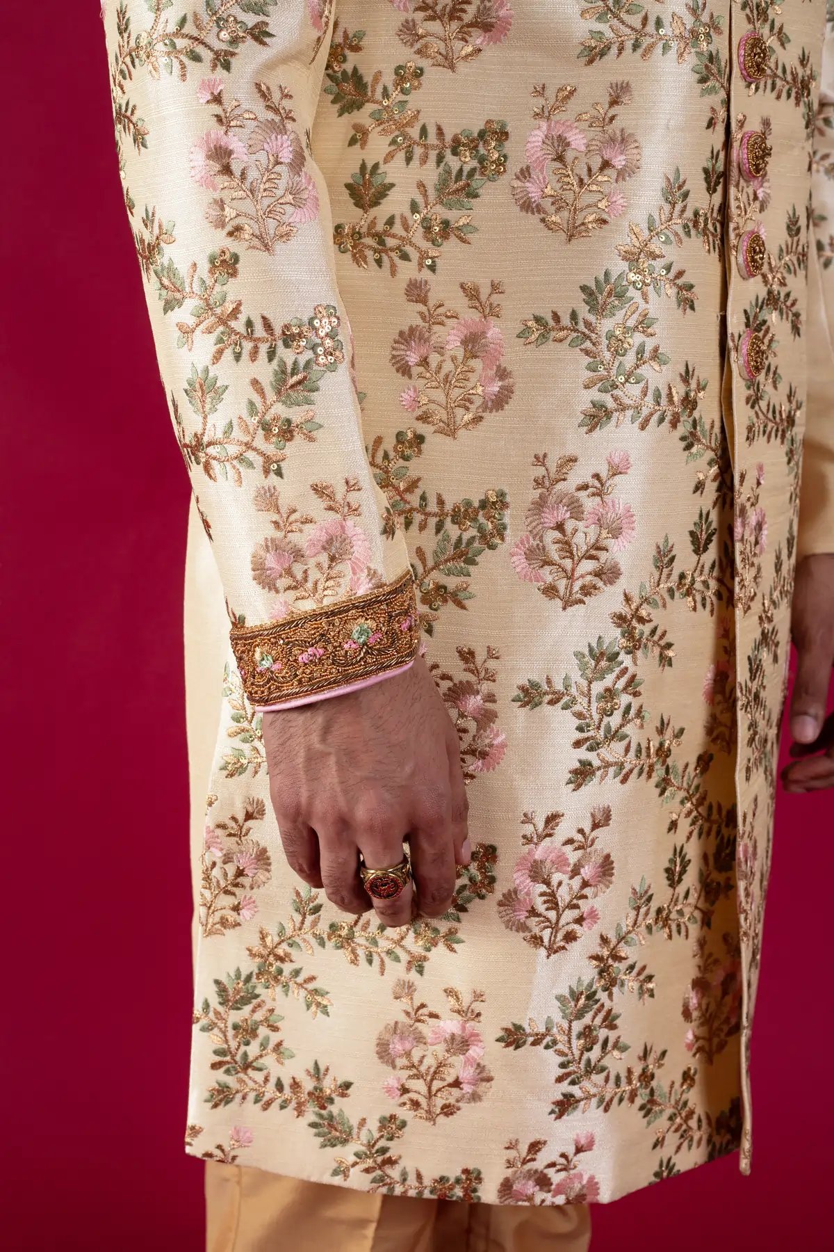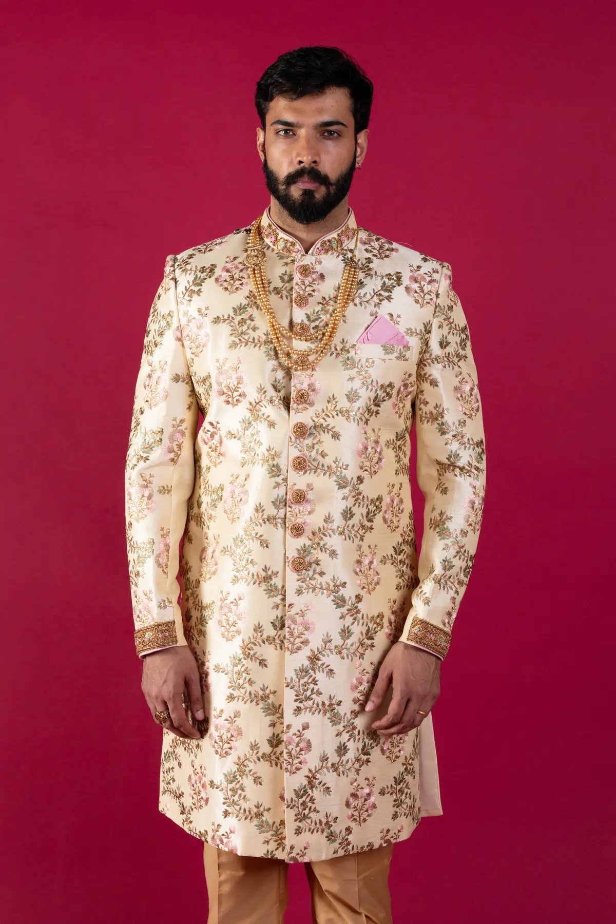 Fashioned in an eye-pleasing cream hue, this Sherwani channels extraordinary charm perfect for weddings. Designed with pristine attention to detail, the ornamental floral pattern leaves a mark. Paired with a complementing churidar and mala, this ensemble radiates regality and sophistication. Crafted from fine silk, it offers unparalleled comfort and style.