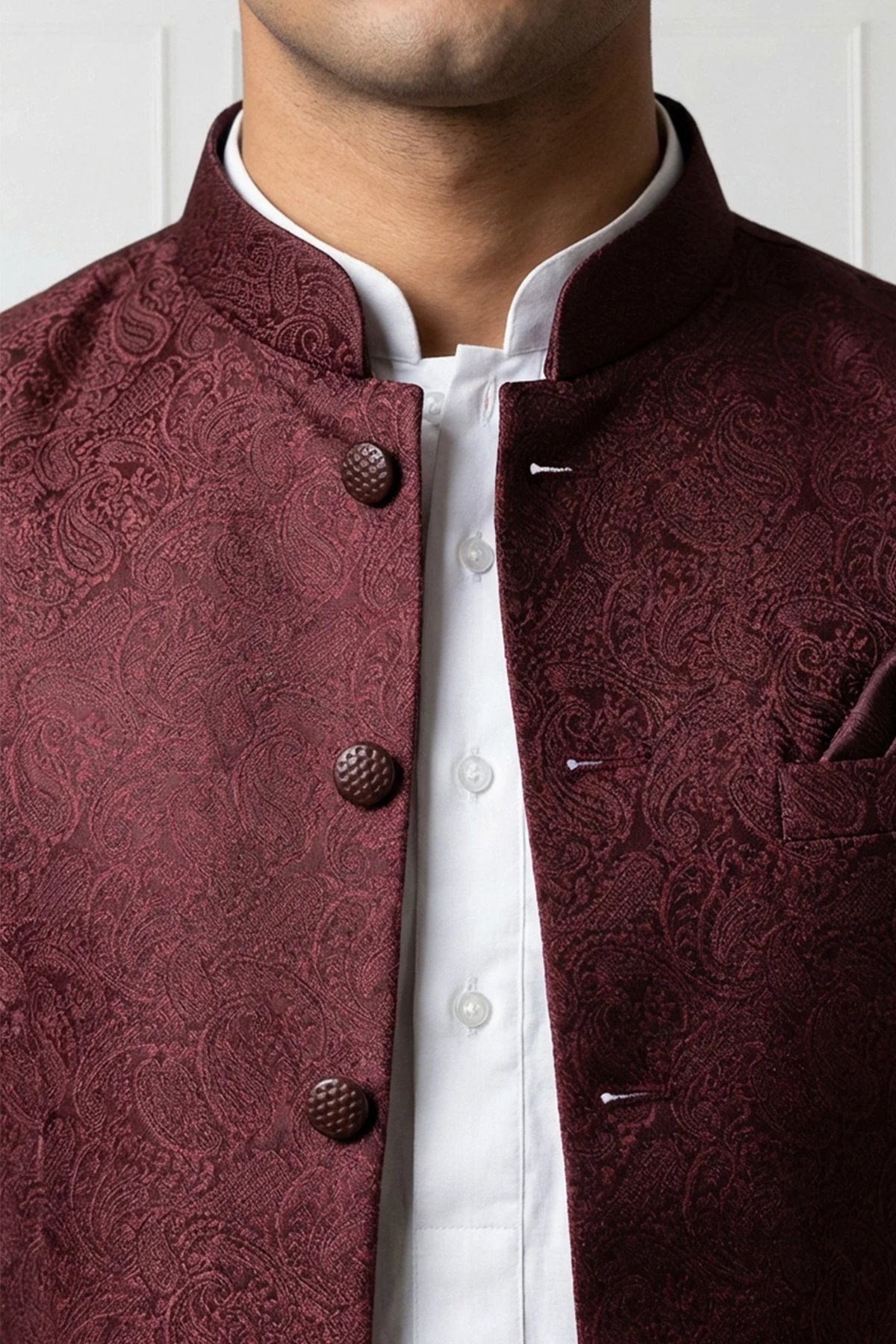 This beautiful waistcoat is crafted from a blend of brocade fabric enhanced by moulded buttons and mandarin collar along with a straight cut that fits easy around the chest and then tapers at the waist creating a broad shoulder-slim waist look. It is perfect for formal occasions as well as layering over basic clothing. Note: Kurta pyjama shown in the picture is not included.