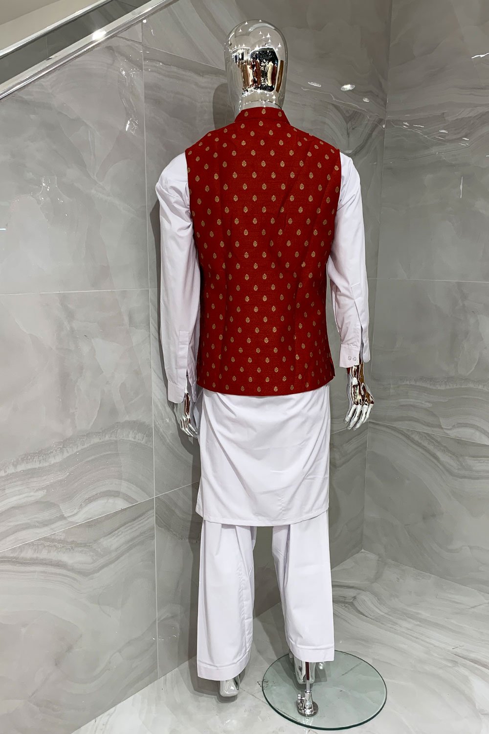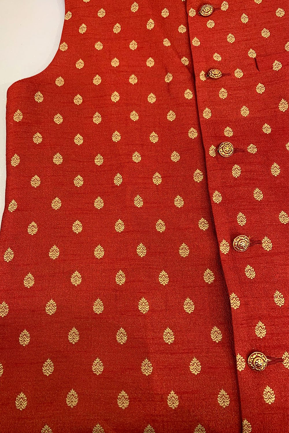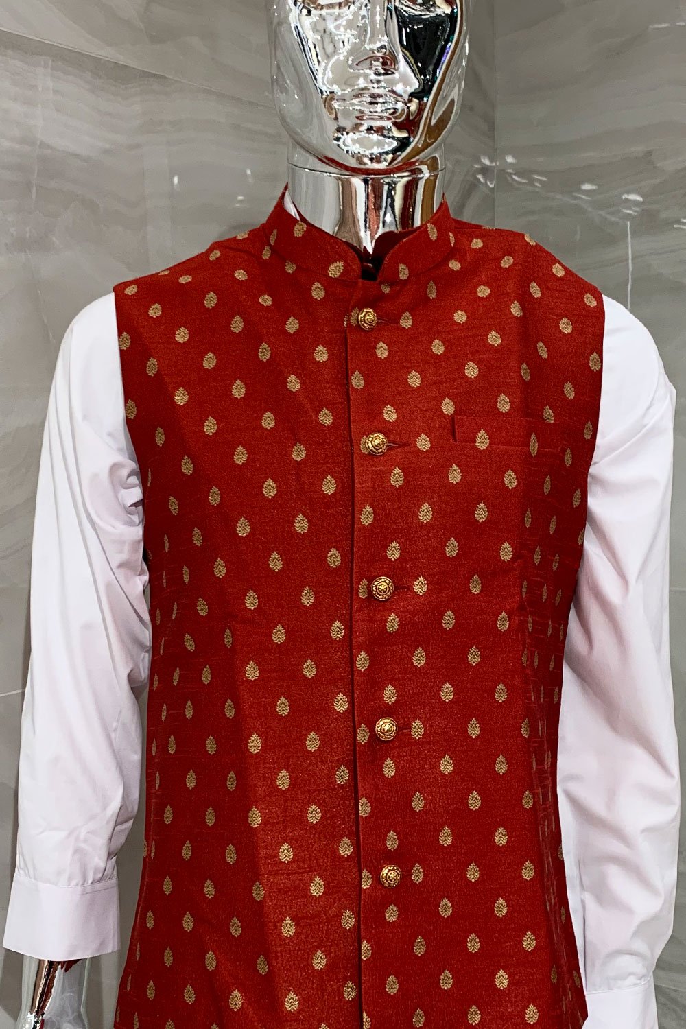 This stylish men’s waistcoat features printed patterns throughout the front and back with button embellishments across the middle on the front. It is sleeveless with a mandarin collar.