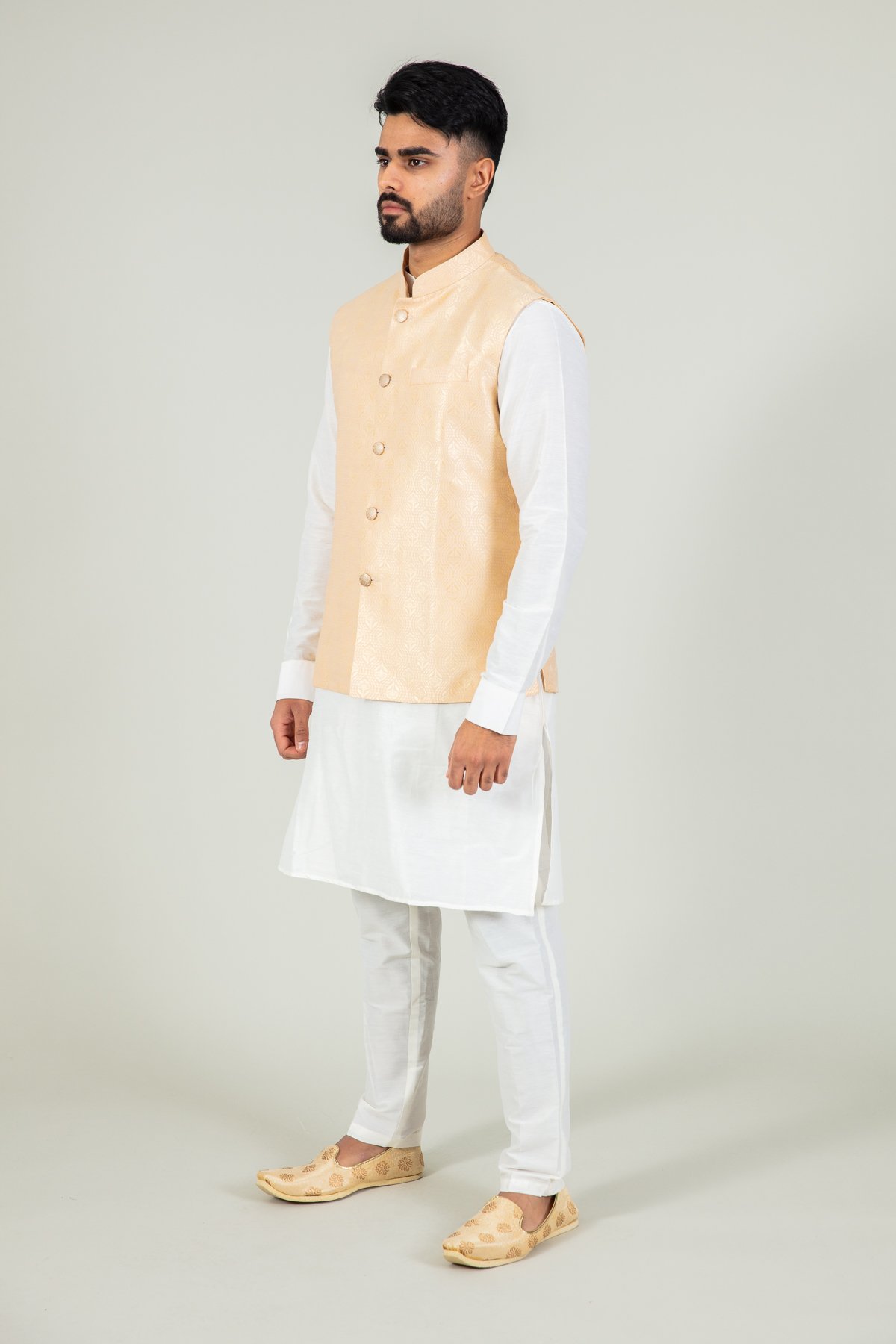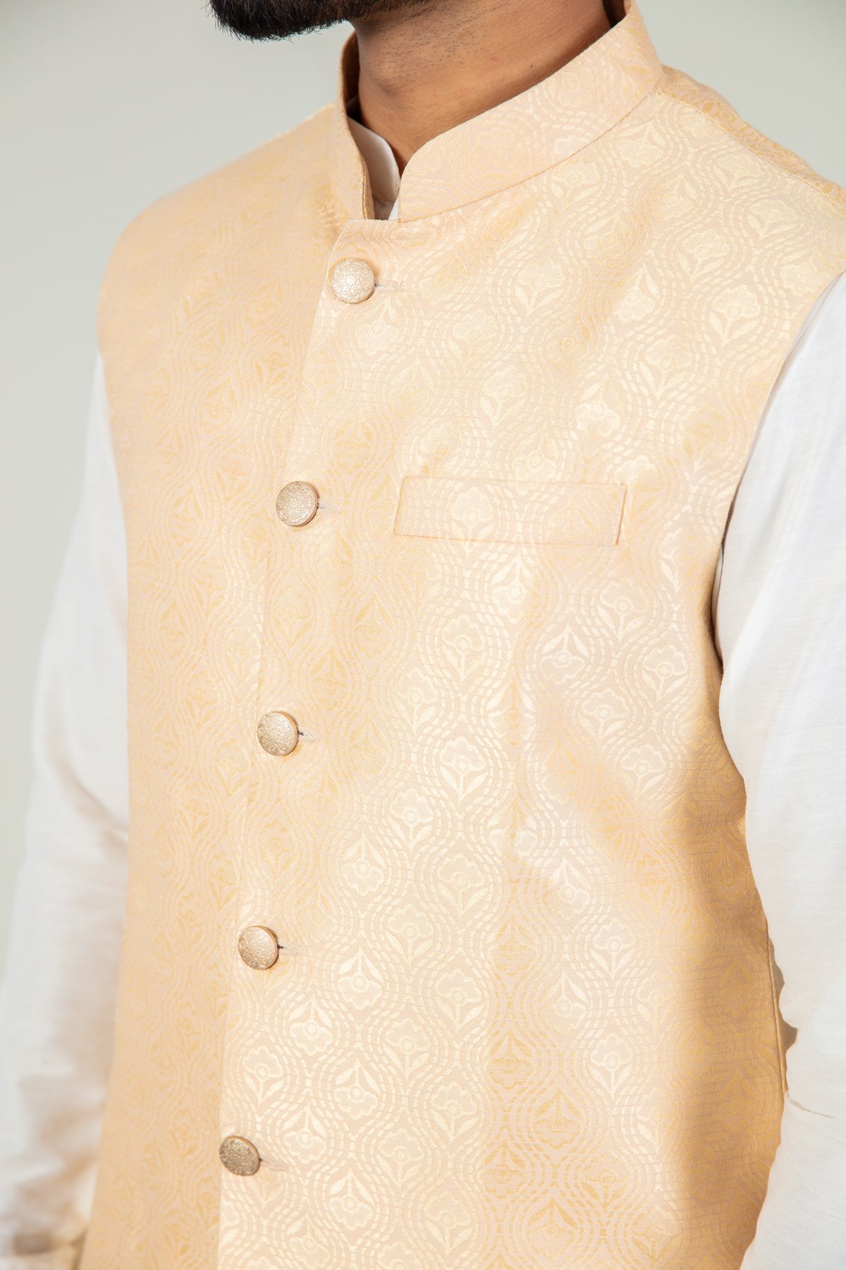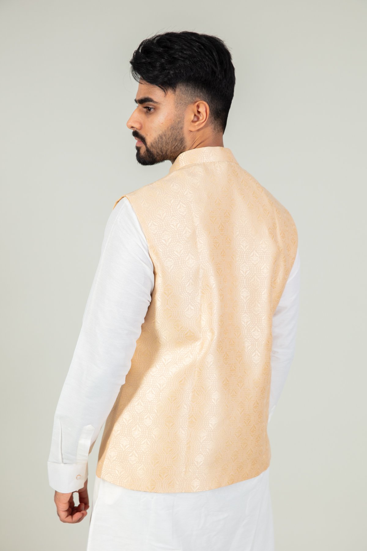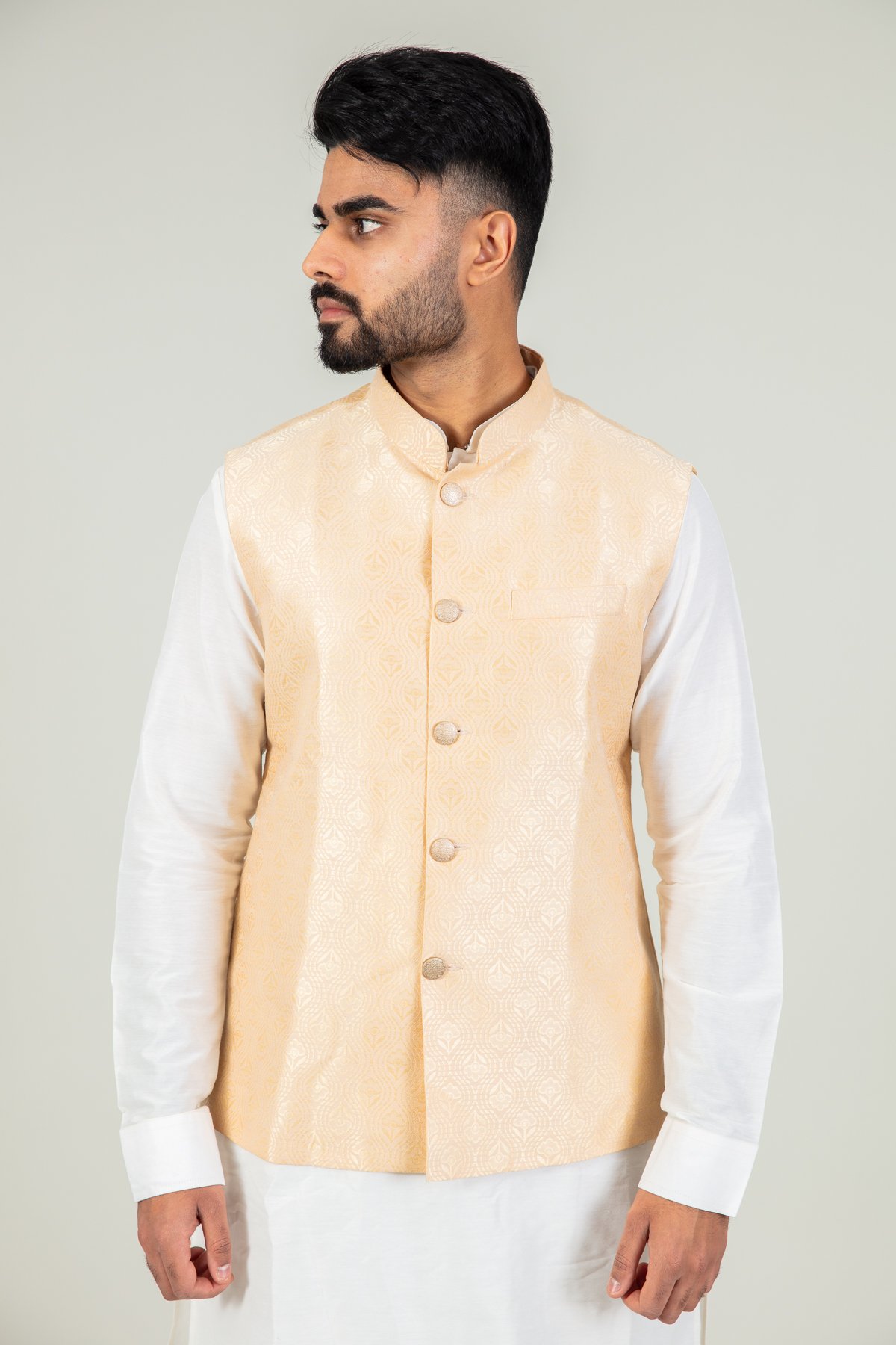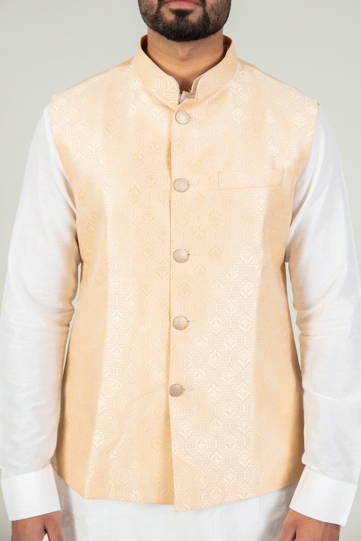 This stylish mens waistcoat in features printed patterns throughout the front and back with button embellishments across the middle on the front. It is sleeveless with a mandarin collar.