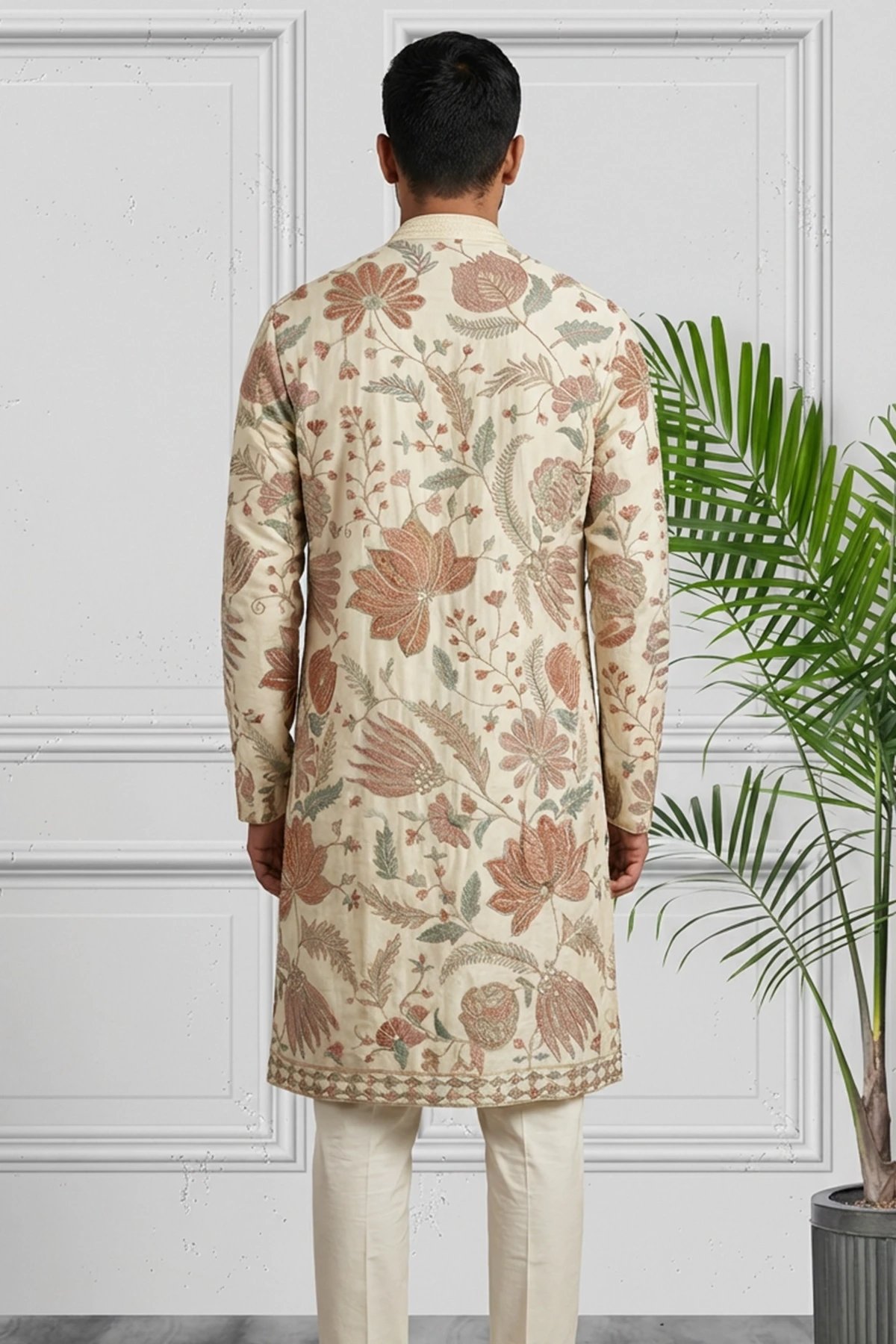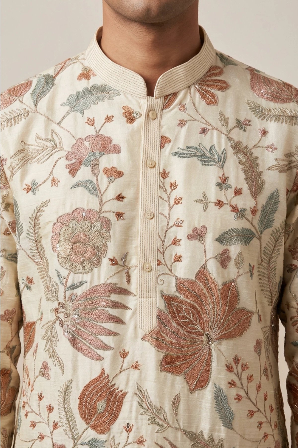 This elegant cream kurta features a soft, smooth fabric adorned with intricate floral prints in warm earthy tones, creating a refined and artistic look. Designed with a classic band collar, a half-button placket, and full sleeves, it offers a straight, knee-length silhouette for a clean and tailored finish. Paired with matching slim-fit cream trousers, the ensemble delivers a graceful and sophisticated style perfect for festive occasions and daytime events. Note: Design details and embellishments may vary slightly from the imagery shown.