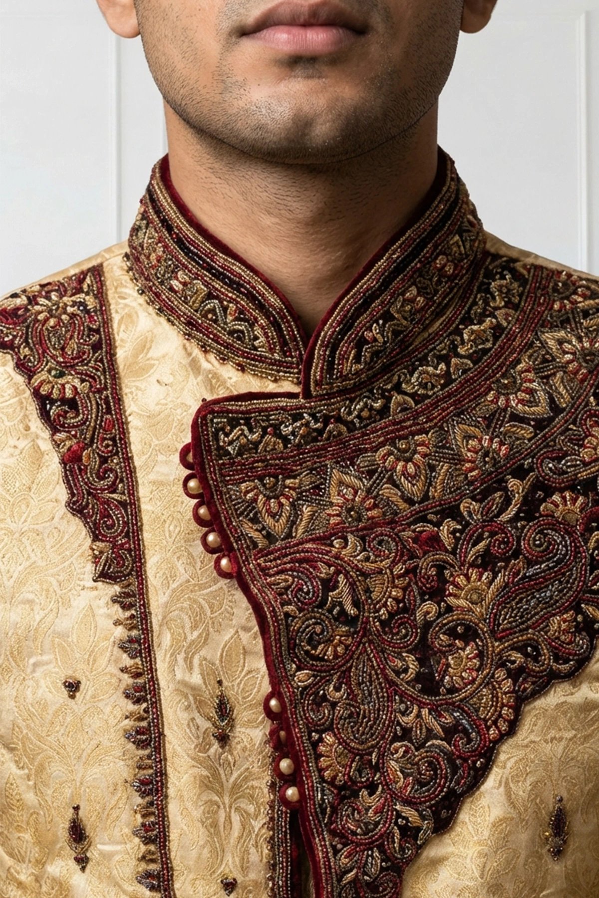 A timeless statement piece crafted for the most special occasions. This sherwani features intricate embroidery that highlights traditional artistry while maintaining a refined, modern silhouette. The rich detailing along the collar, chest, and cuffs adds depth and sophistication, creating a look that feels both regal and contemporary. Paired with a patiala shalwar.