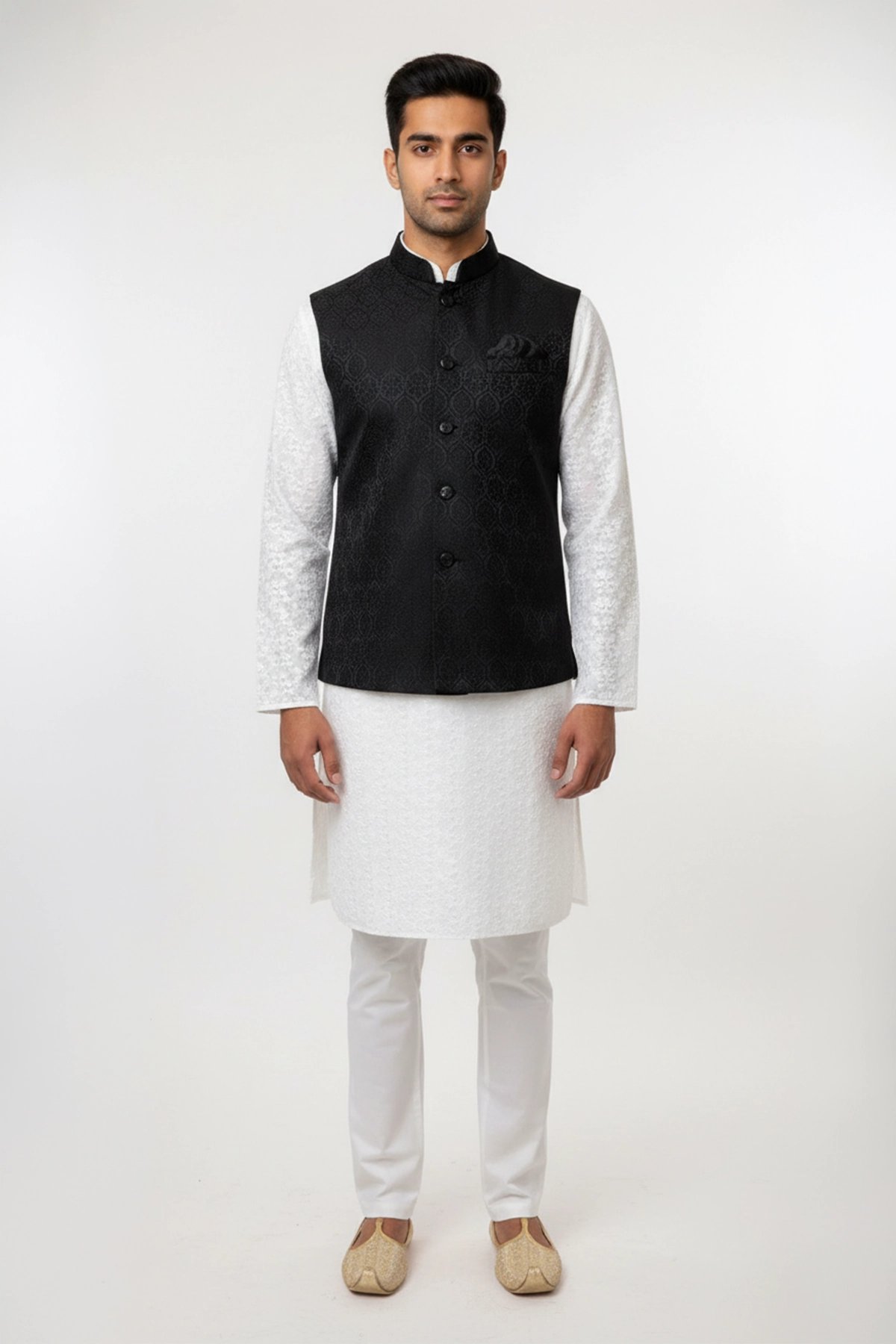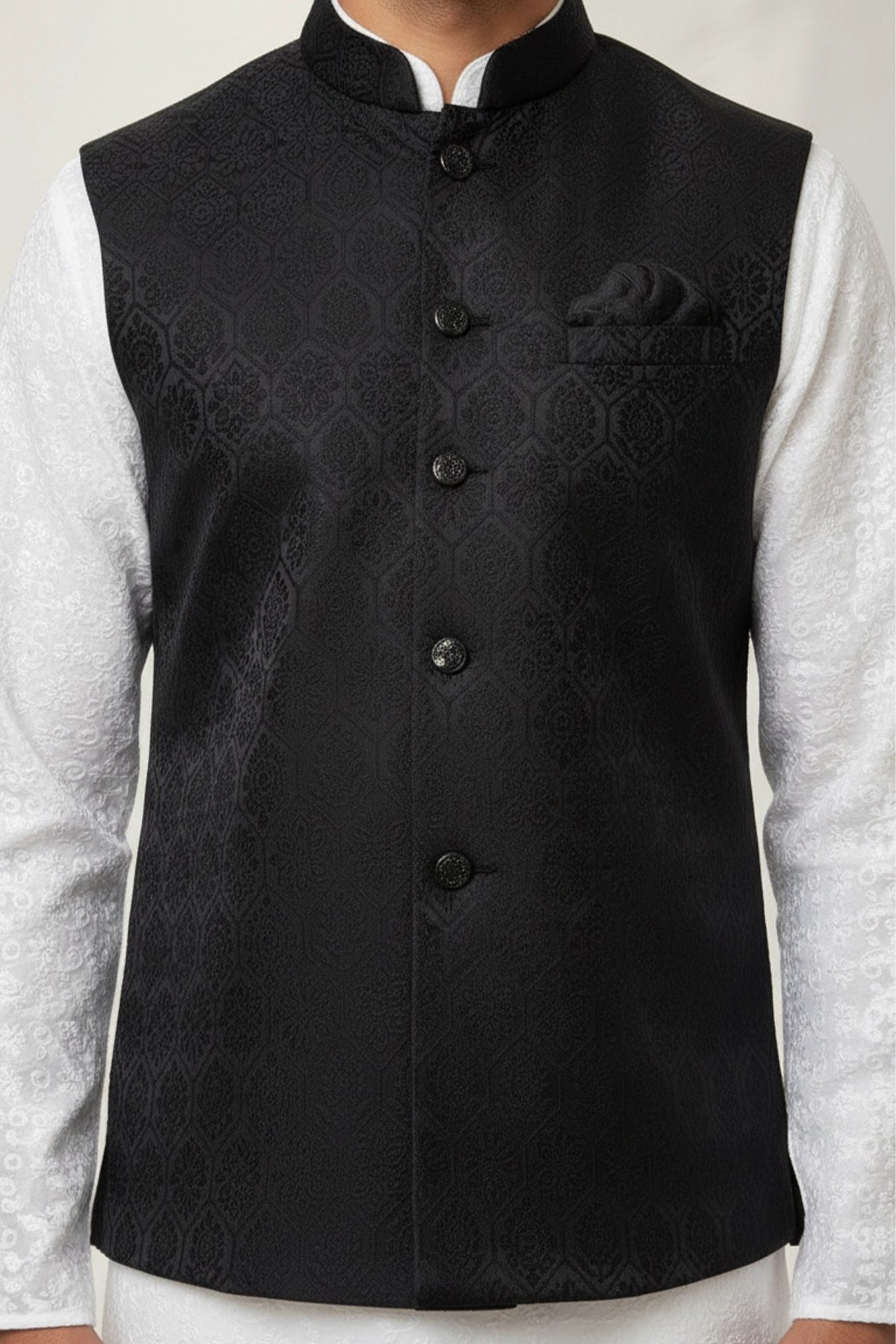 This beautiful waistcoat is crafted from a blend of brocade fabric enhanced by moulded buttons and mandarin collar along with a straight cut that fits easy around the chest and then tapers at the waist creating a broad shoulder-slim waist look. It is perfect for formal occasions as well as layering over basic clothing. Note: Kurta pyjama shown in the picture is not included.