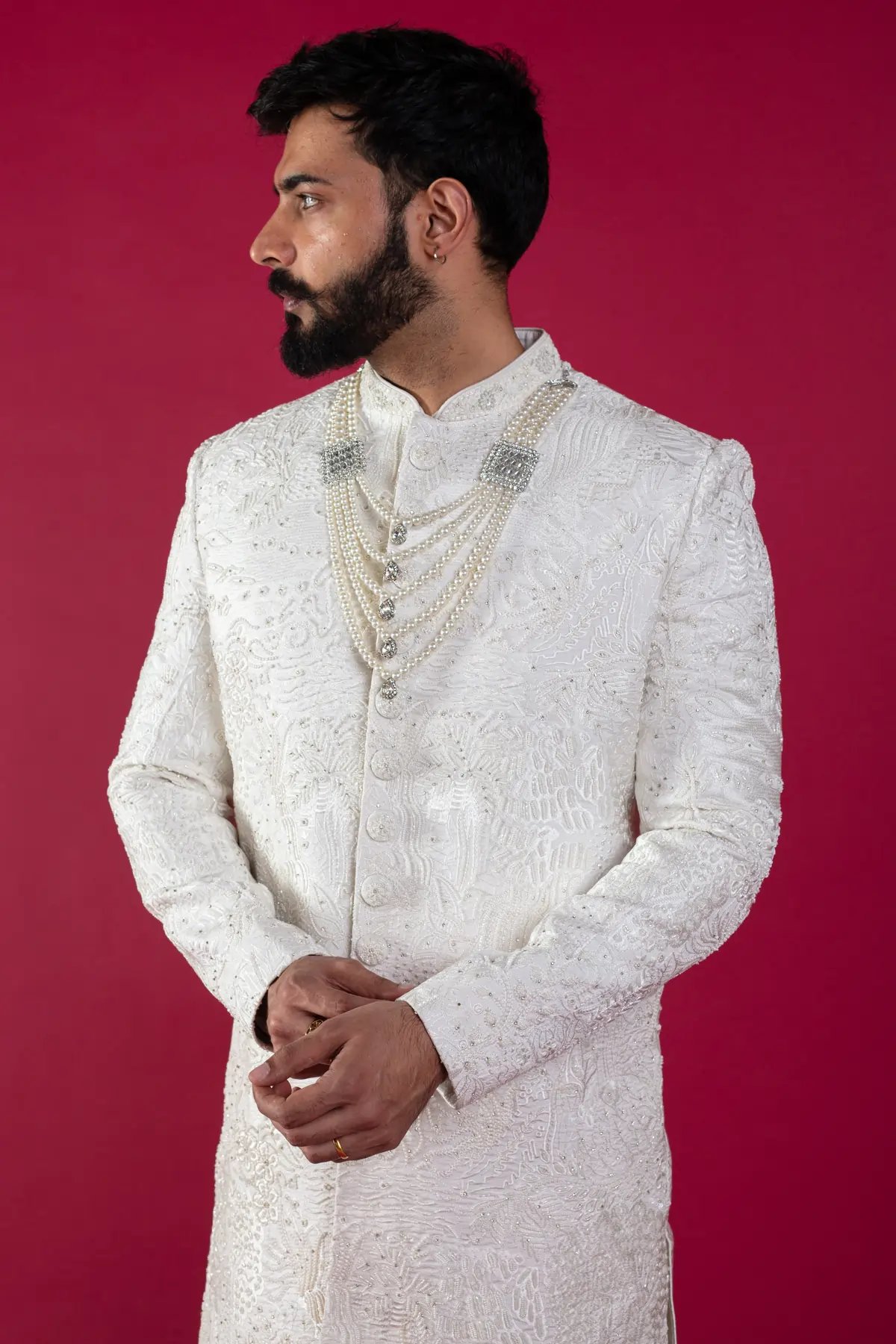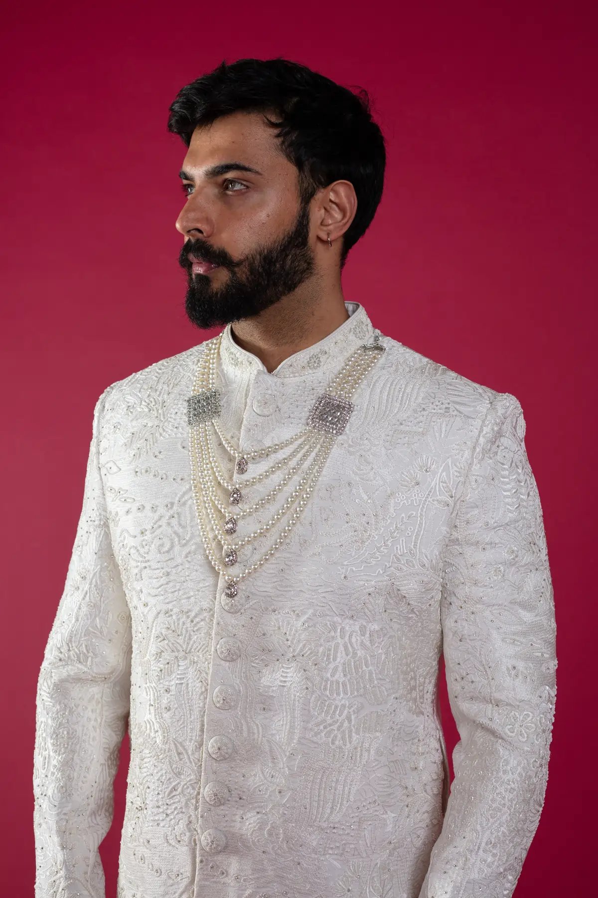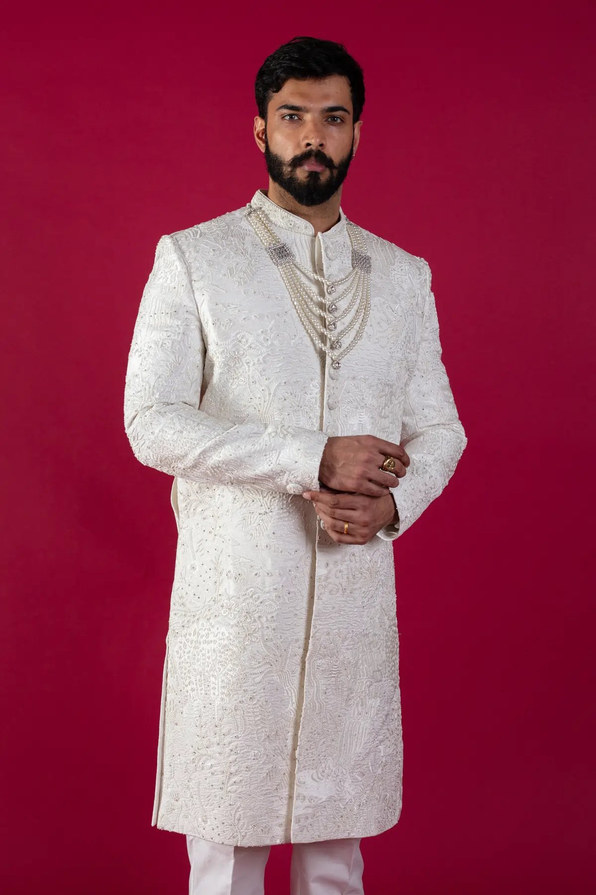 This beautiful men’s sherwani features a long coat all closed up to the collar and below the knee lengthwise. It is designed with beautiful thread-work embroidered detailing all over the front and full length sleeves with scattered diamantes along with detailed button embellishments along the middle, Paired with raw silk trousers to complete the groom look and four layered pearl mala.