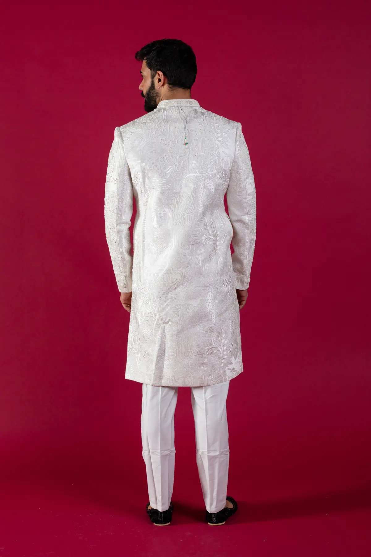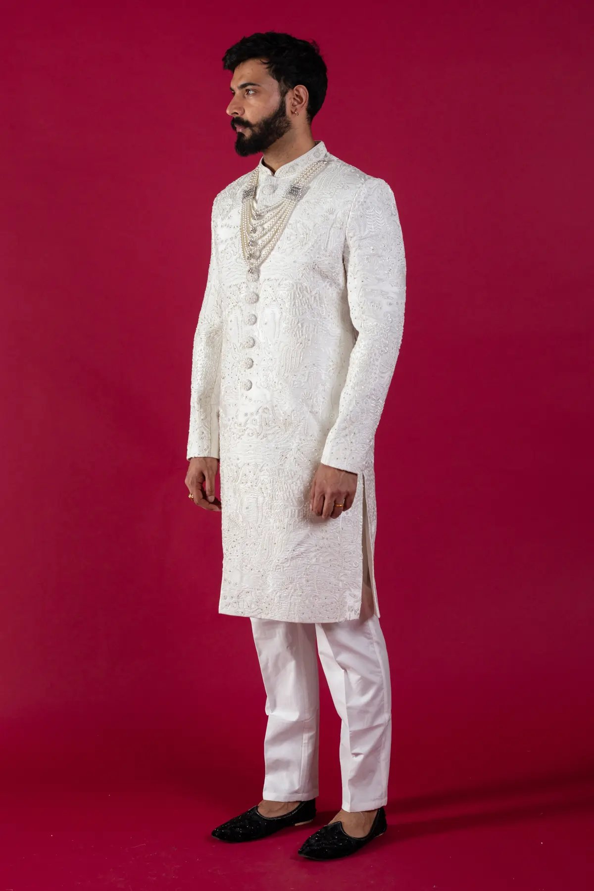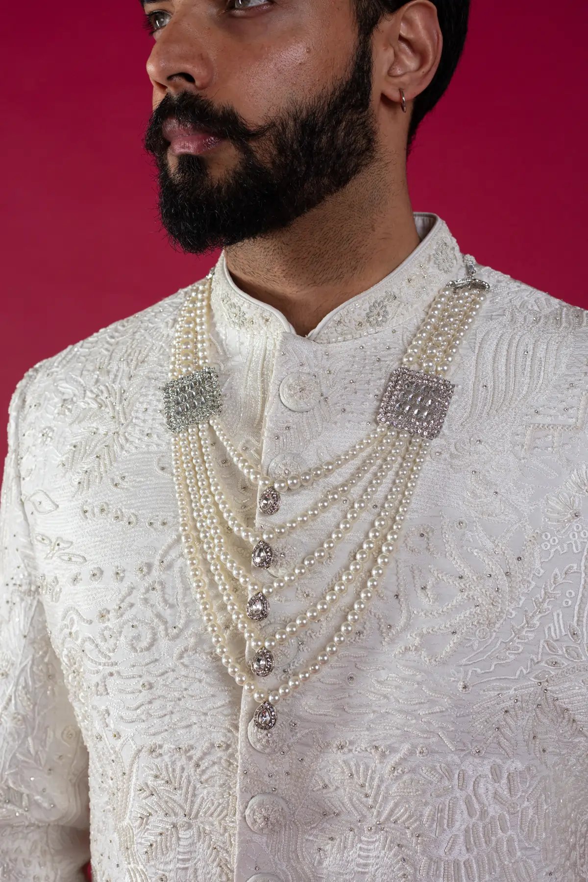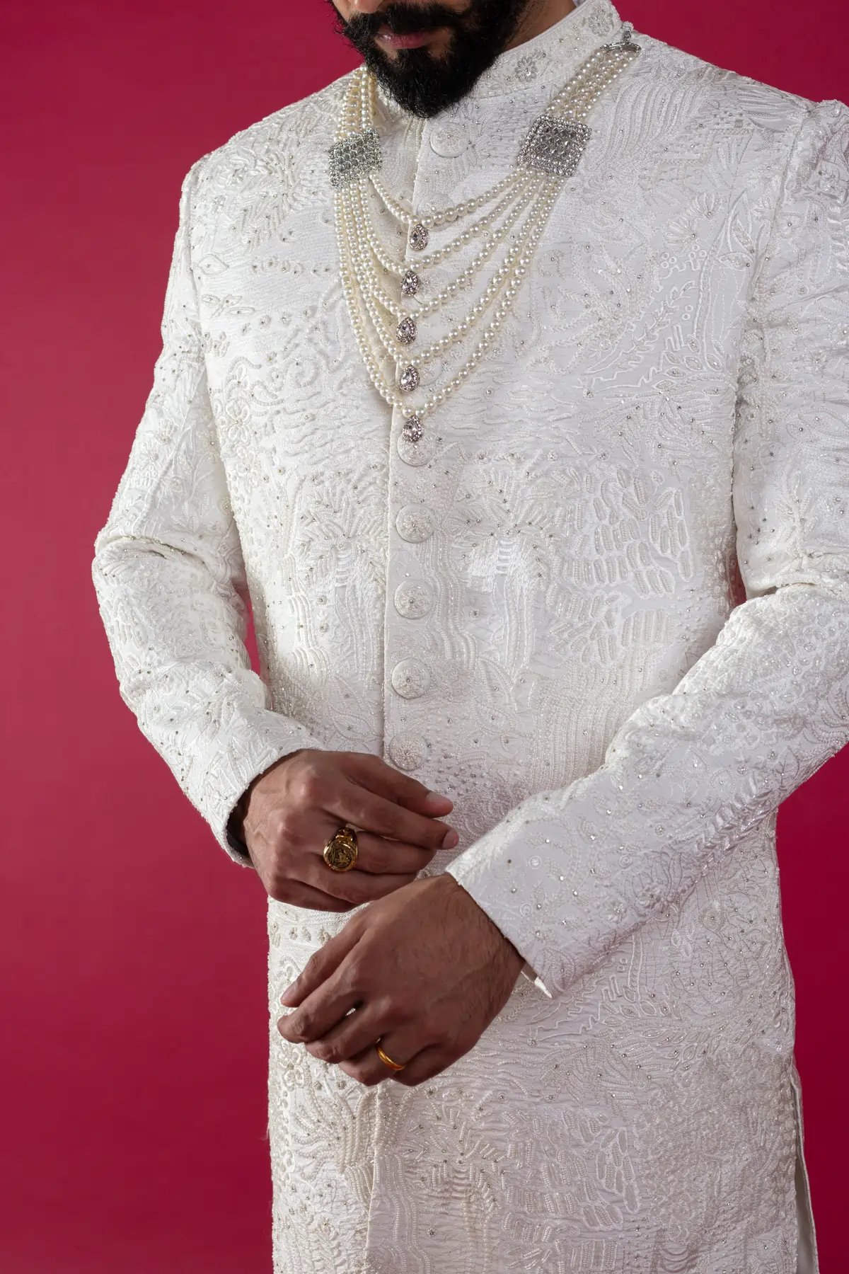 This beautiful men’s sherwani features a long coat all closed up to the collar and below the knee lengthwise. It is designed with beautiful thread-work embroidered detailing all over the front and full length sleeves with scattered diamantes along with detailed button embellishments along the middle, Paired with raw silk trousers to complete the groom look and four layered pearl mala.