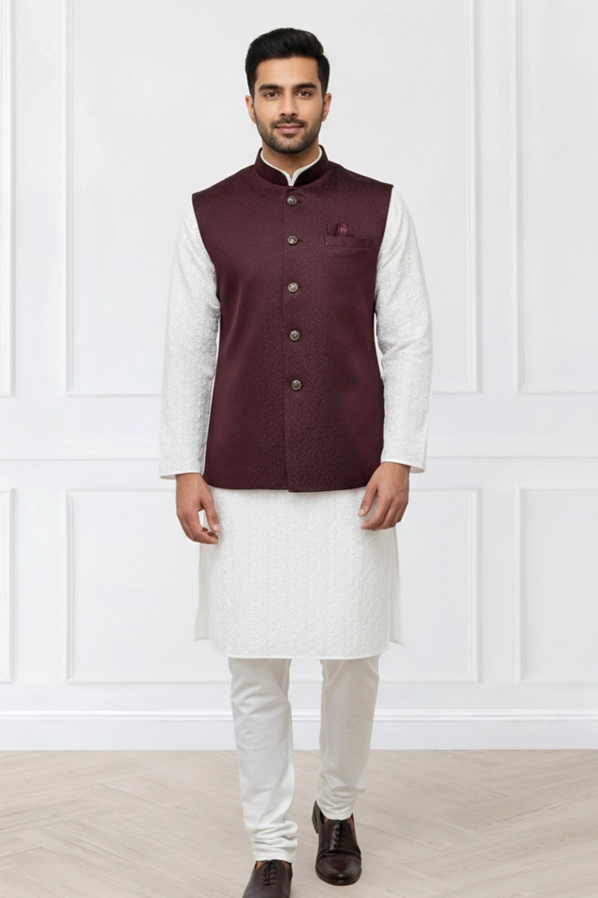 This beautiful waistcoat is crafted from a blend of brocade fabric enhanced by moulded buttons and mandarin collar along with a straight cut that fits easy around the chest and then tapers at the waist creating a broad shoulder-slim waist look. It is perfect for formal occasions as well as layering over basic clothing. Note: Kurta pyjama shown in the picture is not included.