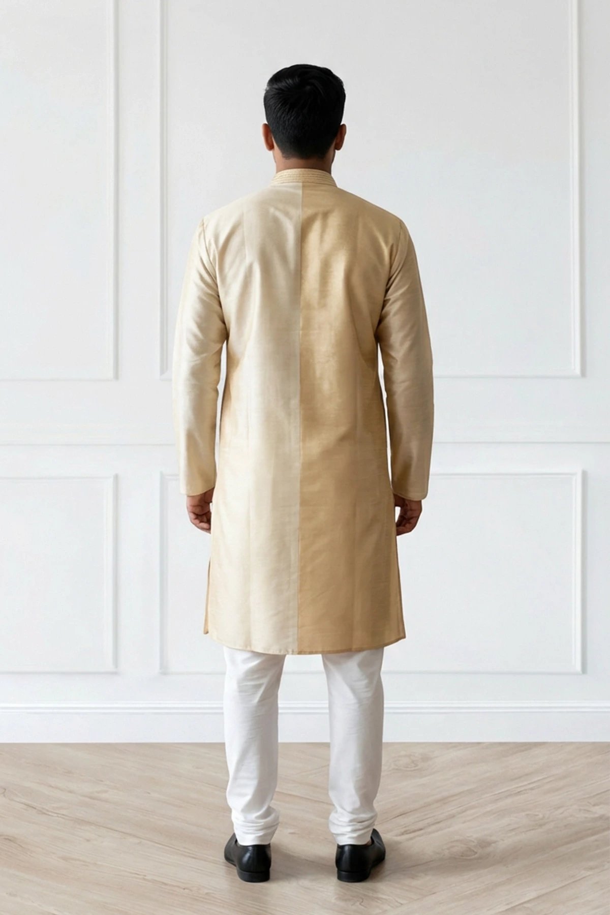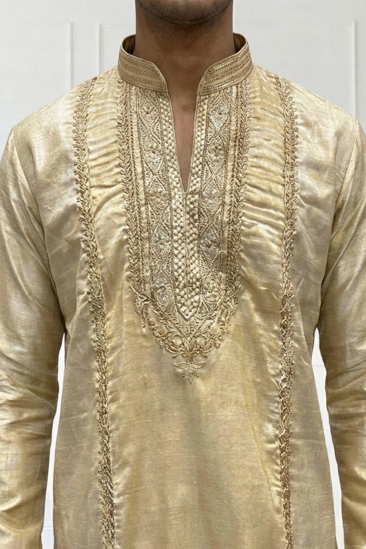 Elevate traditional style with this premium kurta set, Crafted from a lustrous silk-blend fabric, the kurta features intricate hand‑inspired embroidery along the neckline and placket, adding refined detail without overwhelming the look. The high collar and tailored long sleeves create a sharp, structured silhouette suitable for weddings, festive events, and formal gatherings. The look is finished with straight leg cotton silk trousers.